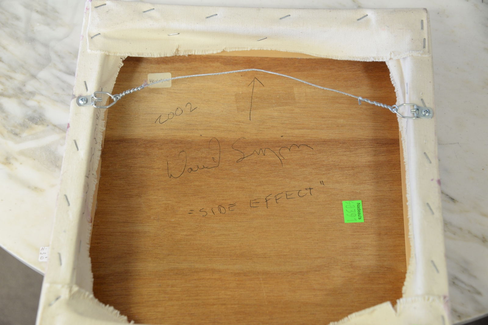 David Simpson 1928 oil on canvas Side Effect signed on back and side of canvas David Simpson 2002. 12 x 12