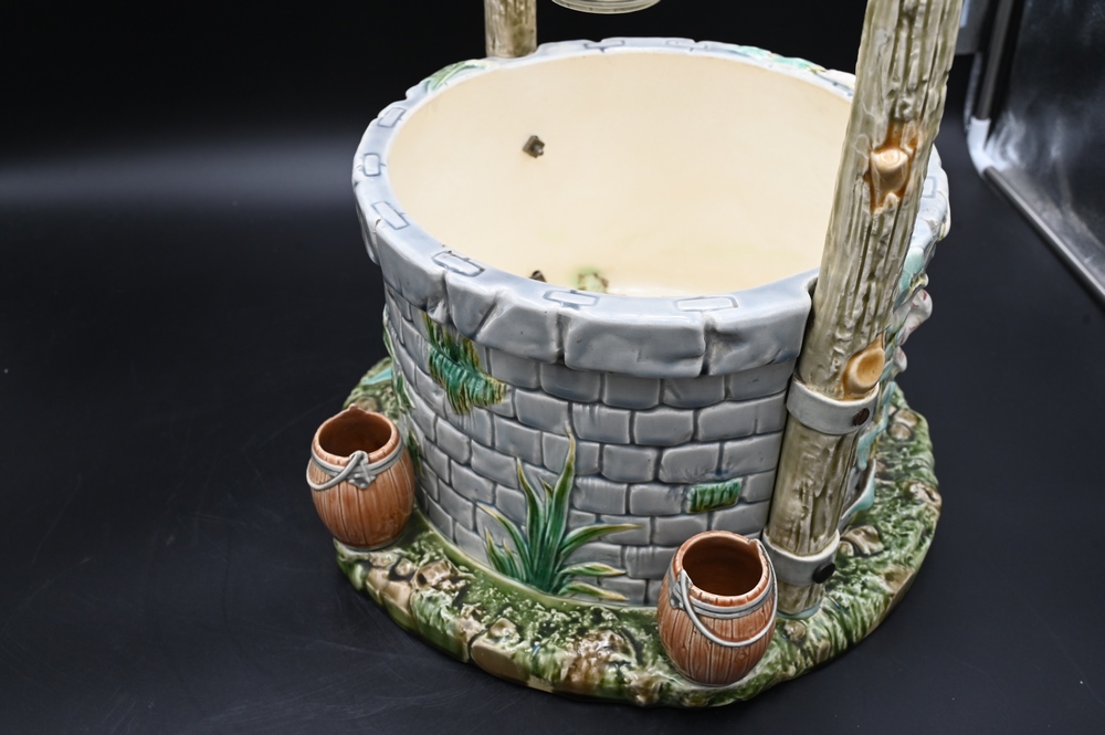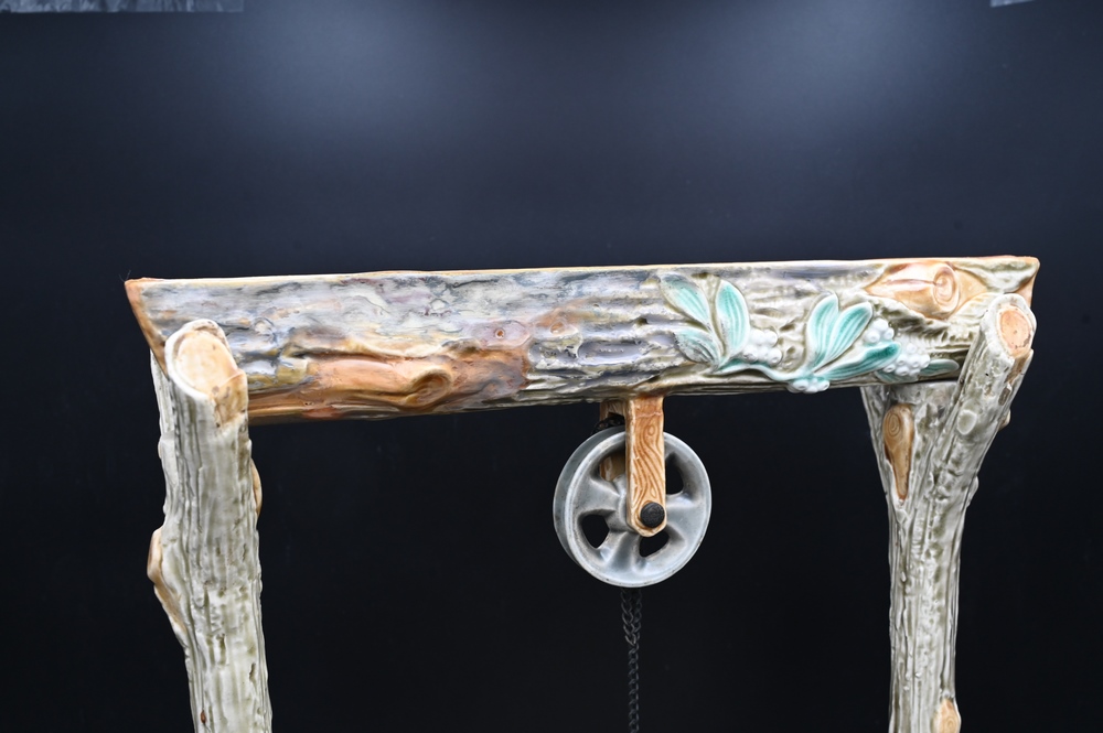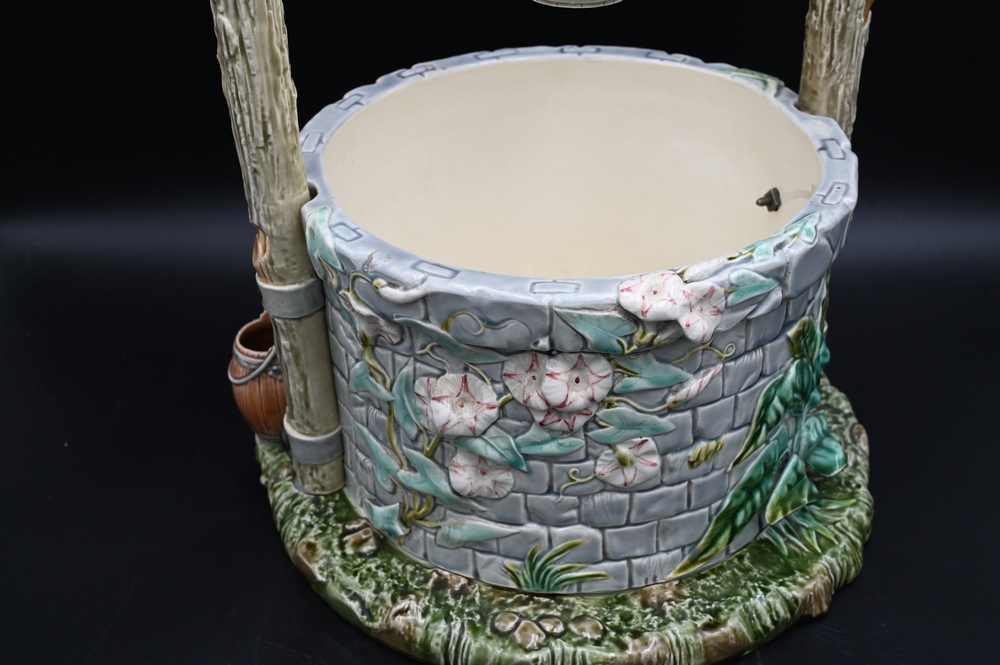 Hautin & Boulenger Choisy Le Roi Faience Majolica Three Part Well, painted and decorated with molded grass and leaf, log form cross member with wheel holding buck on a chain, supported by two three form branches over large well on round base with barrels, top log professionally, repaired, height 26 inches, width 14 1/2 inches.