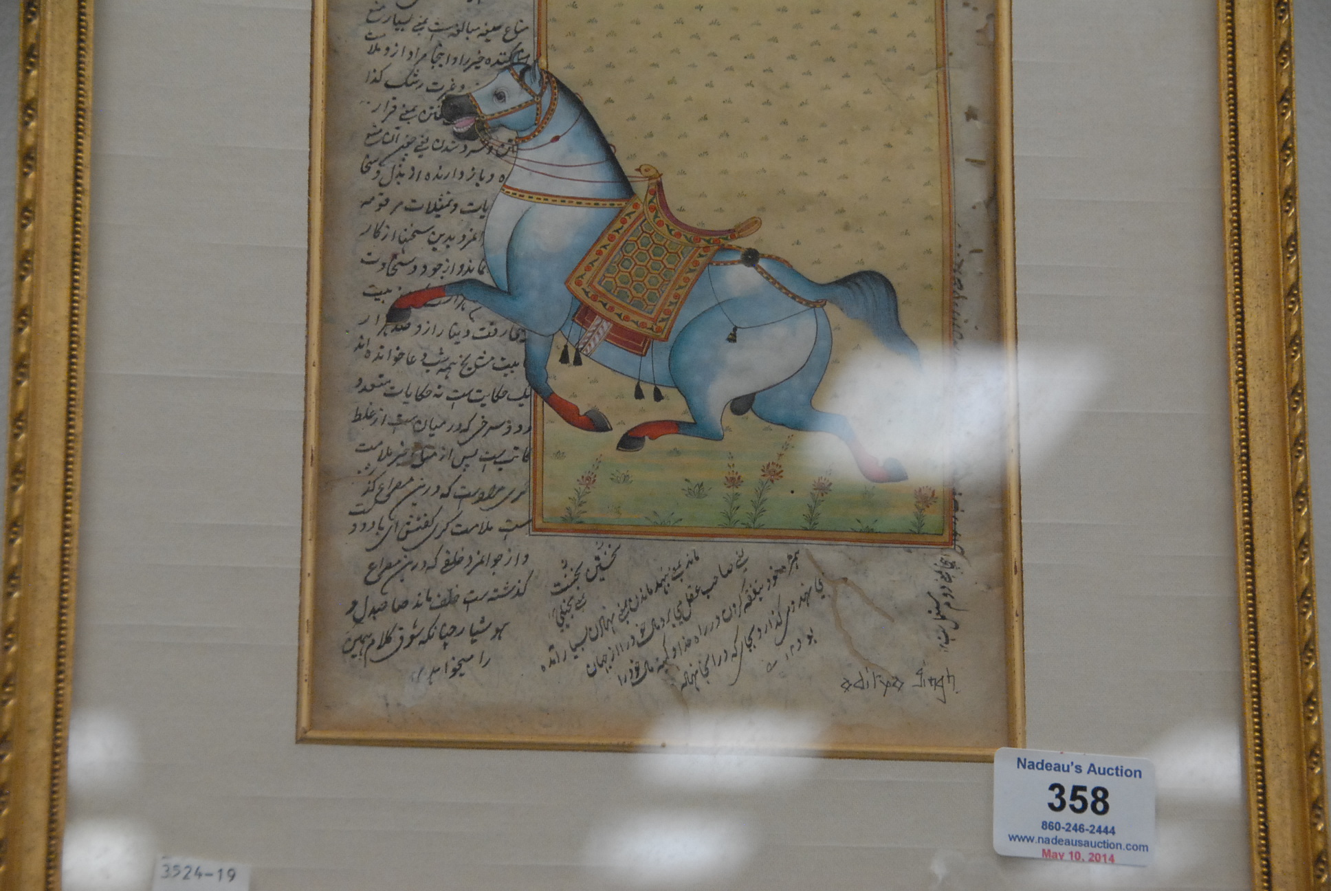 Lot 358: A fine illuminated manuscript page of a leaping horse, polychrome and gilt decorated, man cut out, signed lower right, Wildwood Gallery