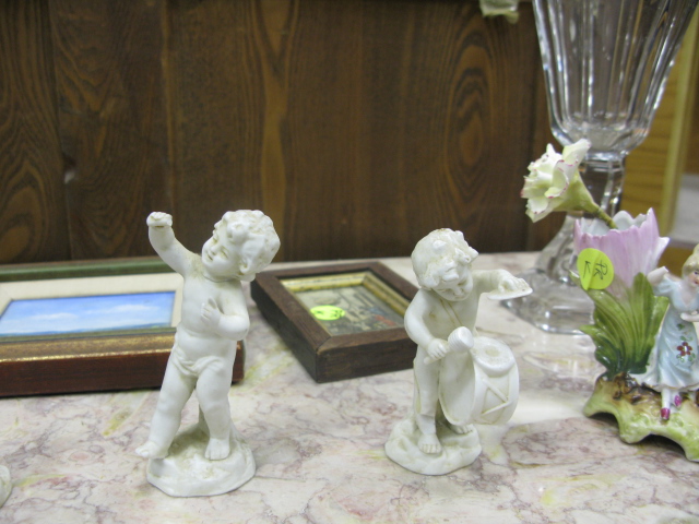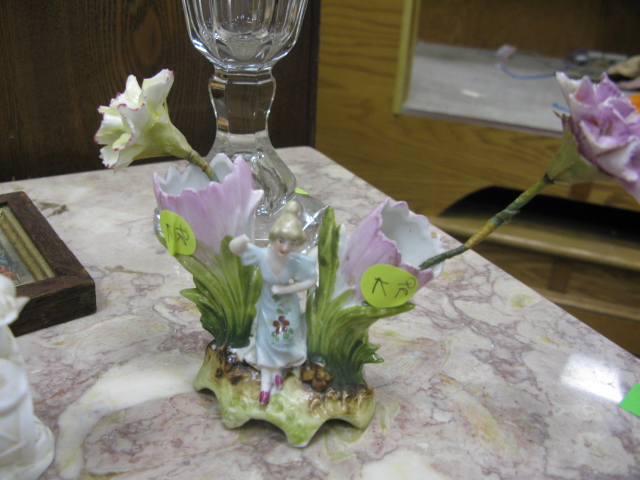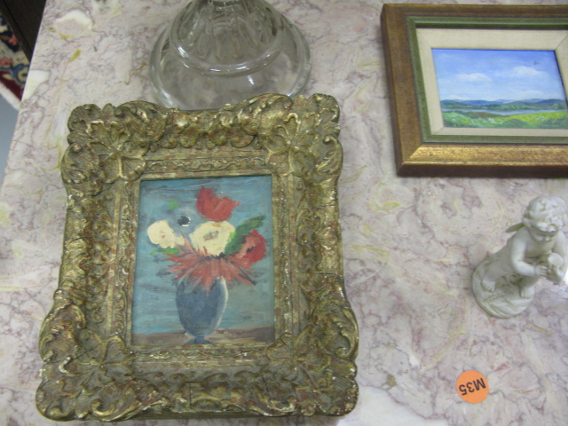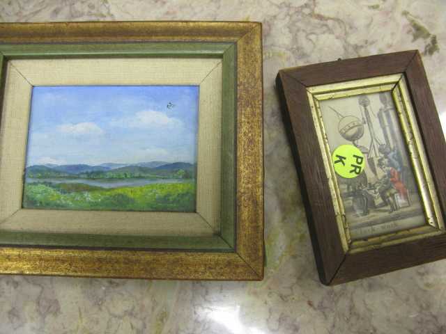 A group lot to include two oil lamps, electrified,box lot with two miniature paintings, including a miniature print Clockwork and a porcelain vase.