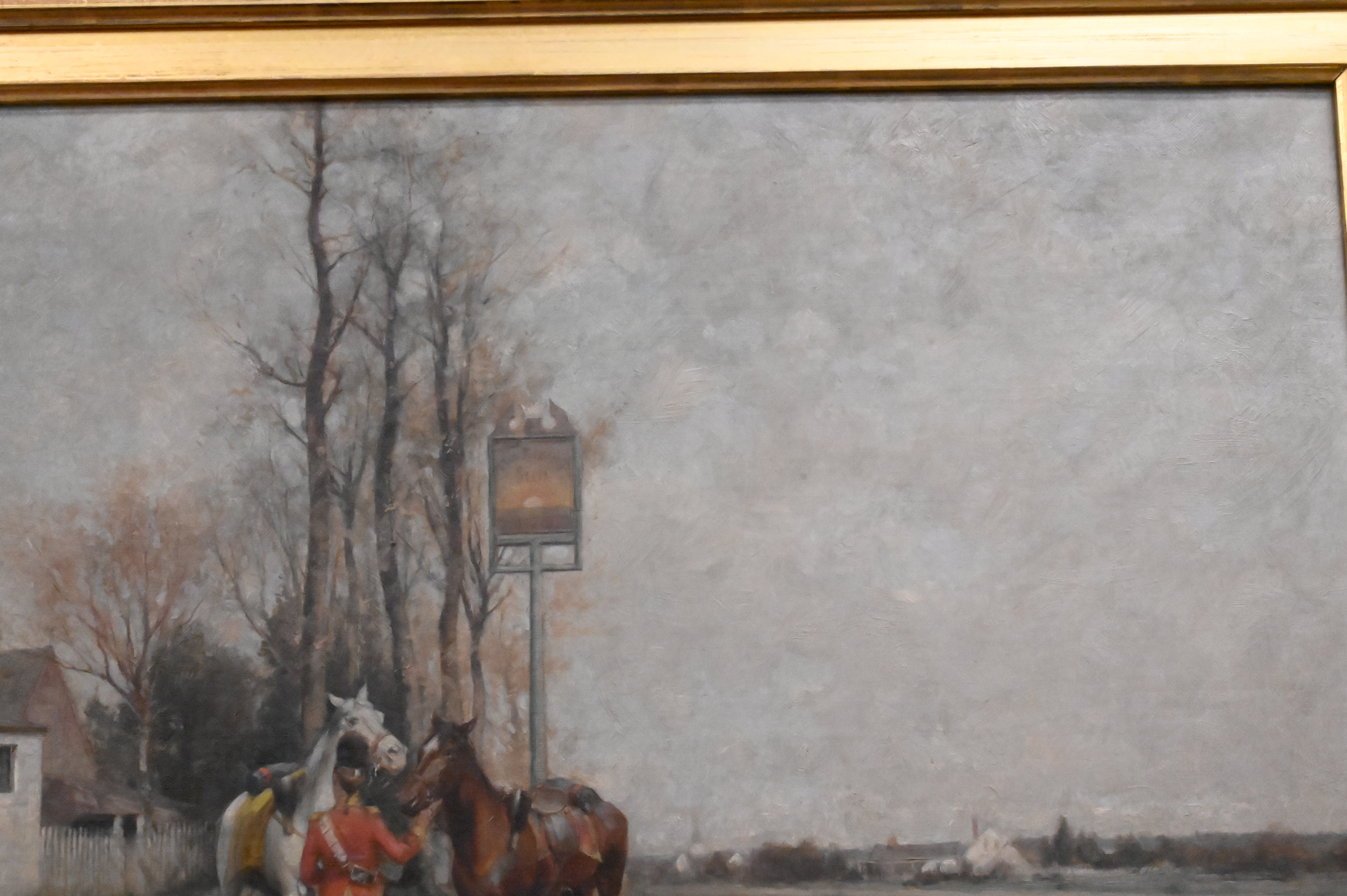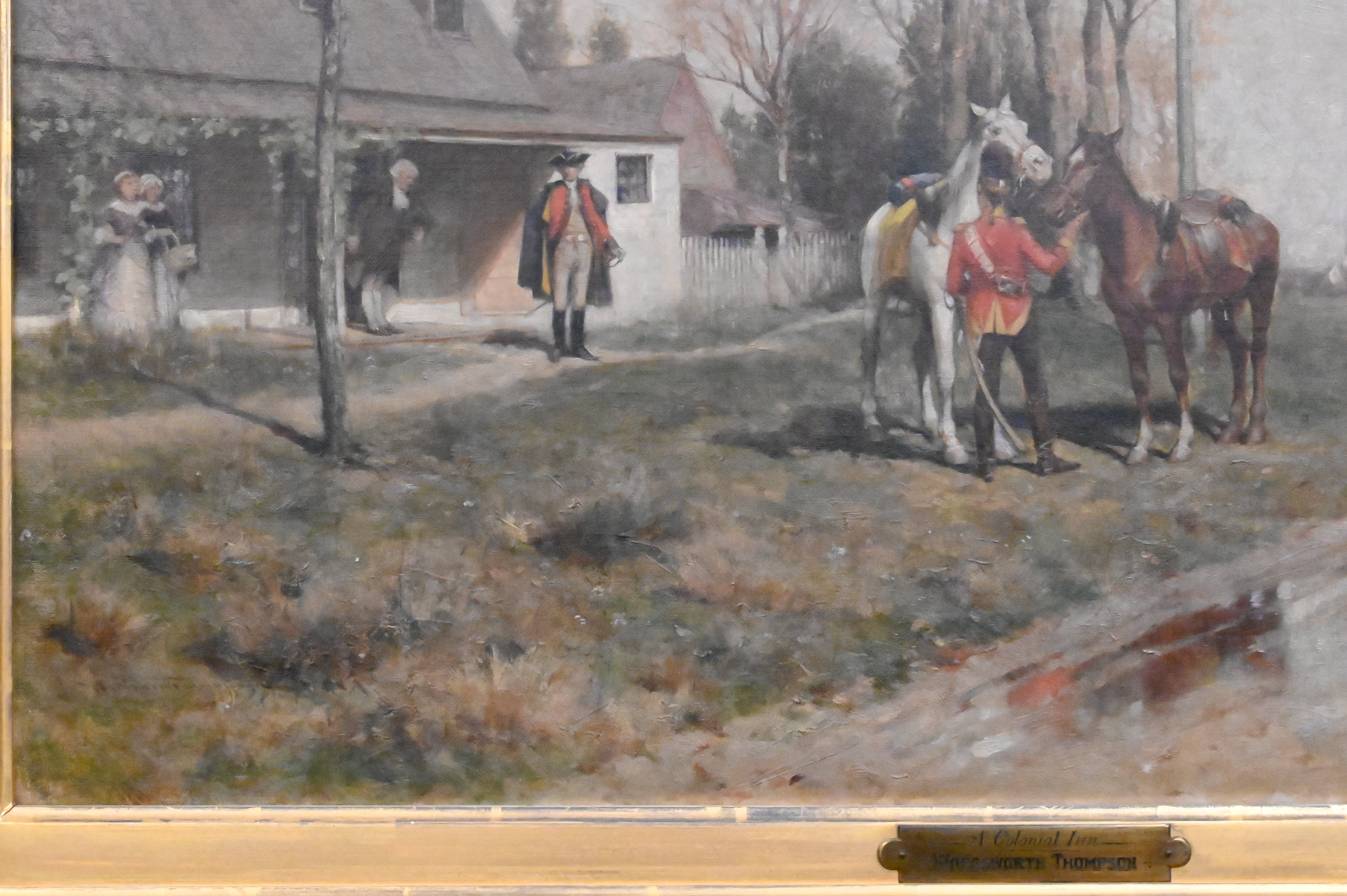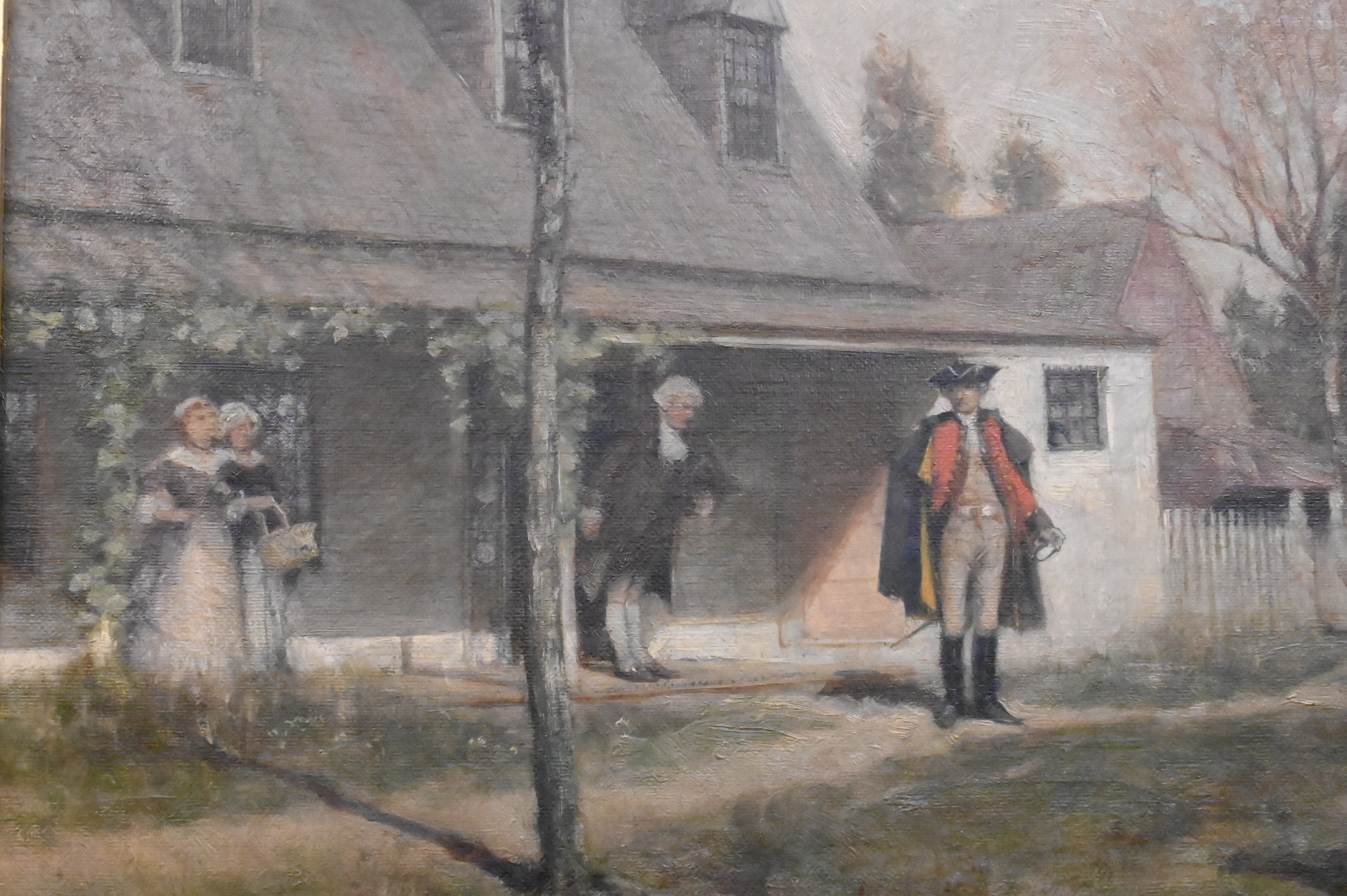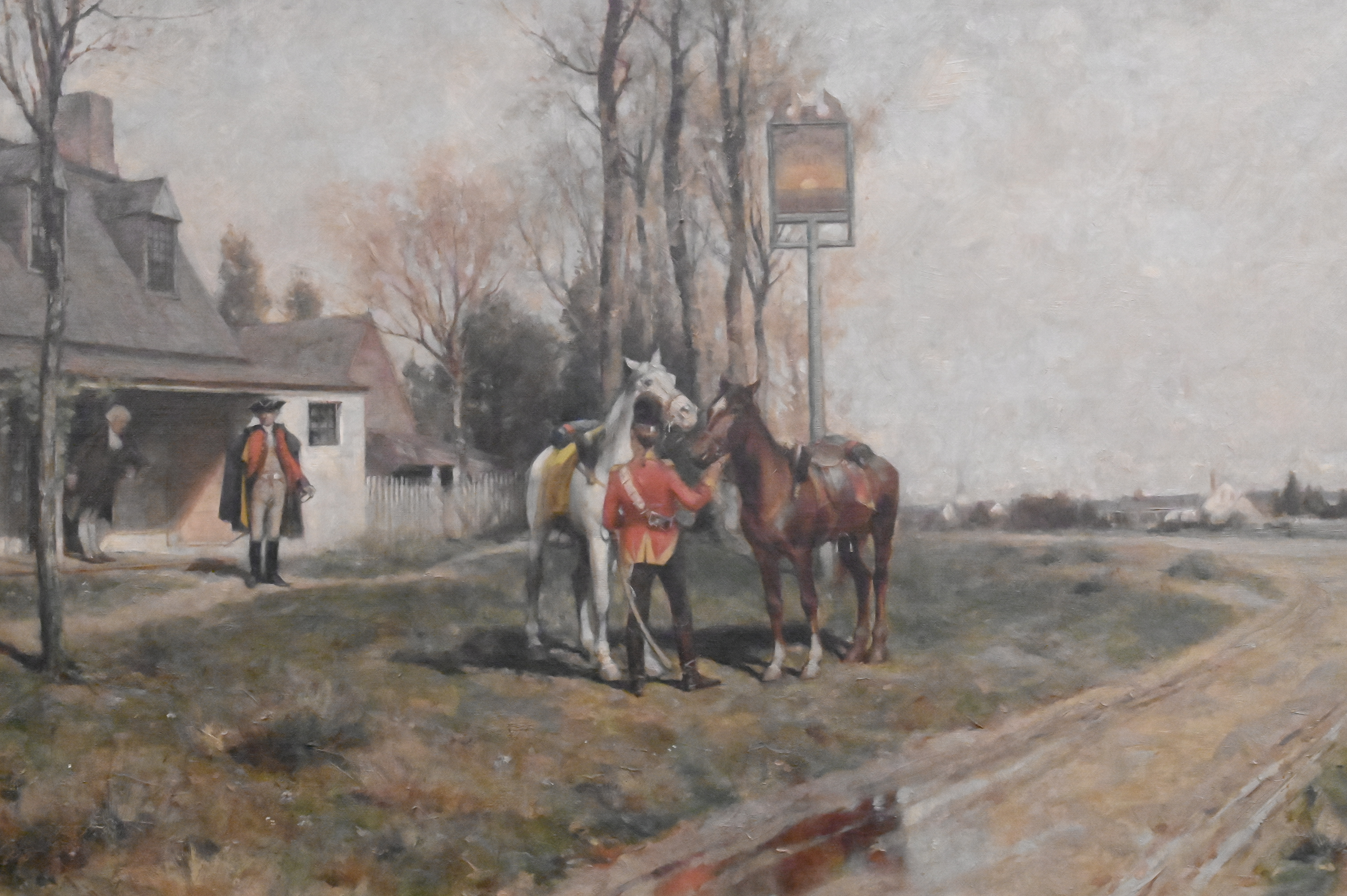 “Washington and The Colonial Inn” depicting the Rising Sun Tavern located in Fredericksburg, Virginia with George Washington preparing to be sent off with aides-de-camp, Alexander Hamilton, holding Washington’s horse about to mount