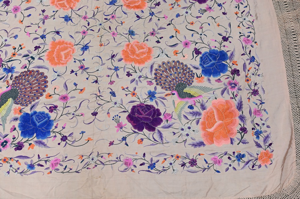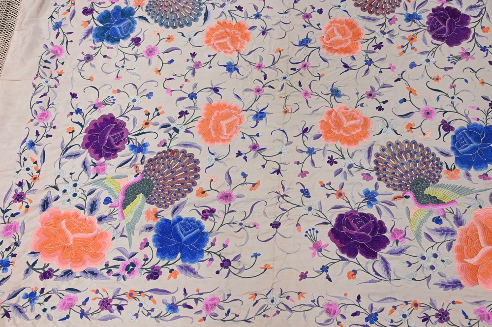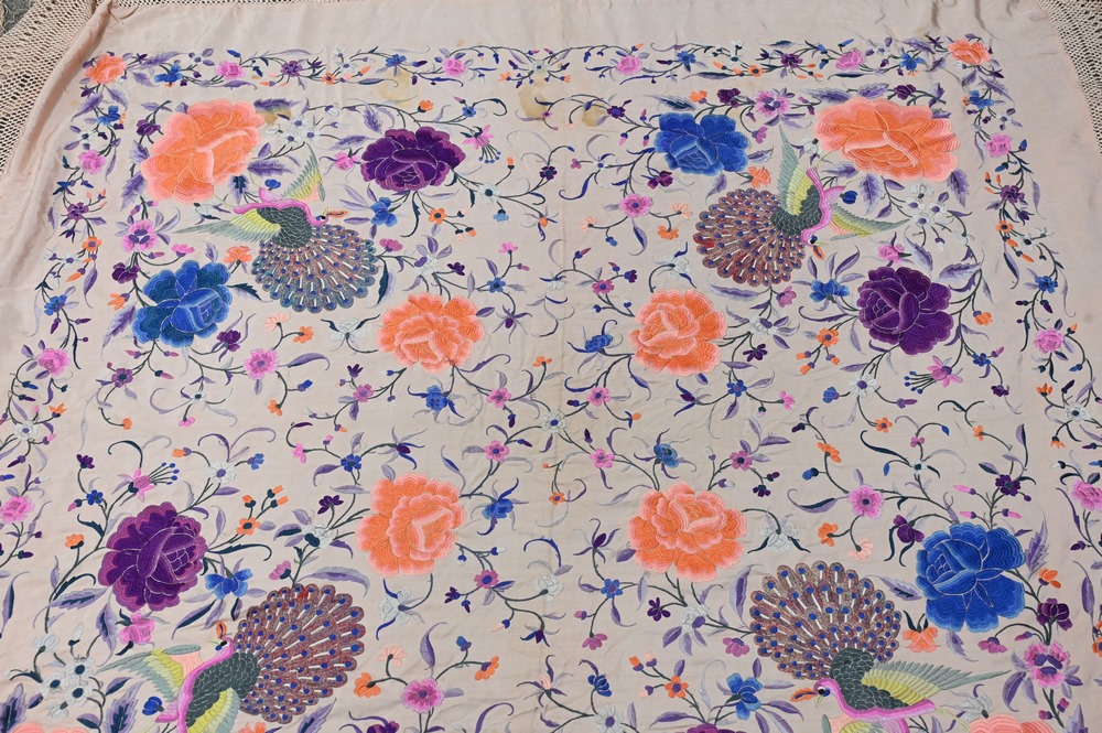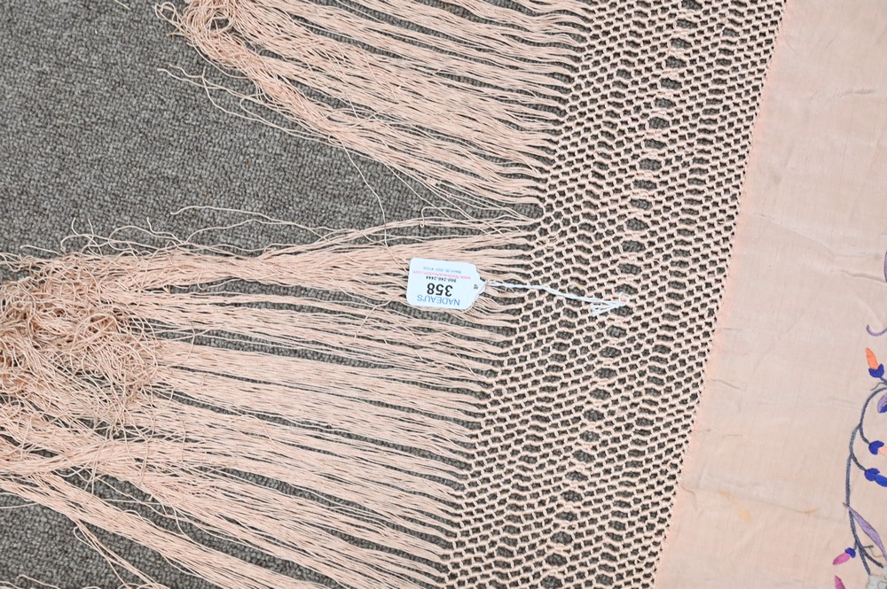Lot 358: Chinese Silk Embroidered Piano Shawl, having embroidered peacocks and colorful flowers on pink ground, approximately 5′ x 5′.
