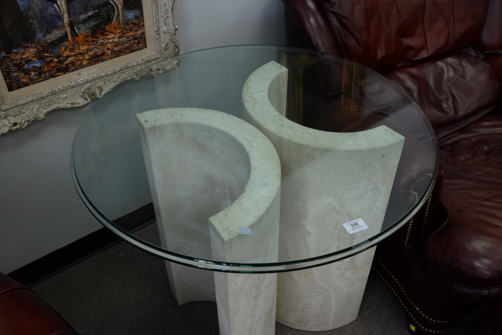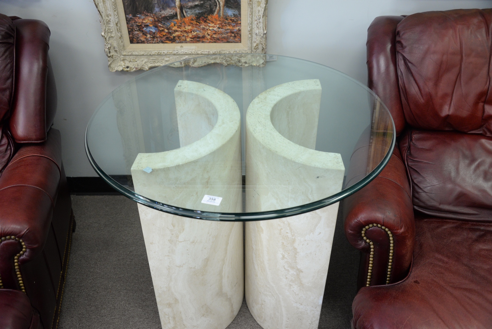 Contemporary Round Glass Top Table on two part base, height 29 inches, diameter 32 inches.