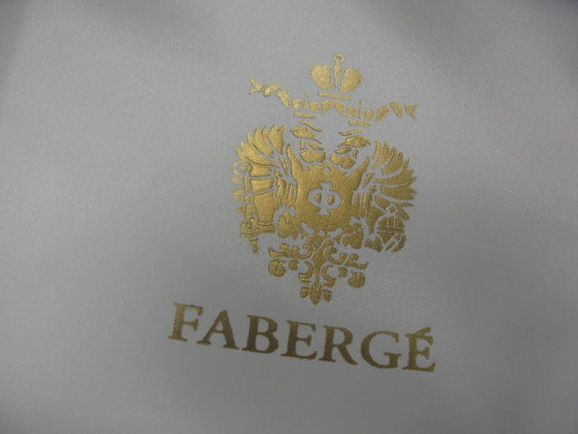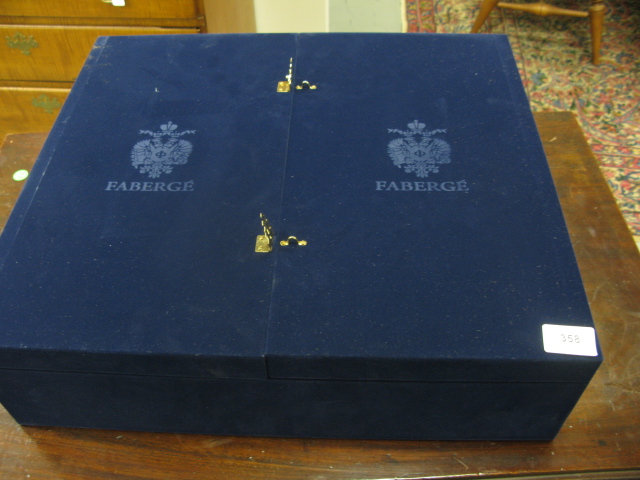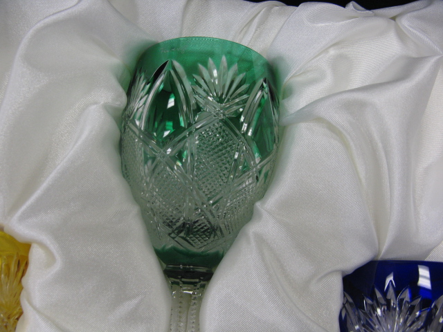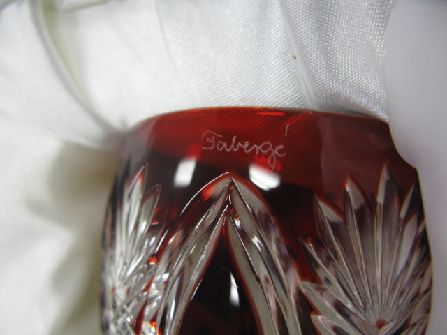 Faberge set of 4 stems: red, blue, green, and yellow cut to clear, in fitted box.