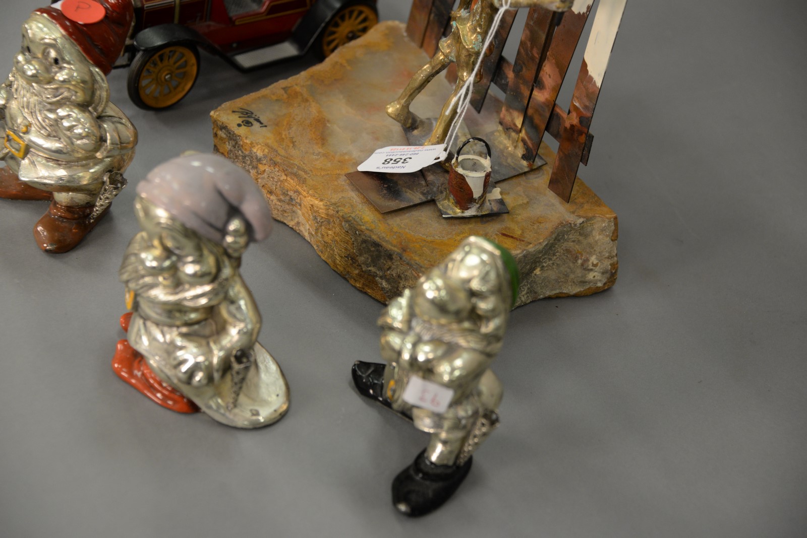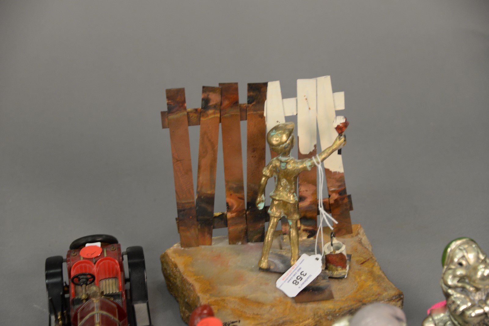 Lot 358: Five piece lot including bronze boy painting a fence signed illegibly, Shucco wind-up car, and three of the Seven Dwarfs.boy: ht….