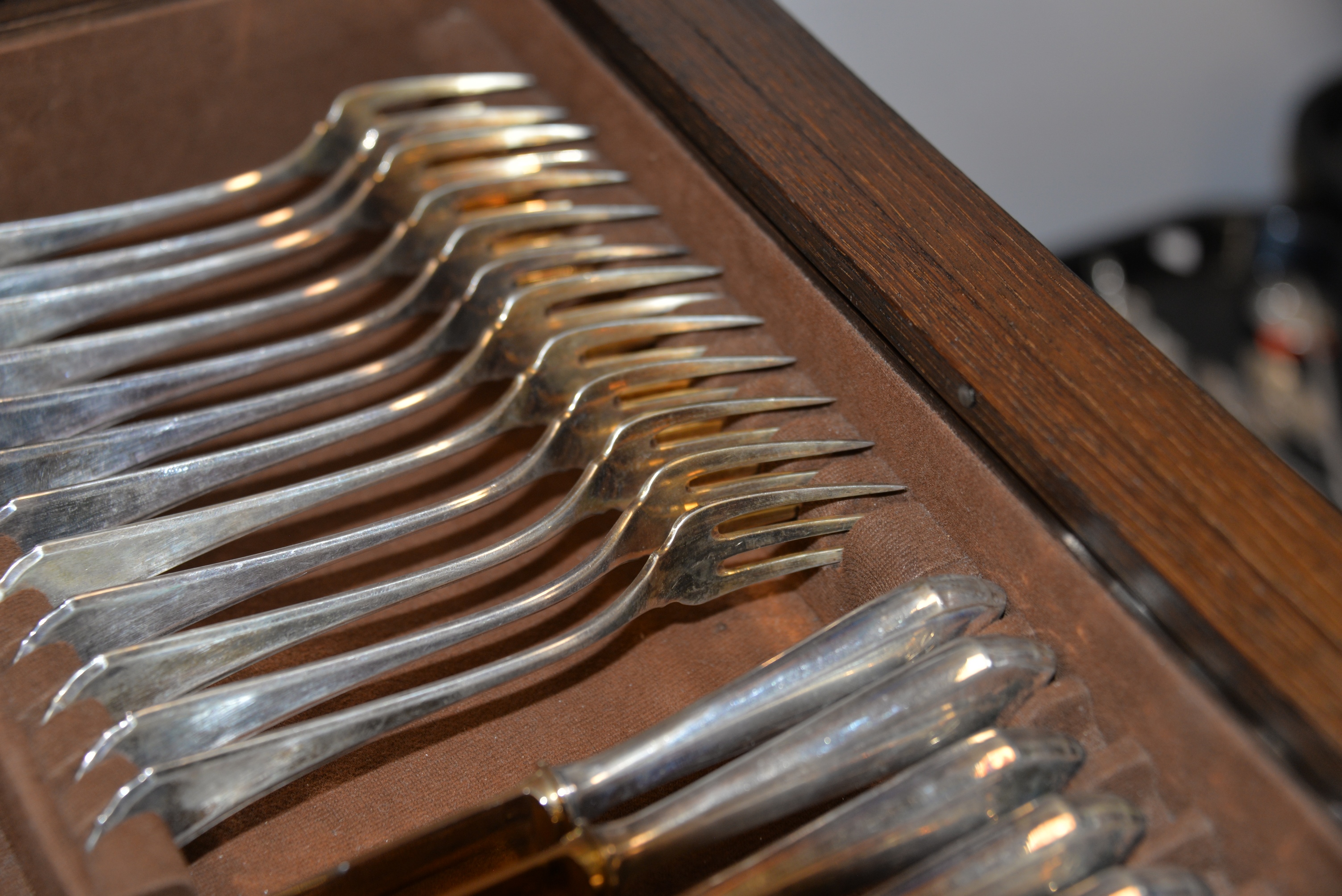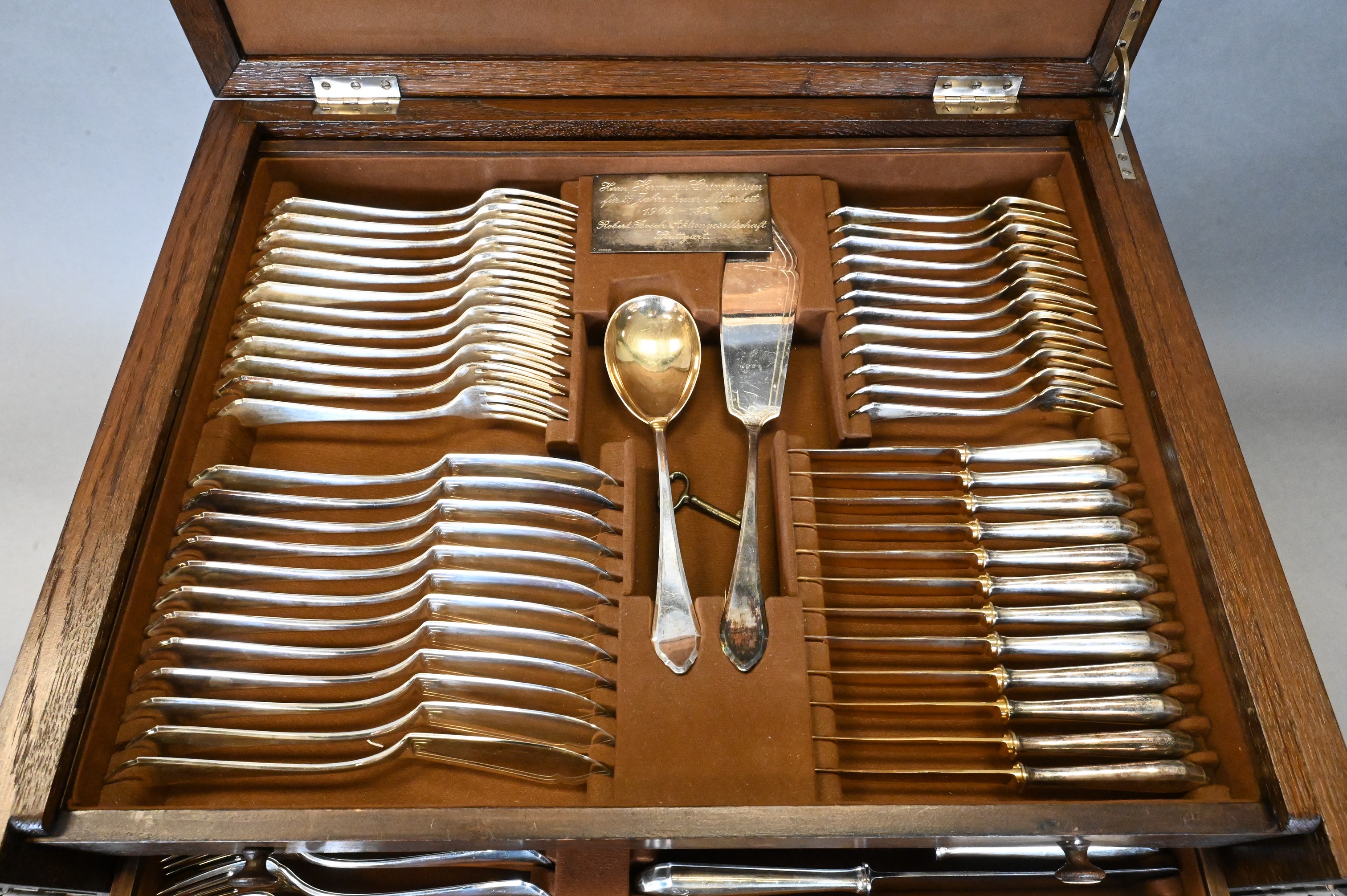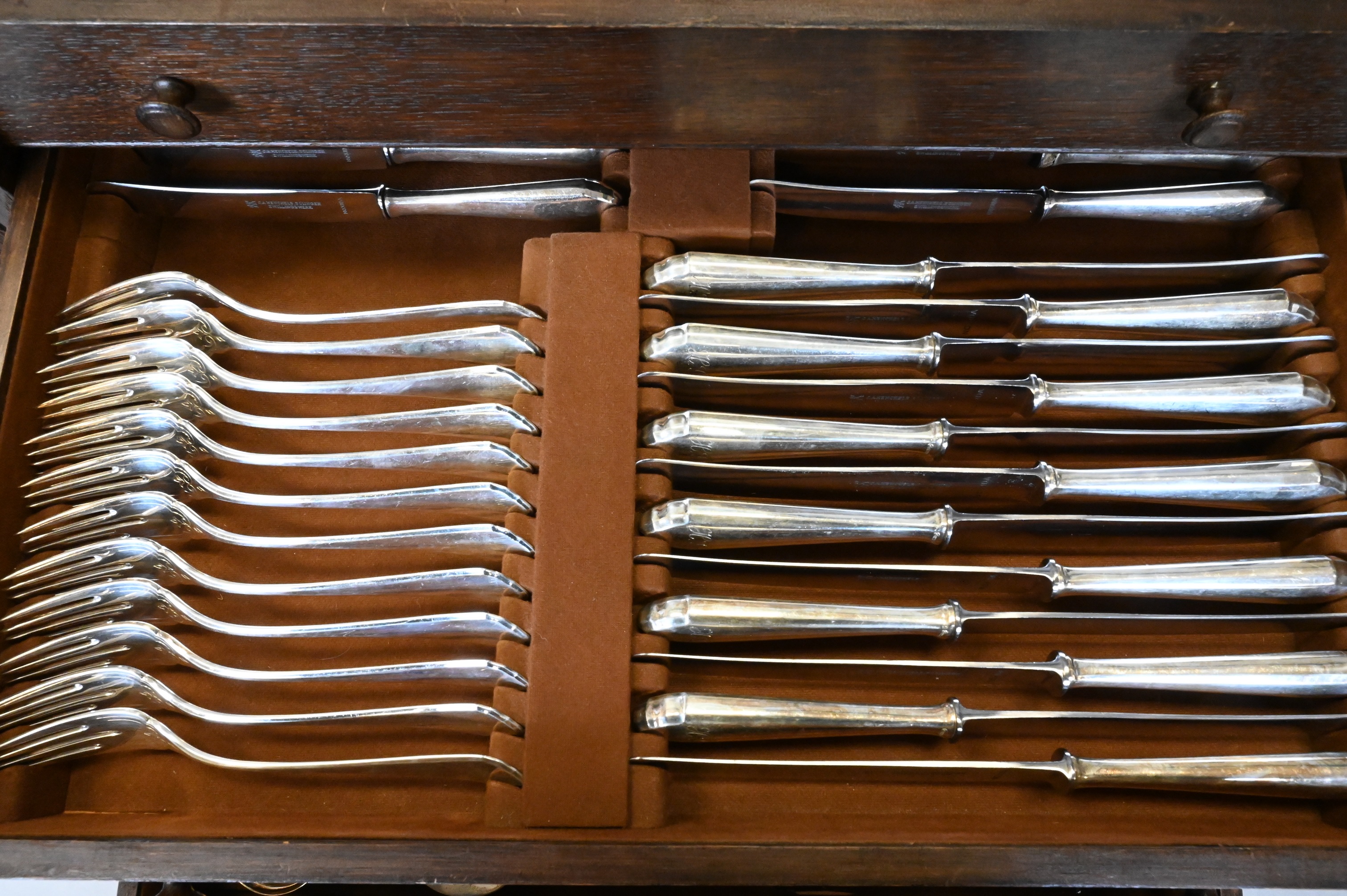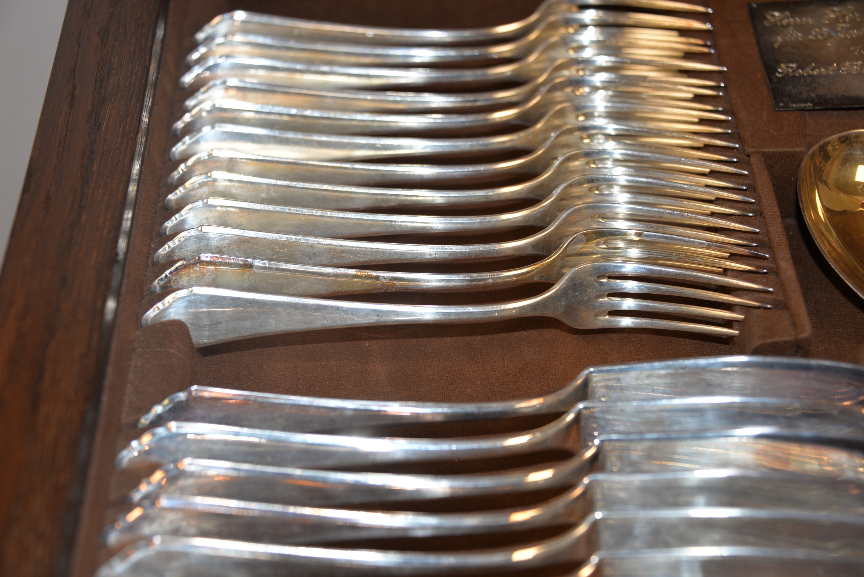 to include 12 dinner forks, 12 luncheon forks, 12 salad forks, 12 custard forks, 12 tablespoons, 12 teaspoons, 12 dessert spoons, 12 demitasse spoons, 12 dinner knives, 12 luncheon knives, 12 butter knives, 12 fish knives, 27 additional serving pieces along with key and 1.3 t.oz. 800 silver plaque