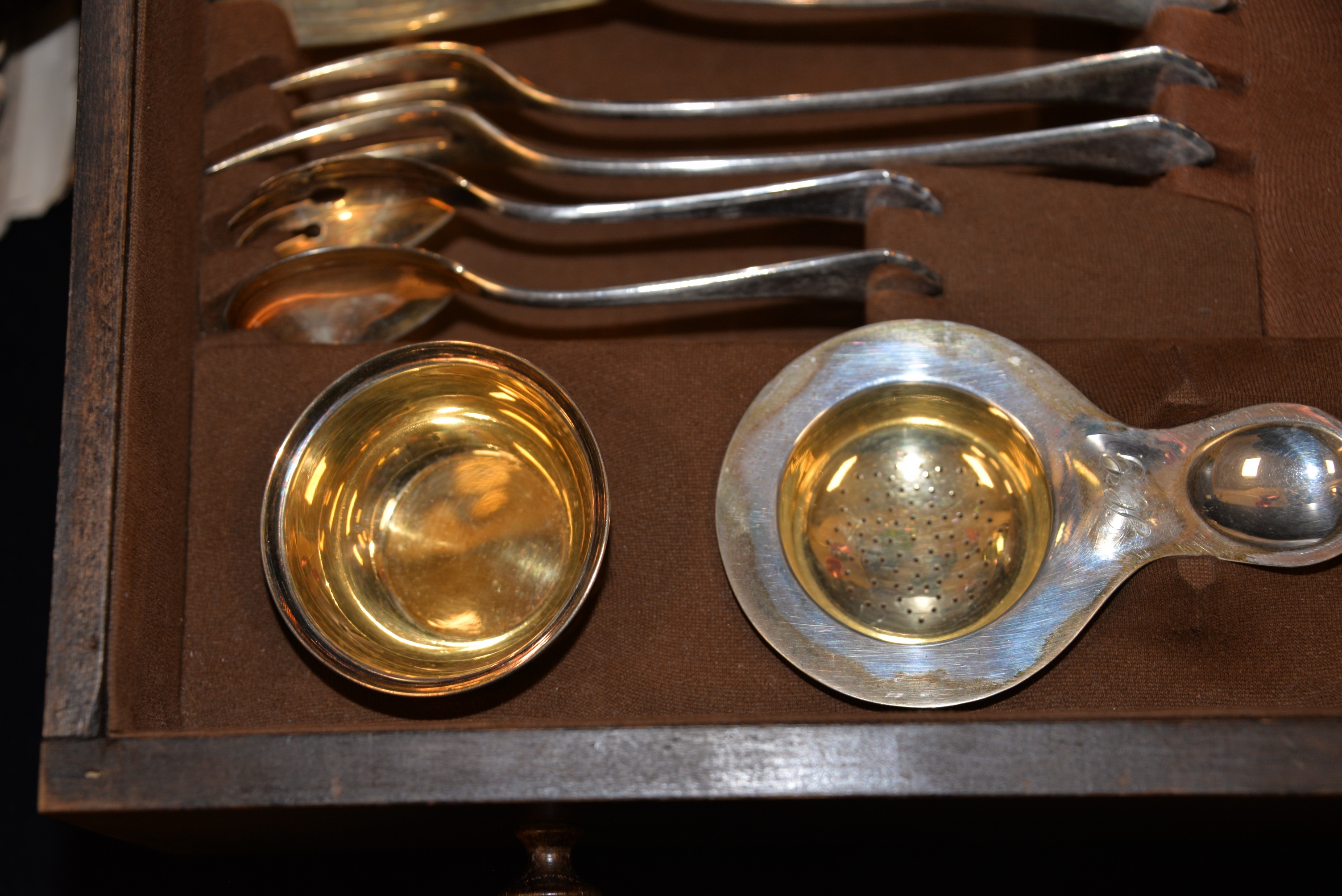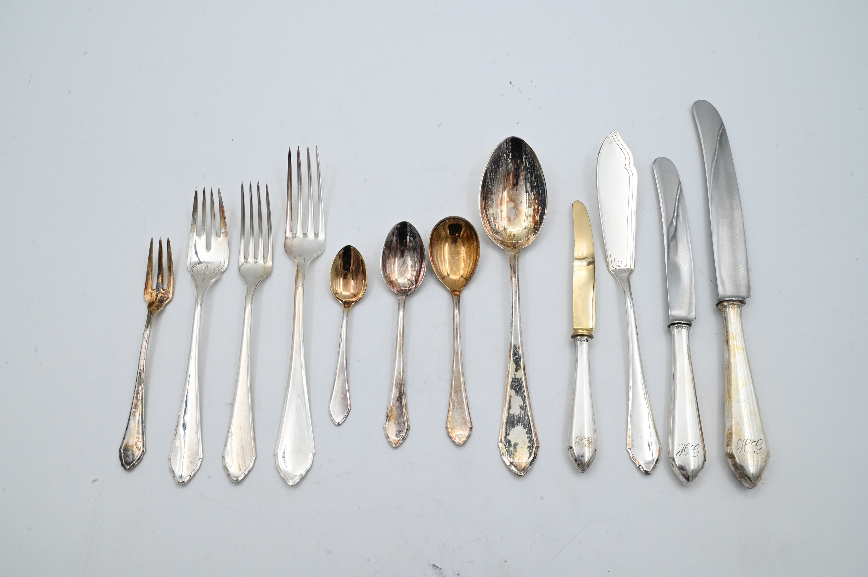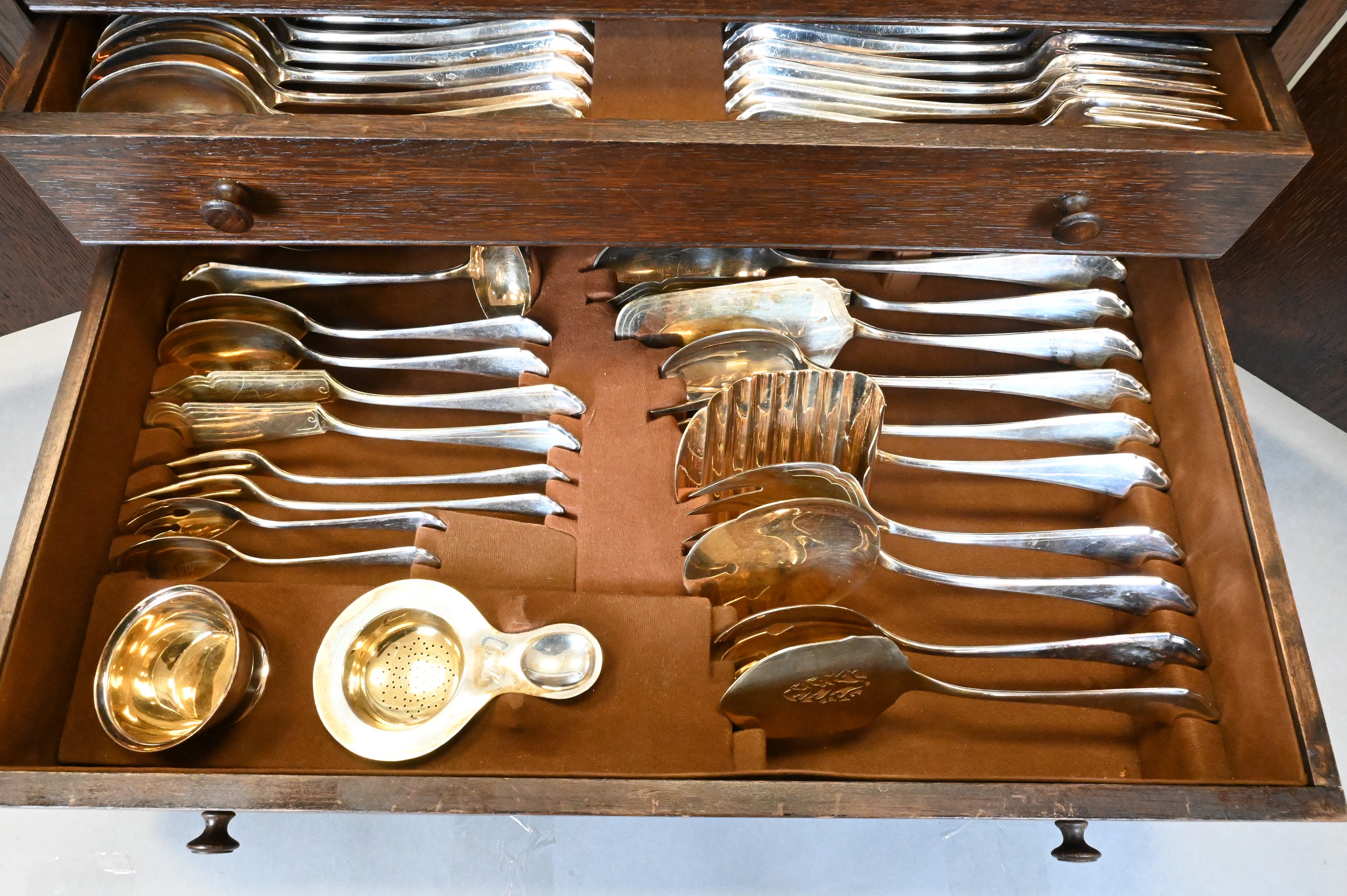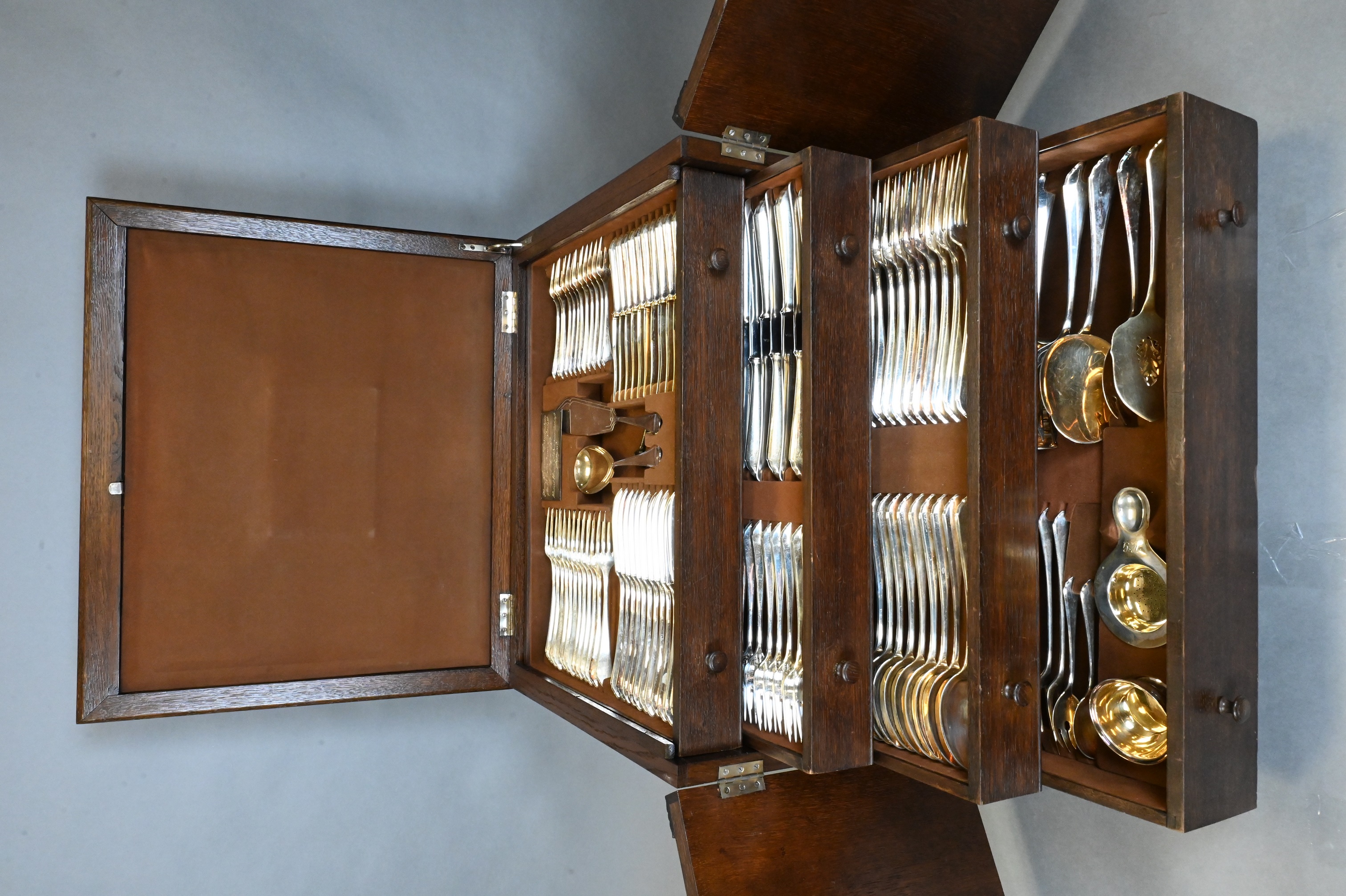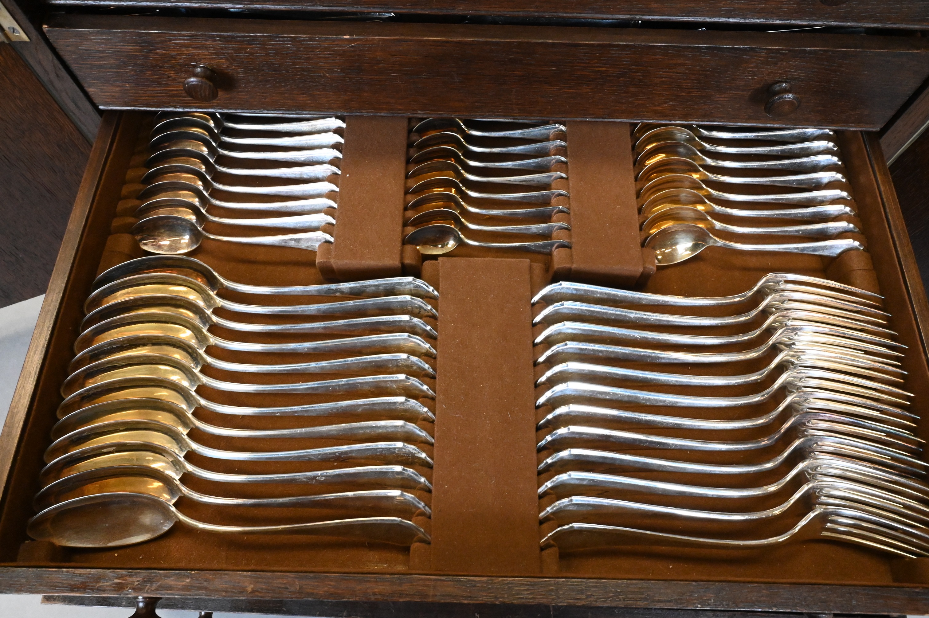 to include 12 dinner forks, 12 luncheon forks, 12 salad forks, 12 custard forks, 12 tablespoons, 12 teaspoons, 12 dessert spoons, 12 demitasse spoons, 12 dinner knives, 12 luncheon knives, 12 butter knives, 12 fish knives, 27 additional serving pieces along with key and 1.3 t.oz. 800 silver plaque