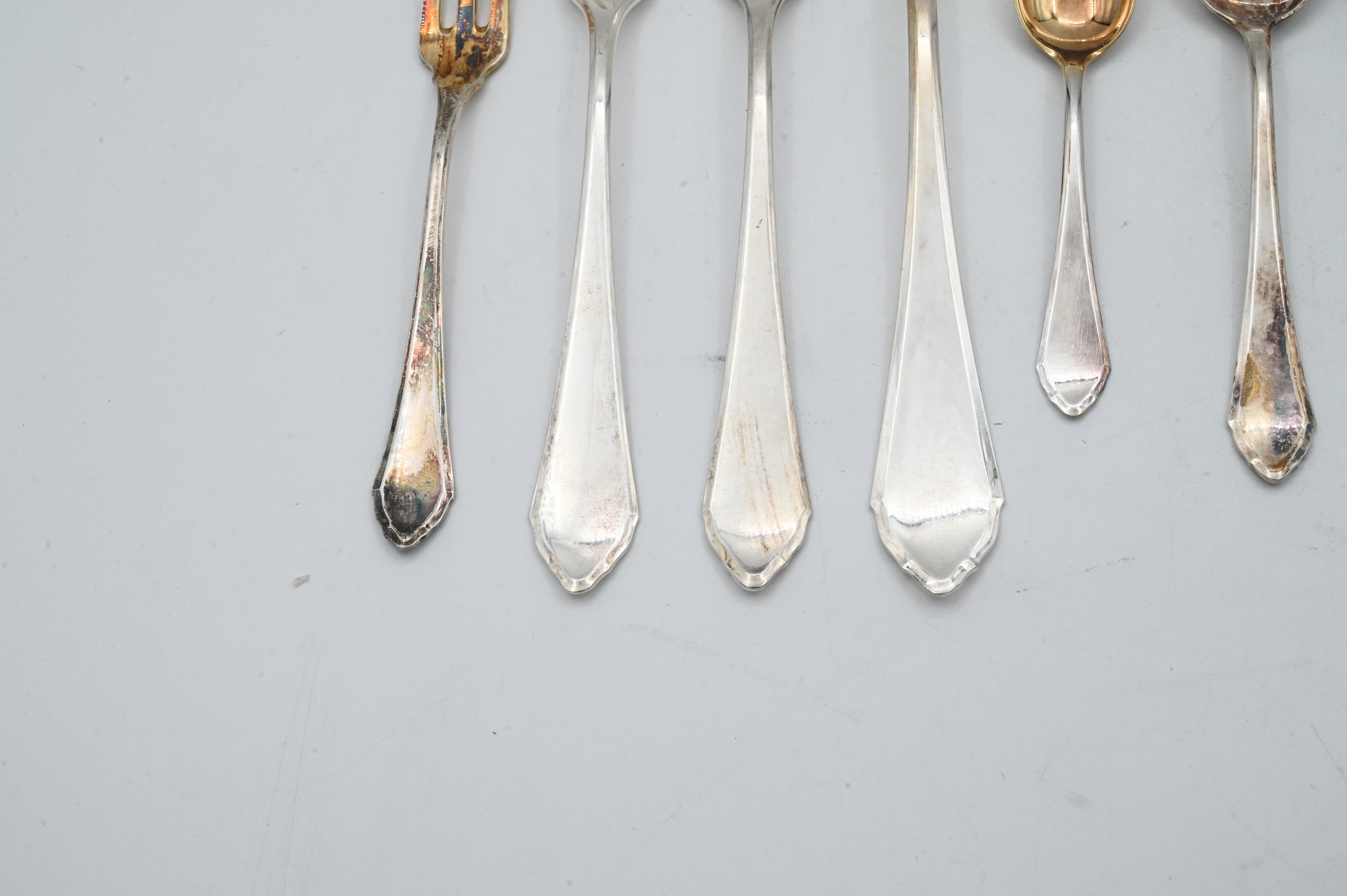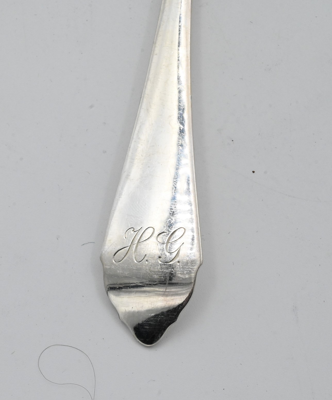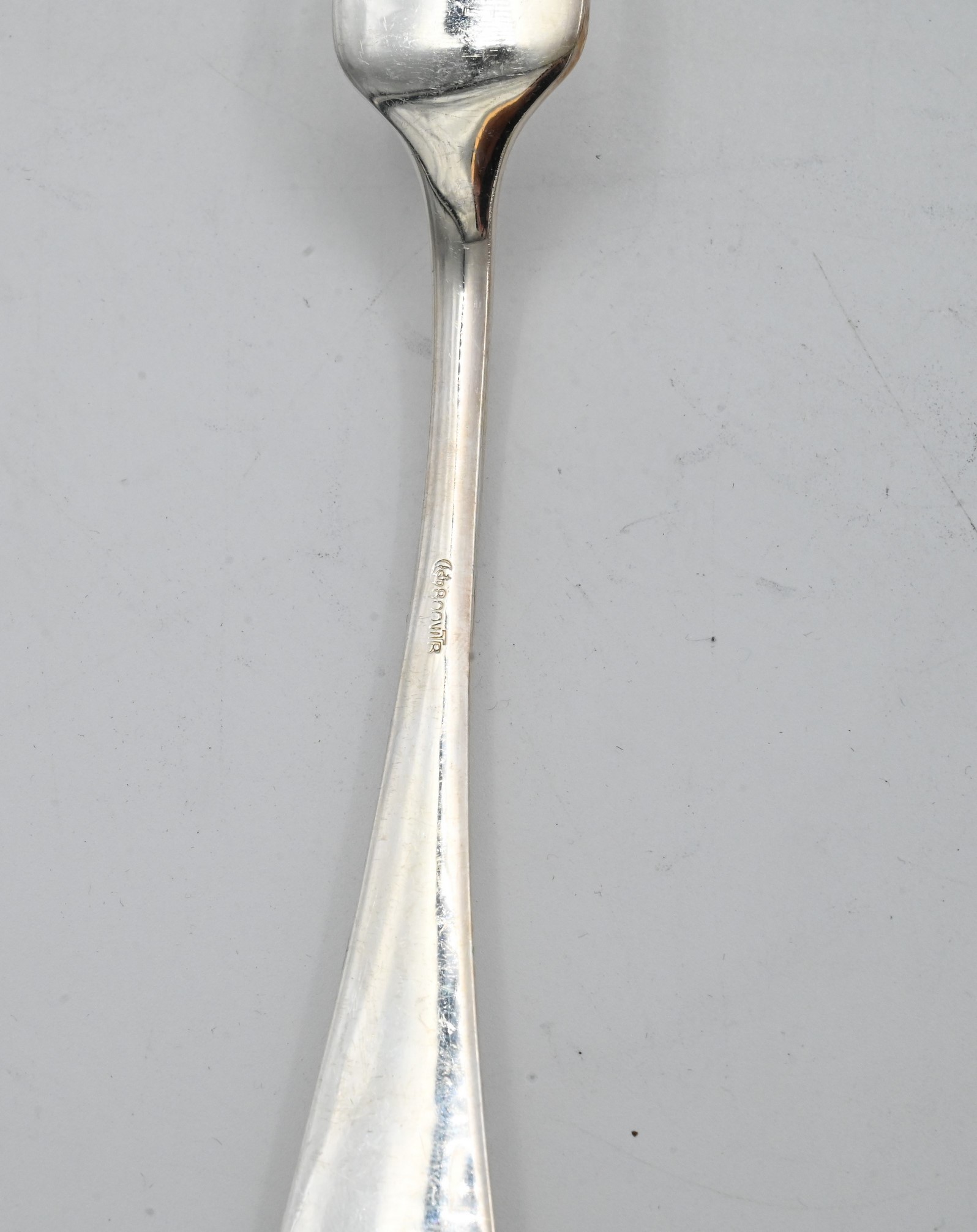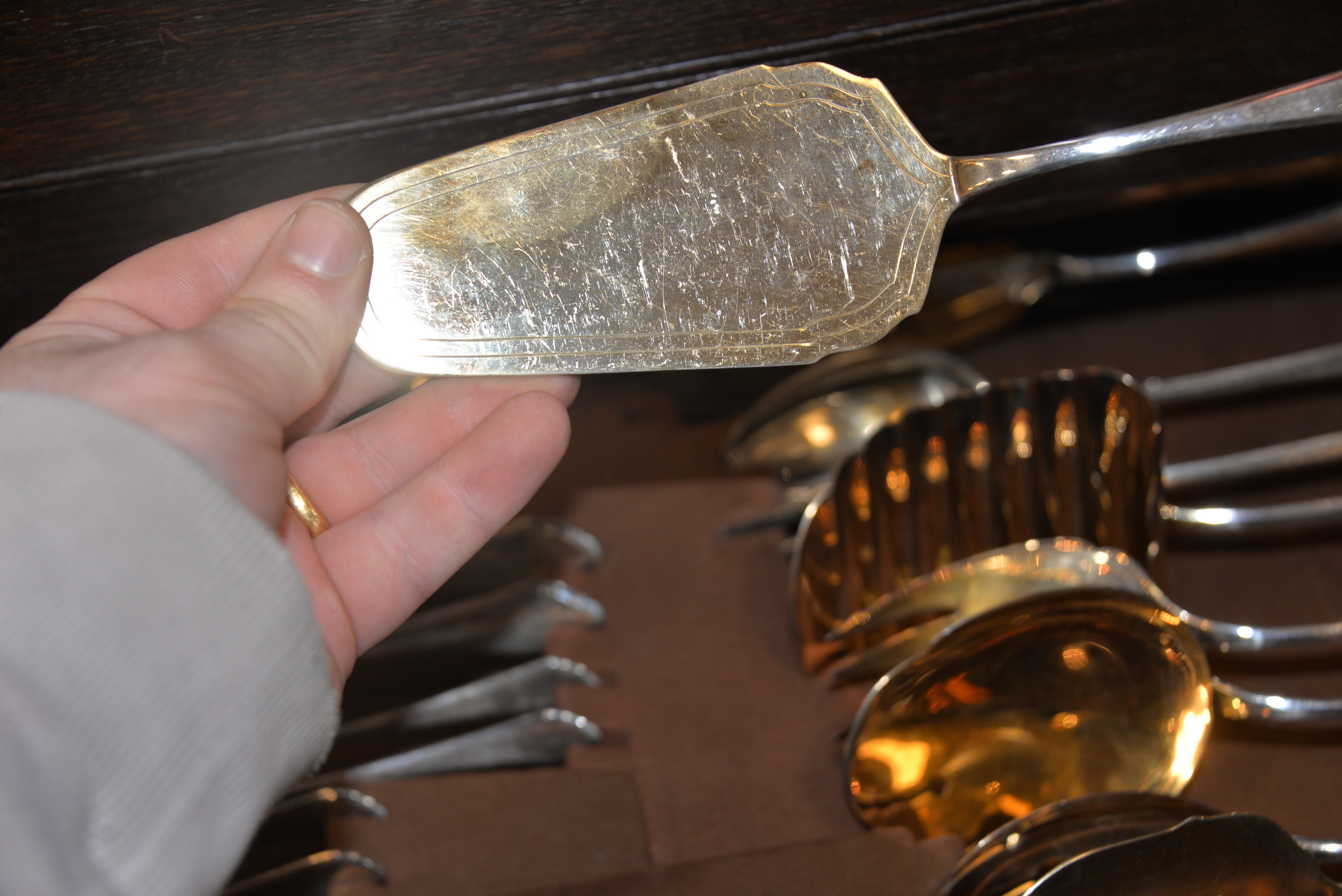 to include 12 dinner forks, 12 luncheon forks, 12 salad forks, 12 custard forks, 12 tablespoons, 12 teaspoons, 12 dessert spoons, 12 demitasse spoons, 12 dinner knives, 12 luncheon knives, 12 butter knives, 12 fish knives, 27 additional serving pieces along with key and 1.3 t.oz. 800 silver plaque