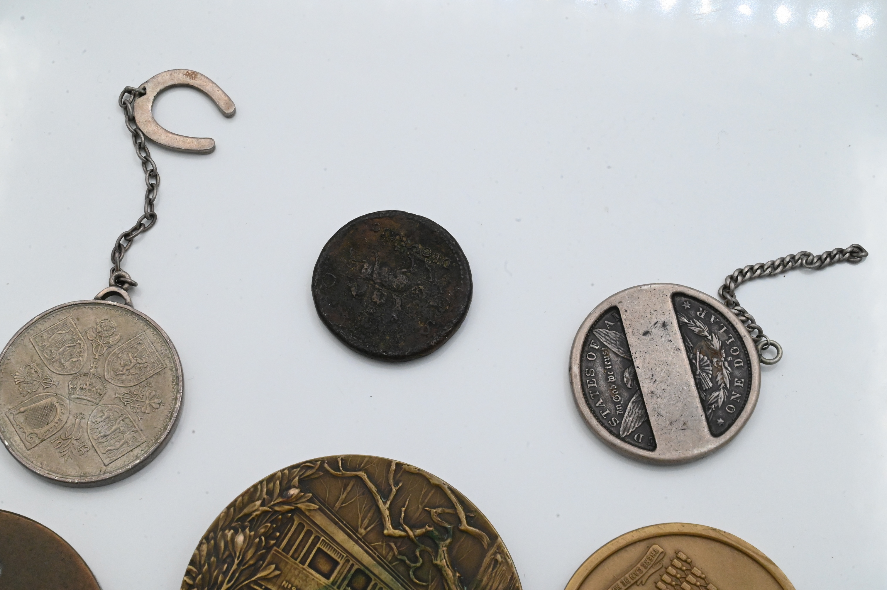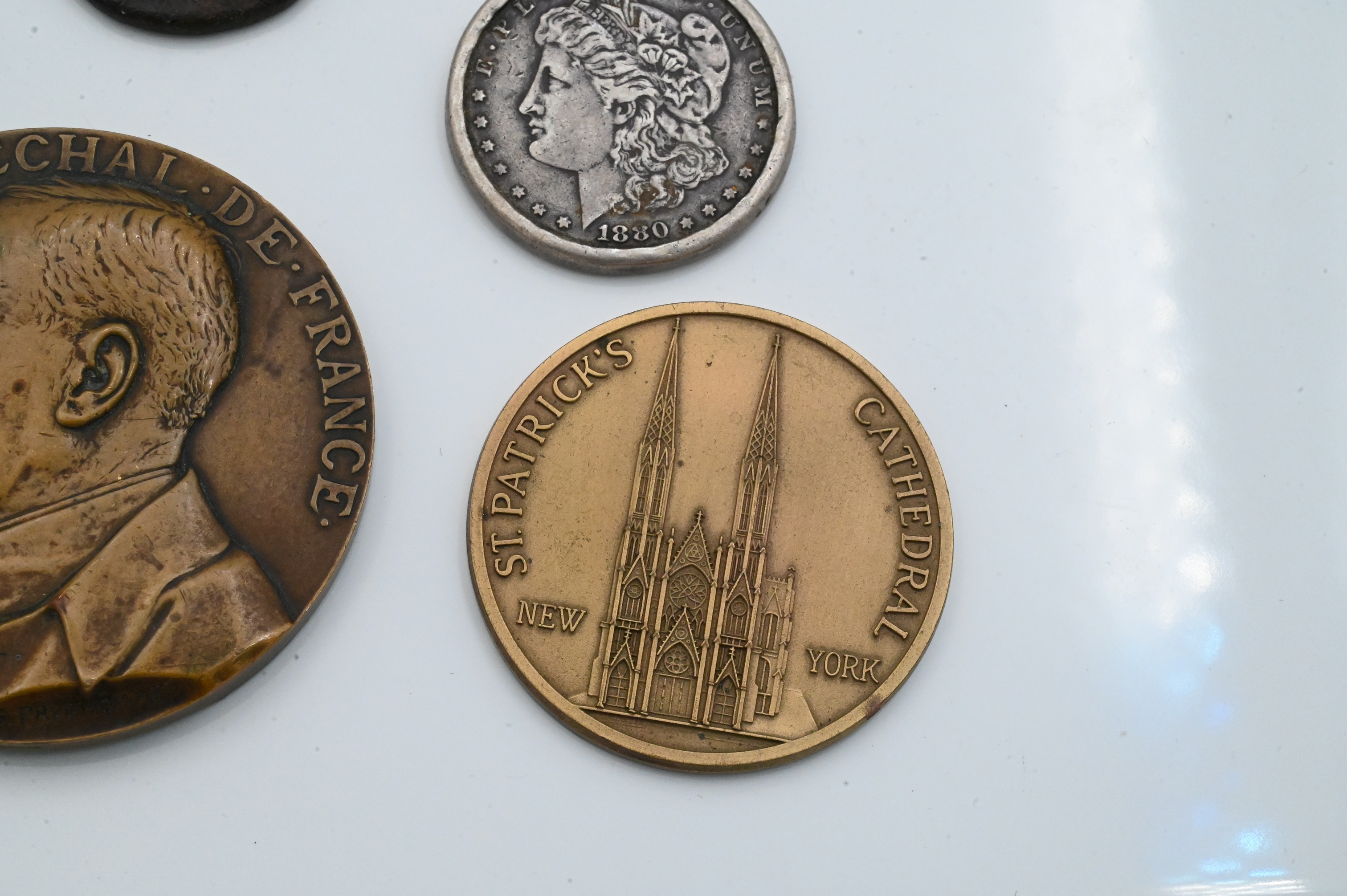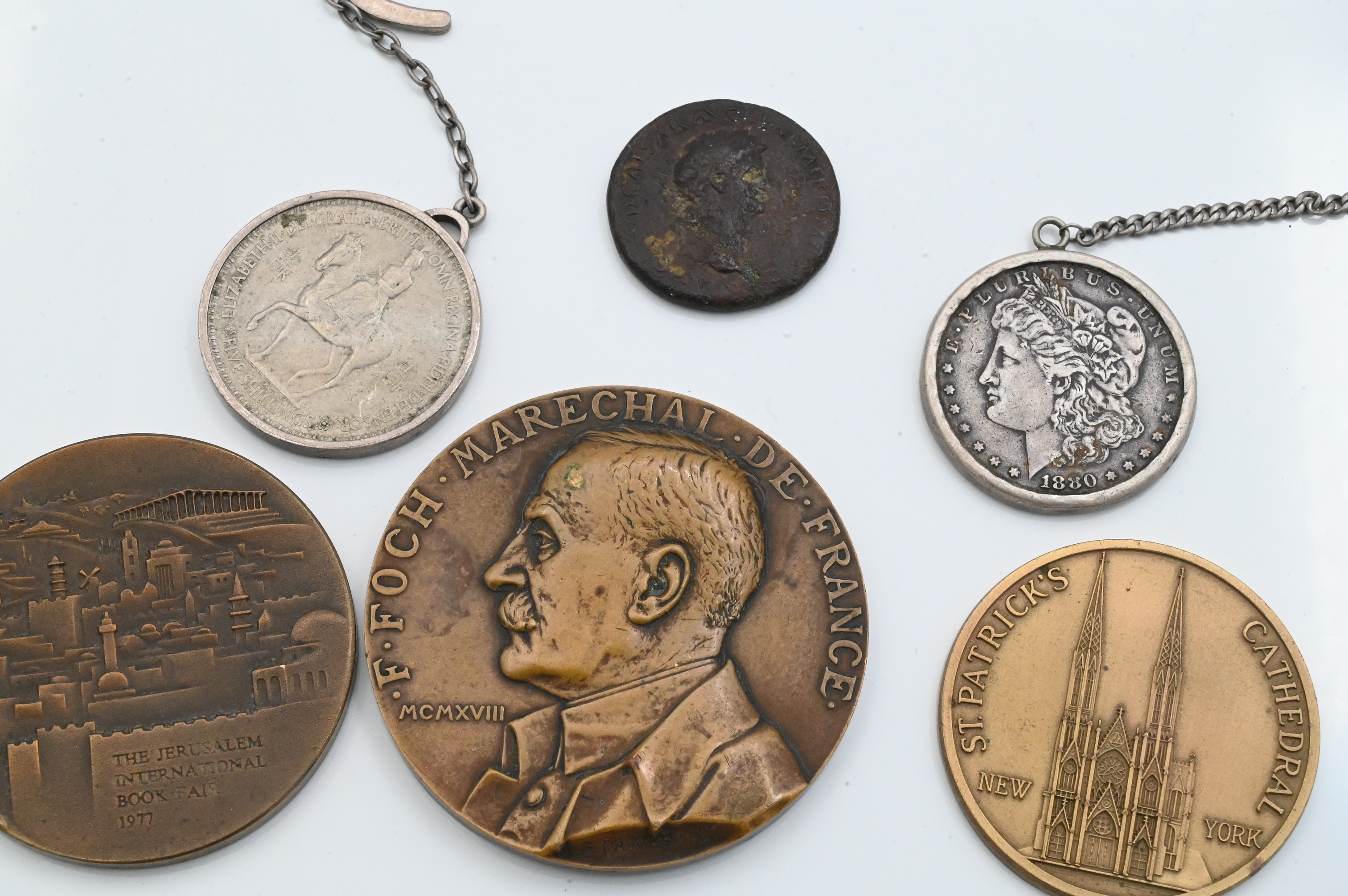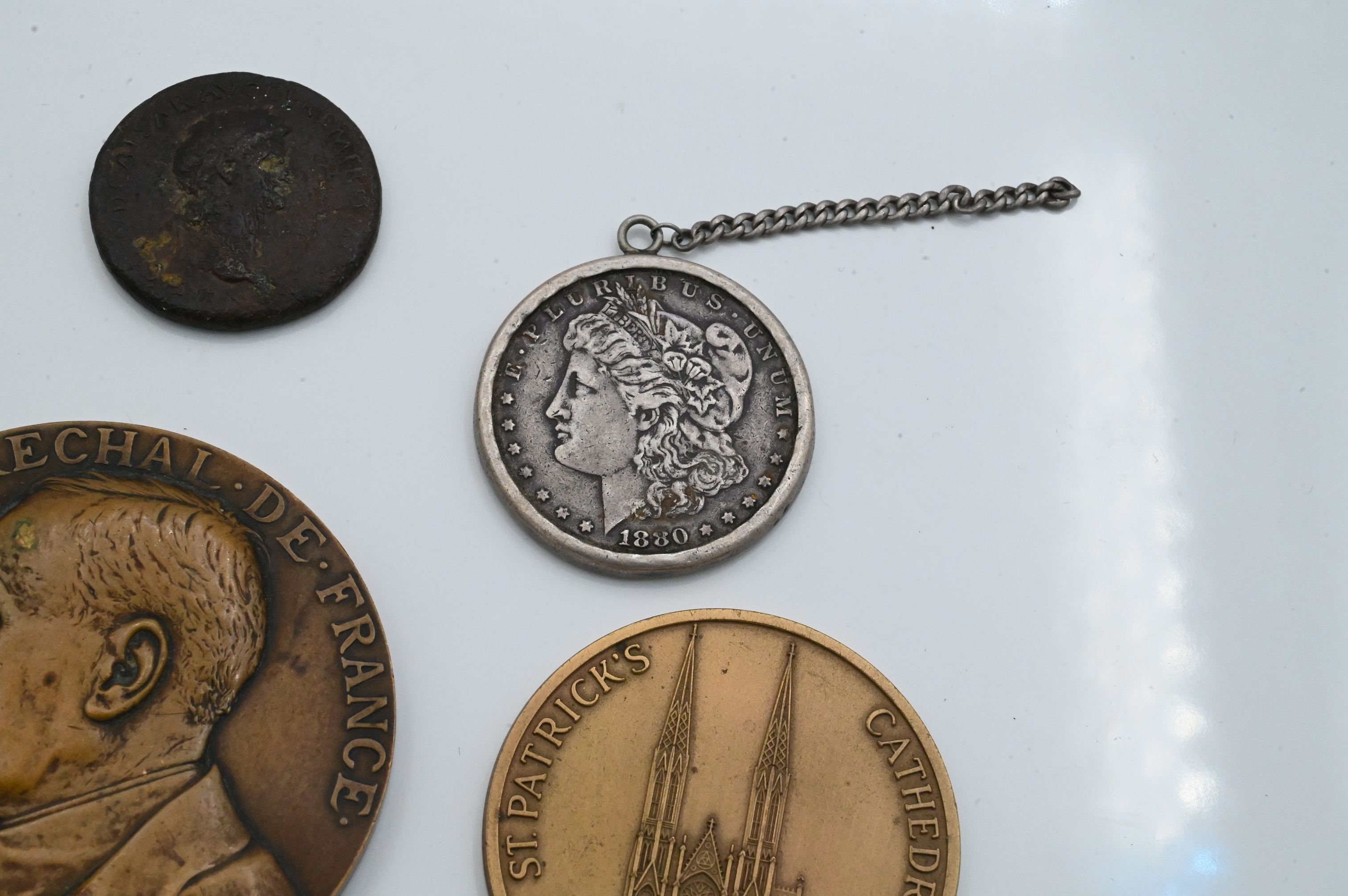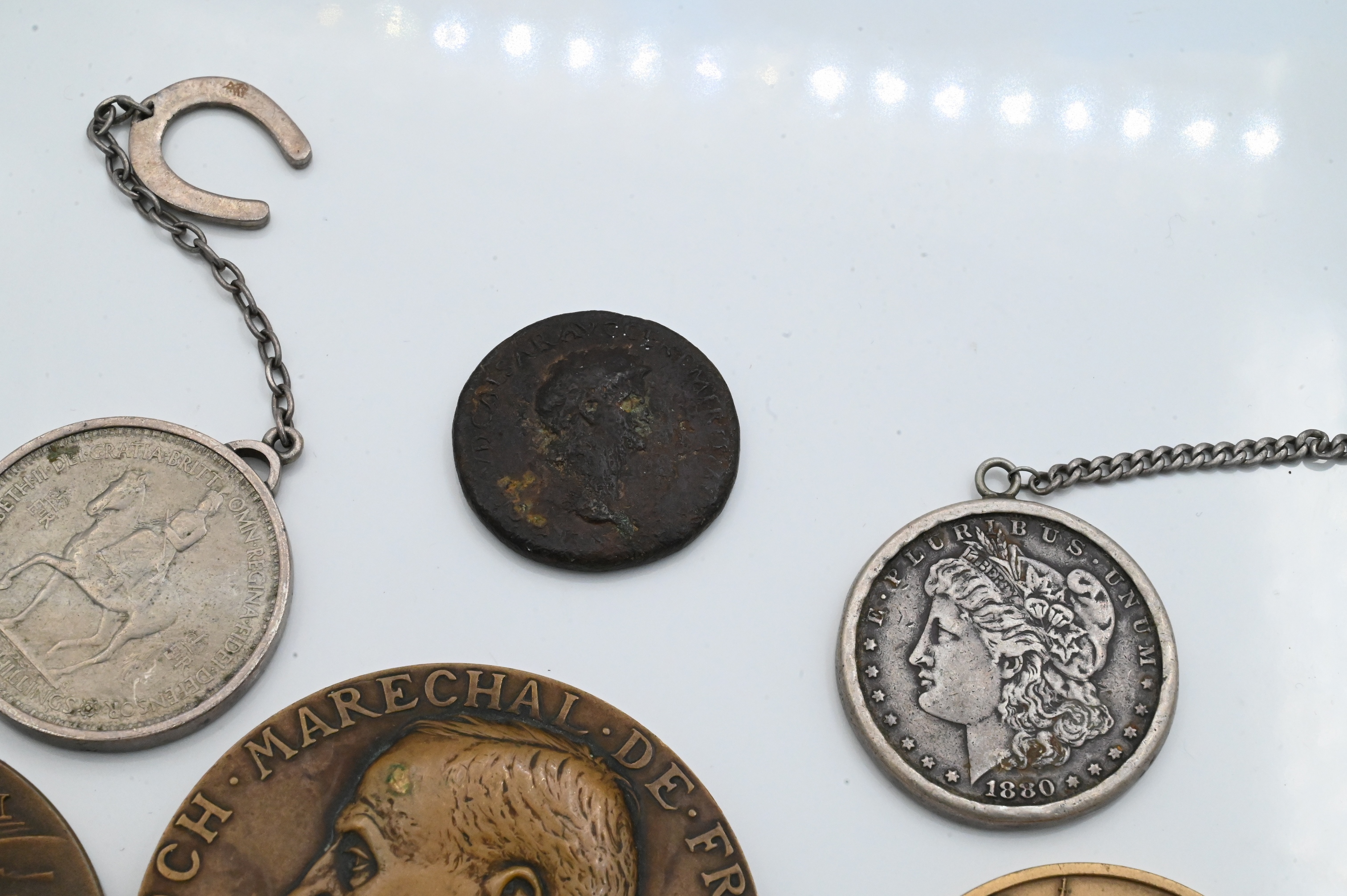 to include silver necklaces, watches, medals and ancient coins, morgan silver dollar, silver bar marked Tiffany and Company, and Rooster Farm Cigar Cutter