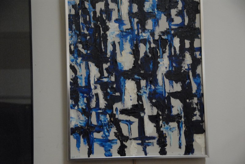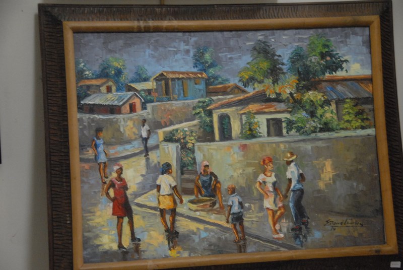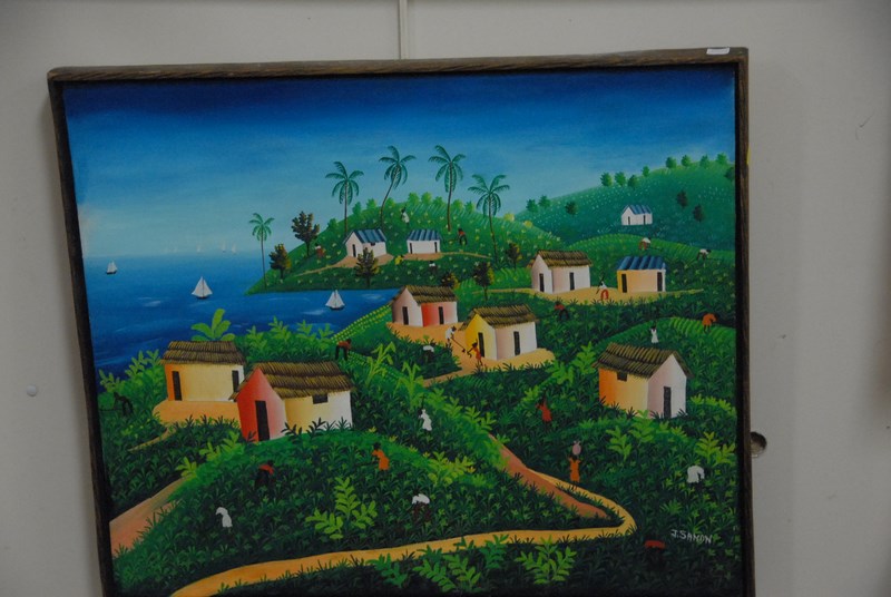 Lot 358: Group of four framed paintings to include an abstract blue and white Judith Hihon Alpert, Haiti oil on canvas signed Sanon, Etienne…
