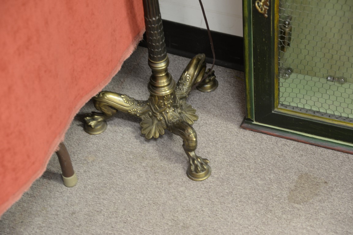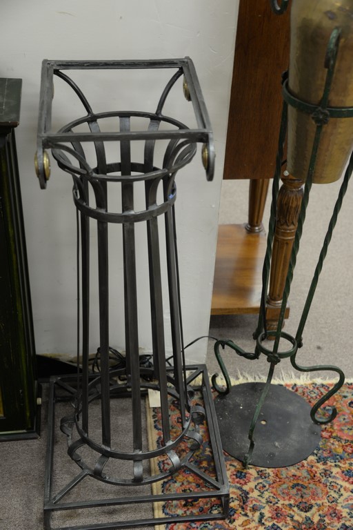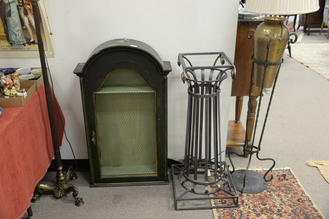 Lot 358: Group of four items to include two floor lamps, lighted hanging cabinet ht. 39in., and an iron pedestal.