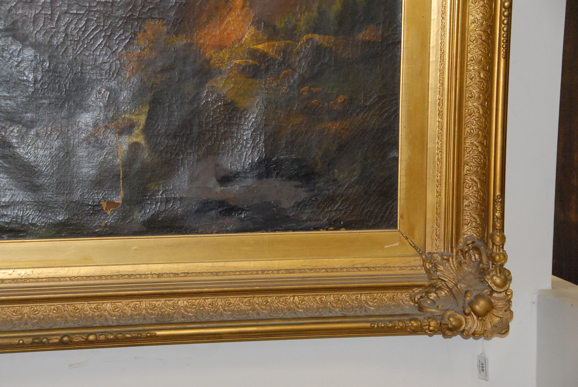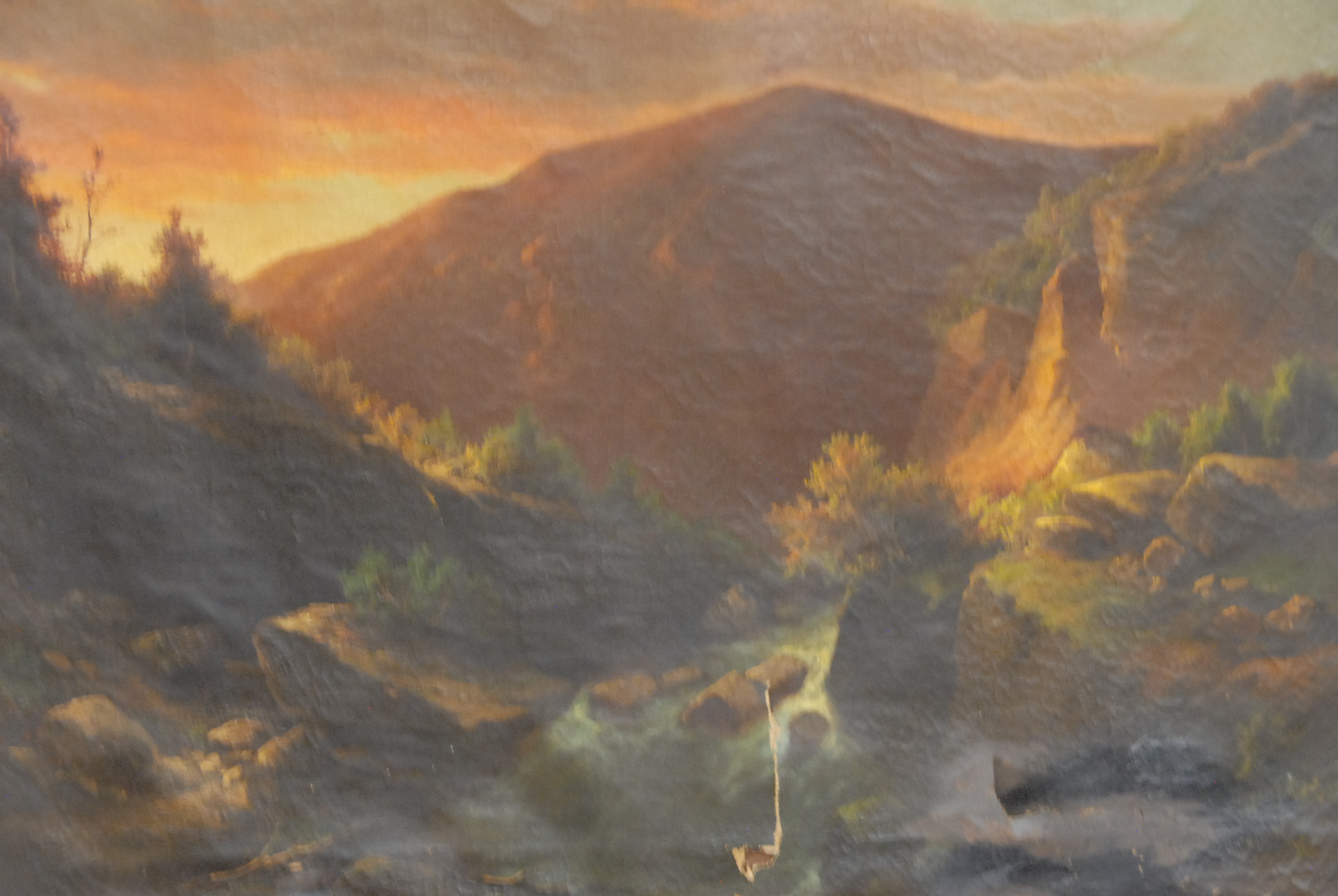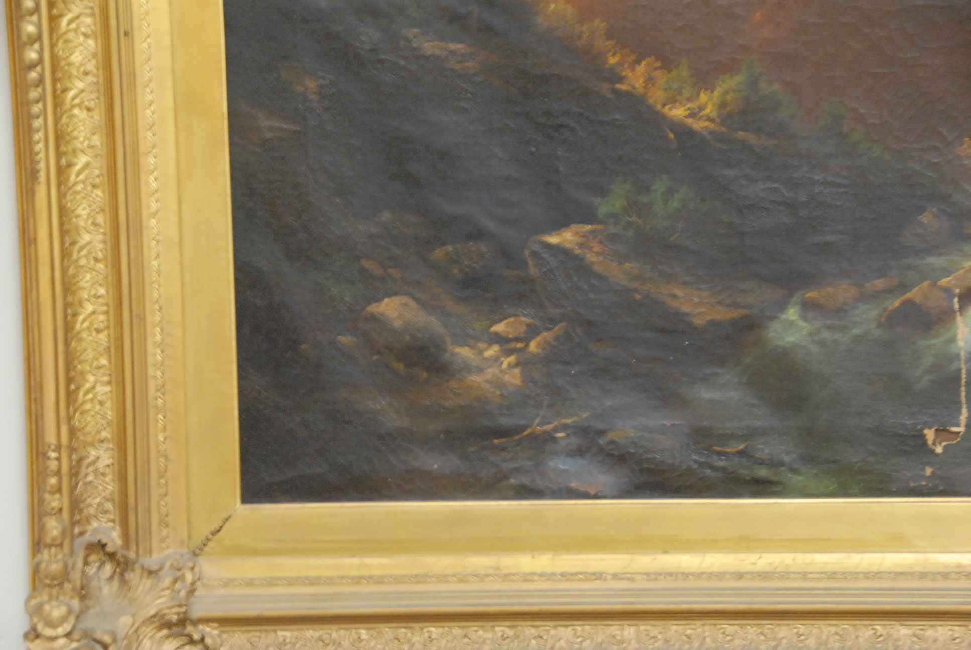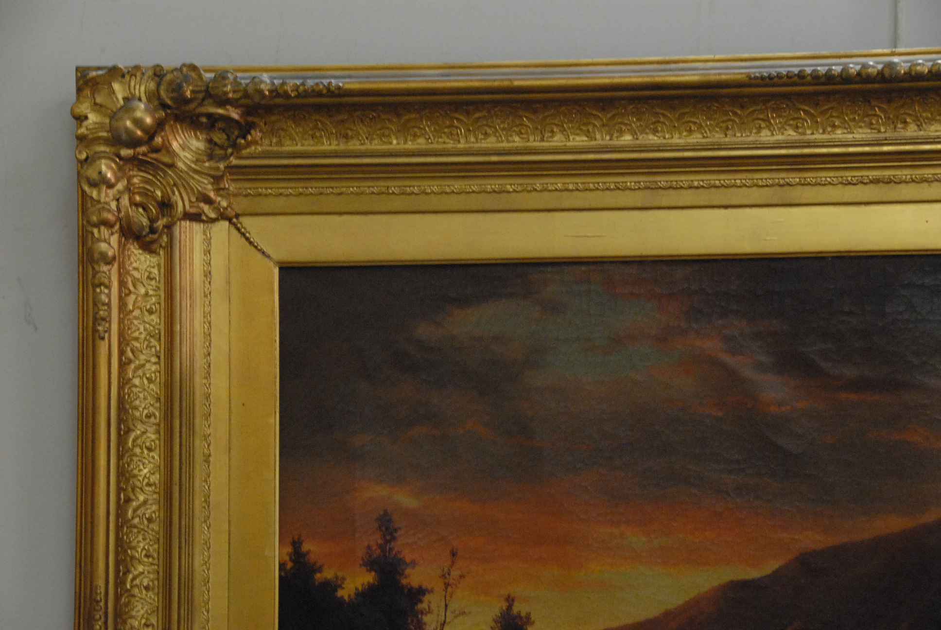 Hudson River Valley landscape oil on canvas, unsigned with a large Victorian frame, as is.