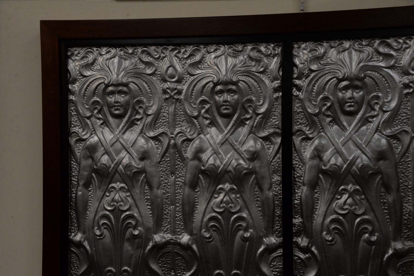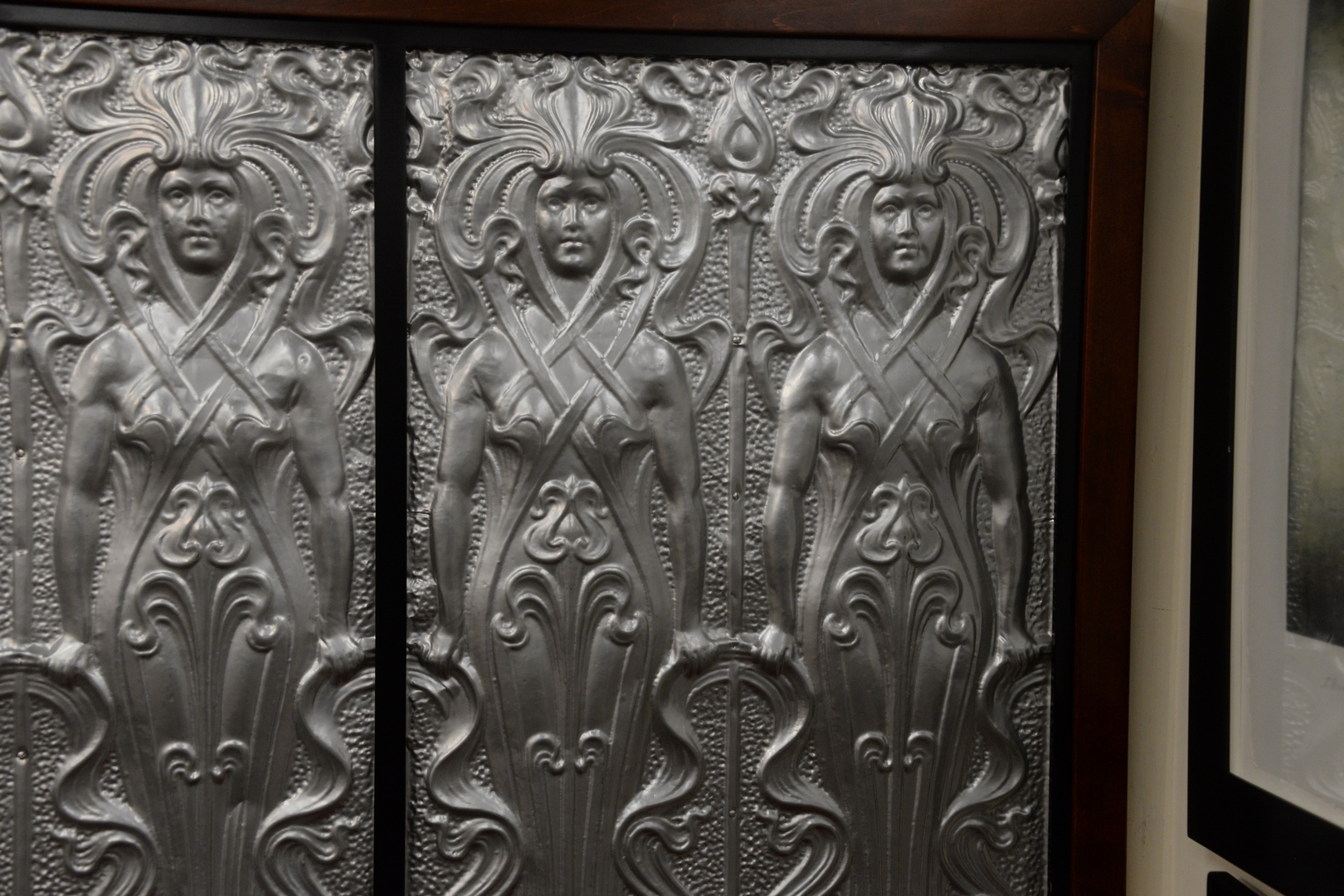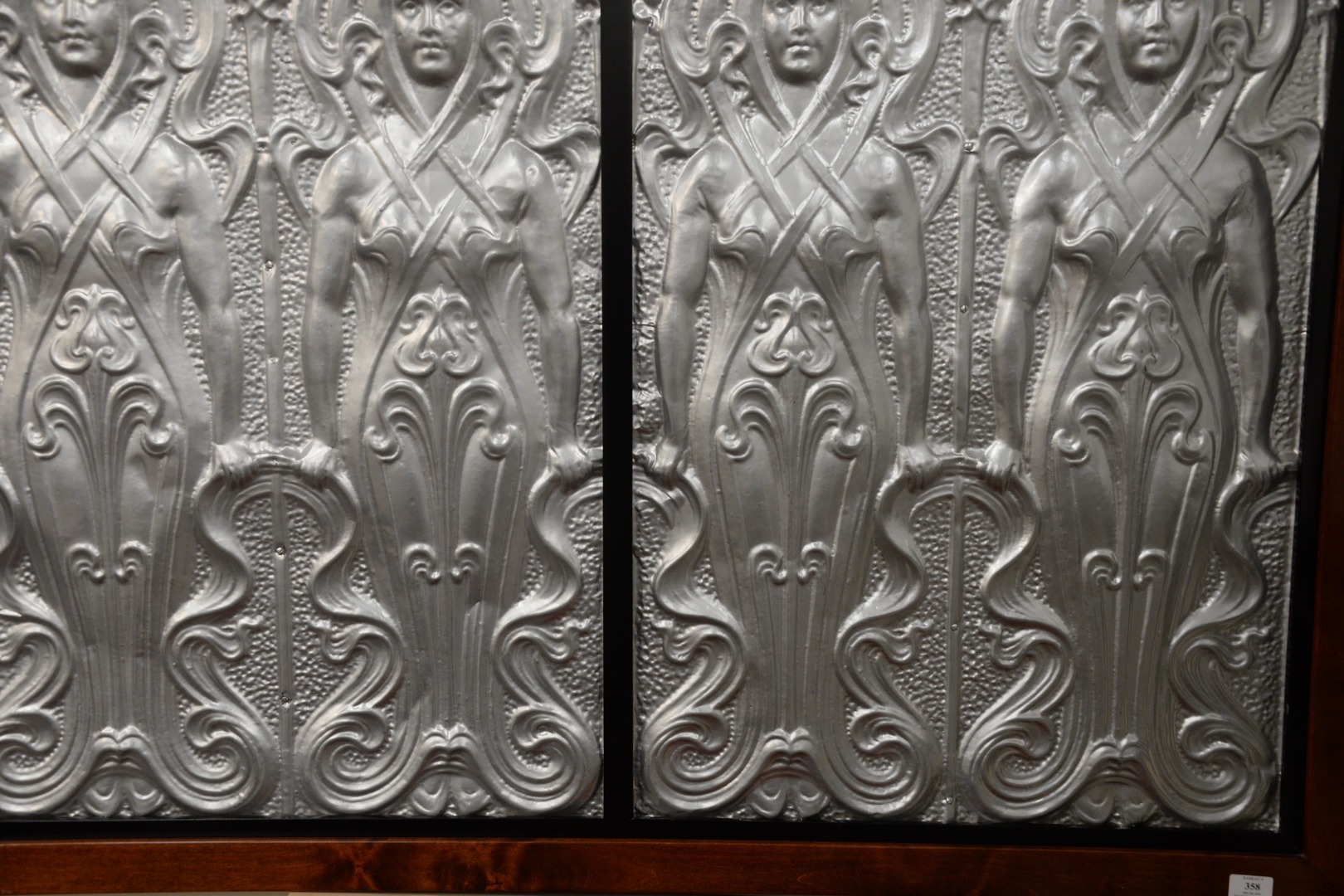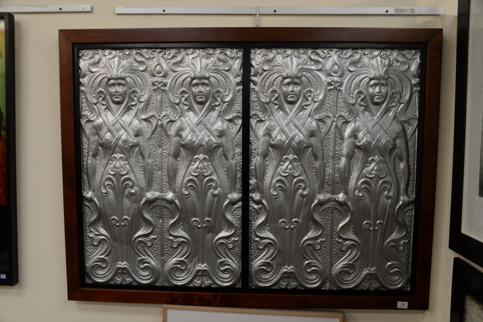 Lot 358: Large Art Deco Style Embossed Metal Two-Panel Wall Hanging, depicting women in headdresses, overall dimensions including frame 40 1/2″ x 54″.