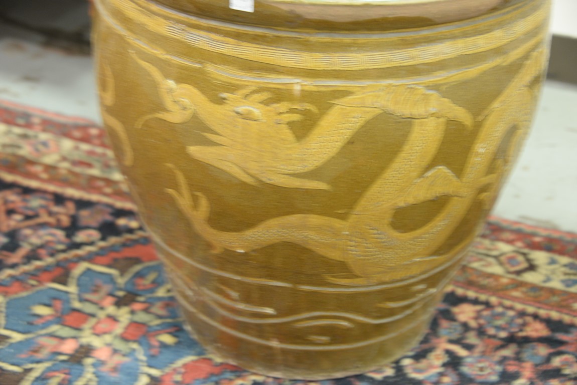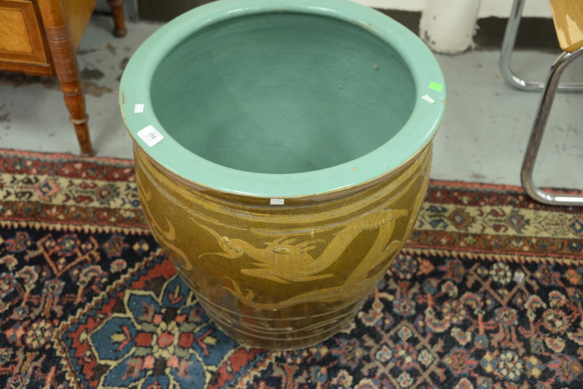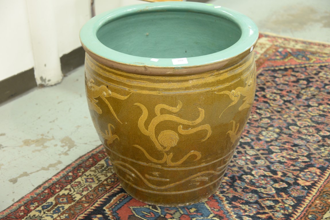 Lot 358: Large Chinese terracotta planter, brown and tan dragon exterior and turquoise glazed interior. ht. 20 in. dia. 20 1/2 in.