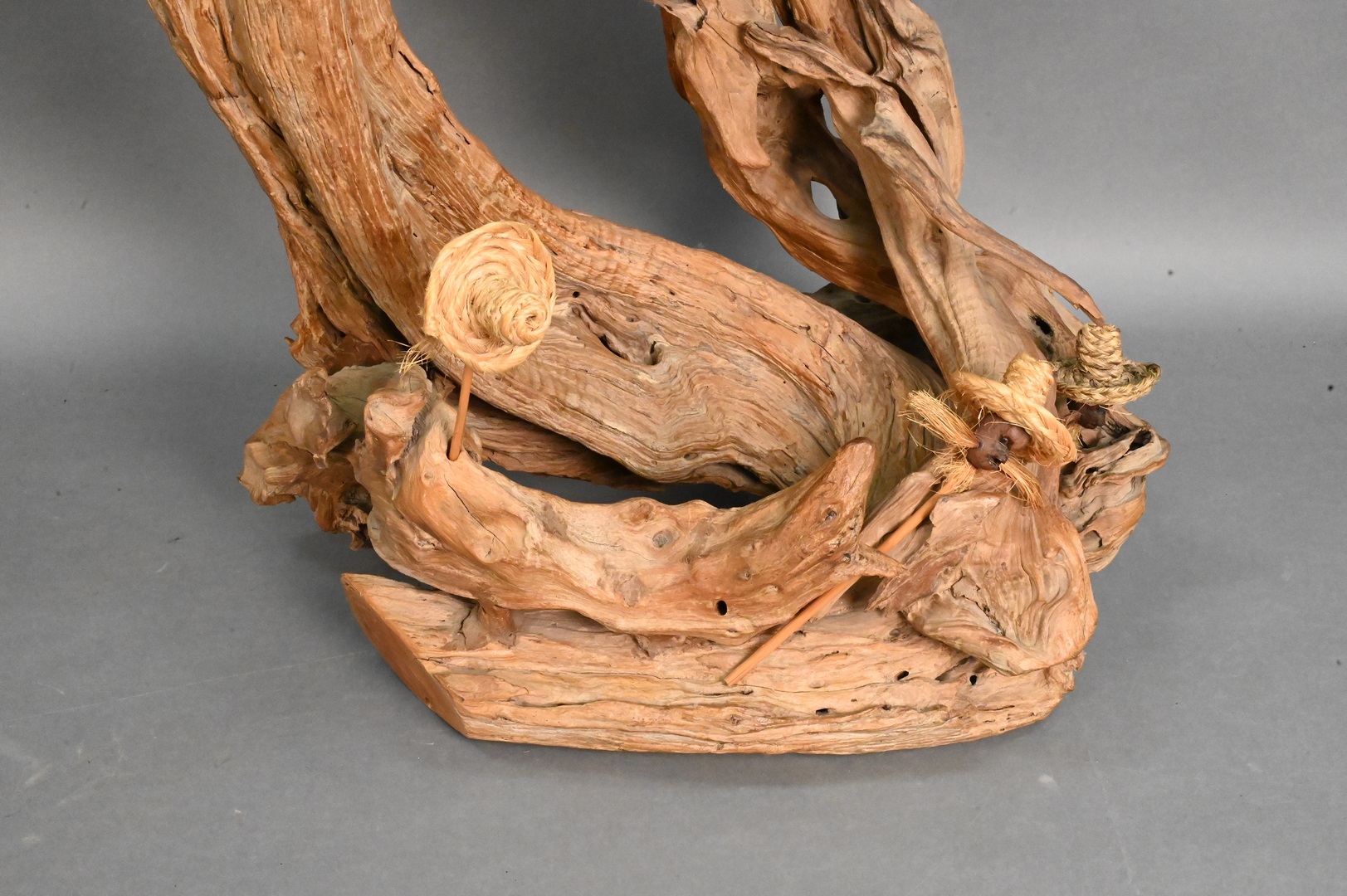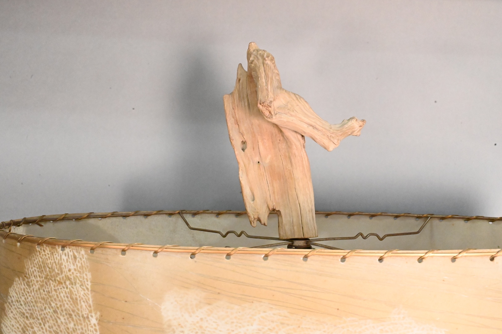 Large Driftwood Lamp, having custom shade, driftwood finial, height 51 inches.