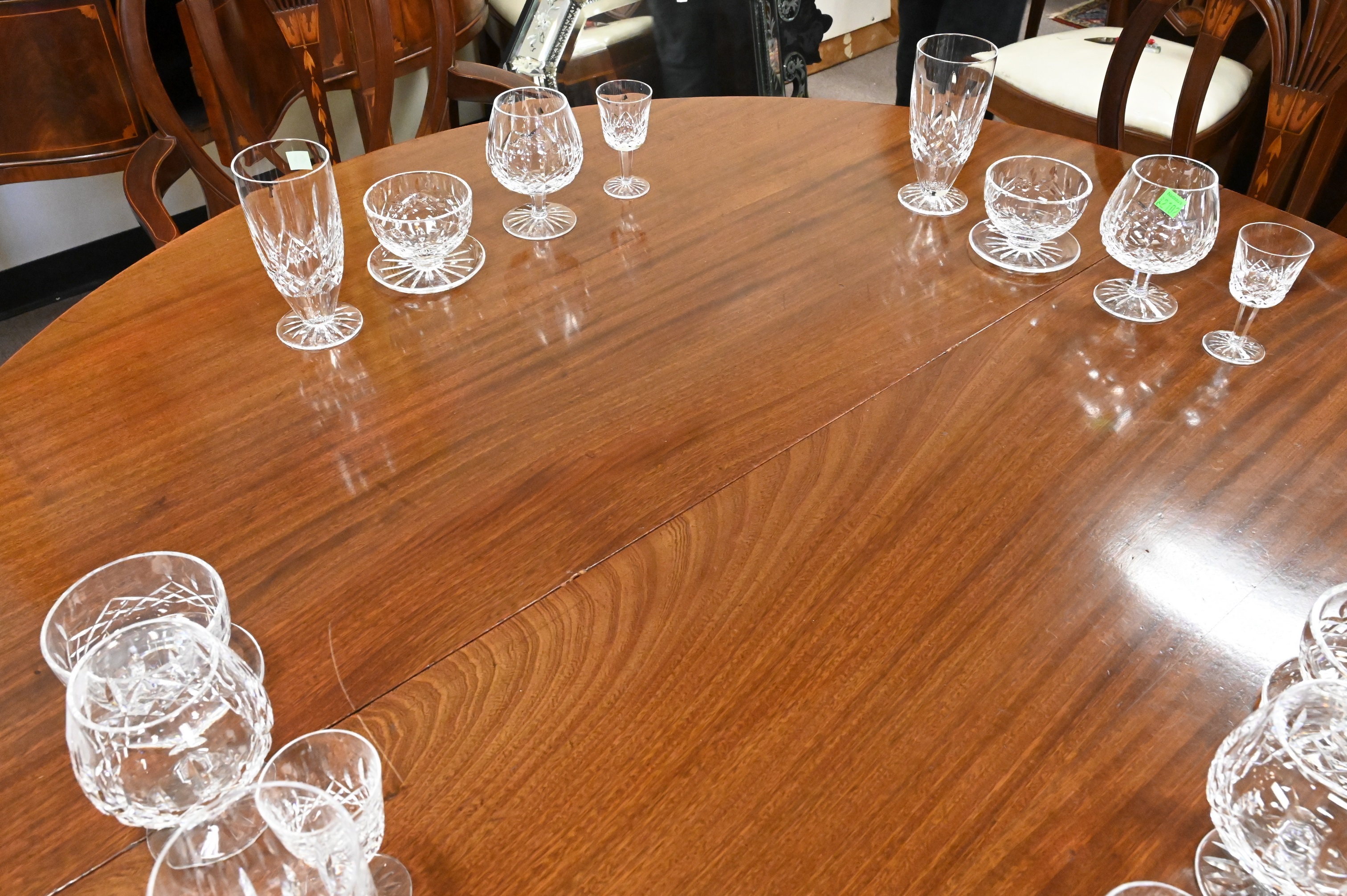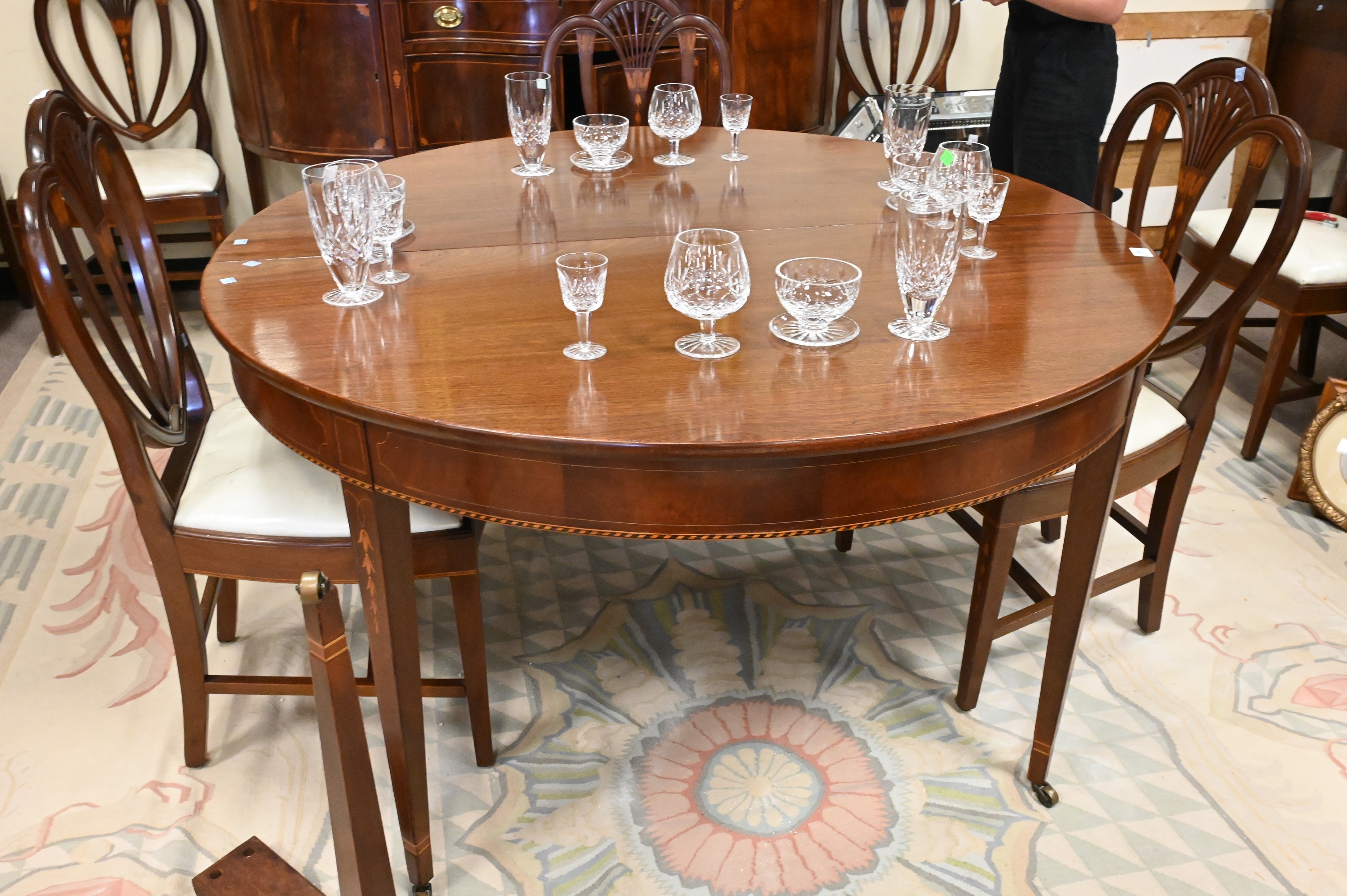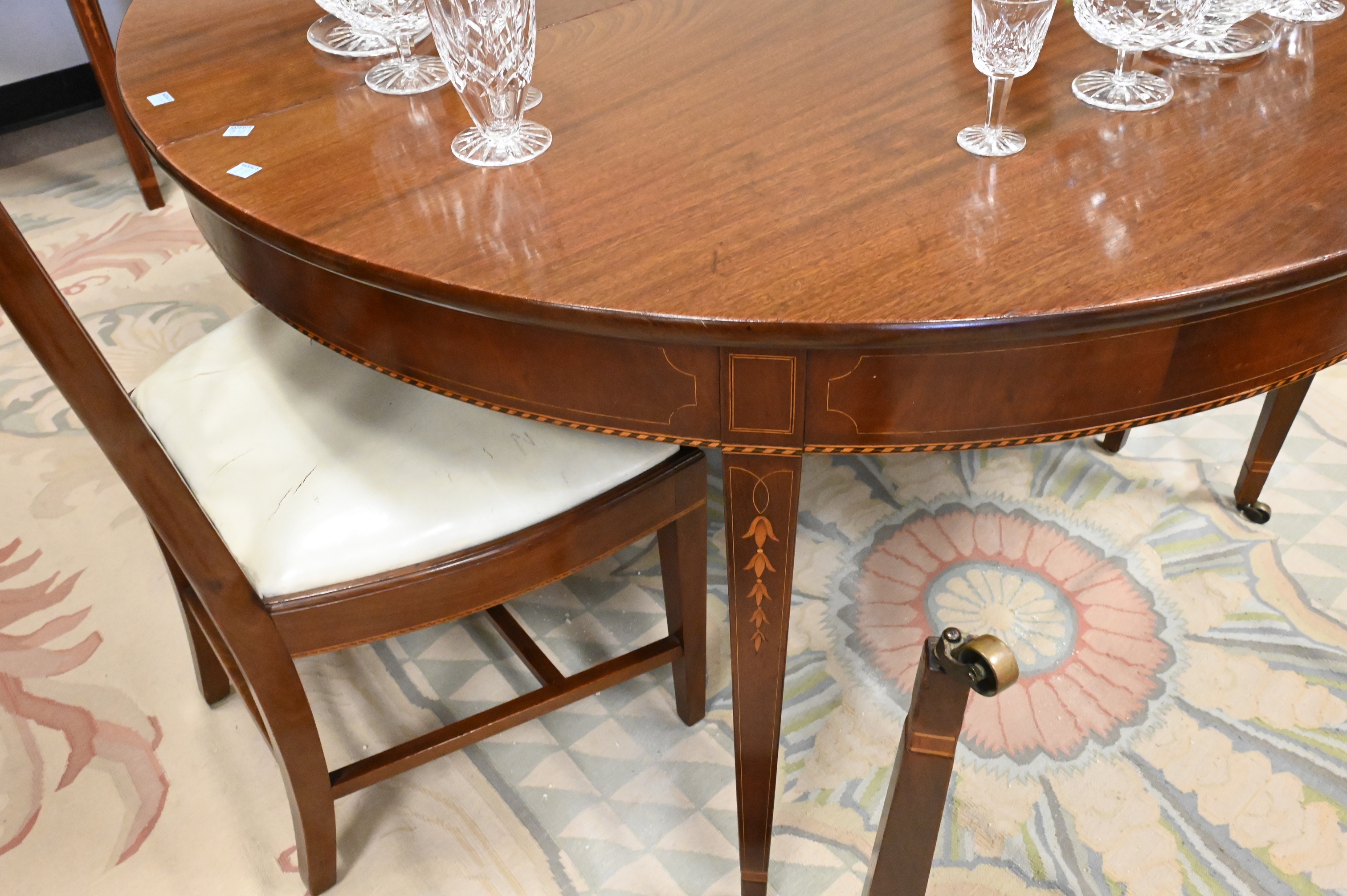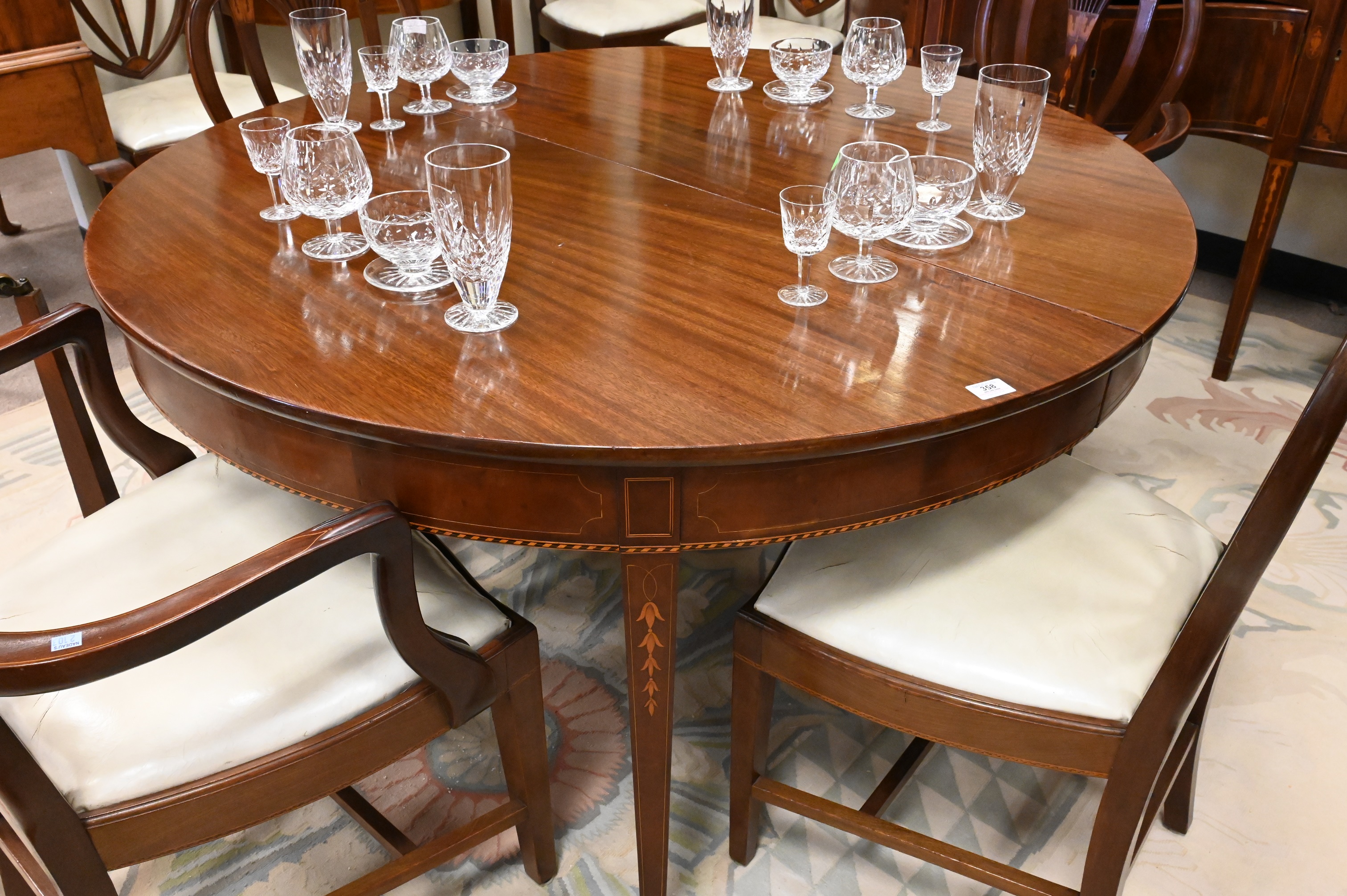 Mahogany Round Dining Table with bell flower inlays and four leaves, height 31 inches, top diameter 53 inches (closed)