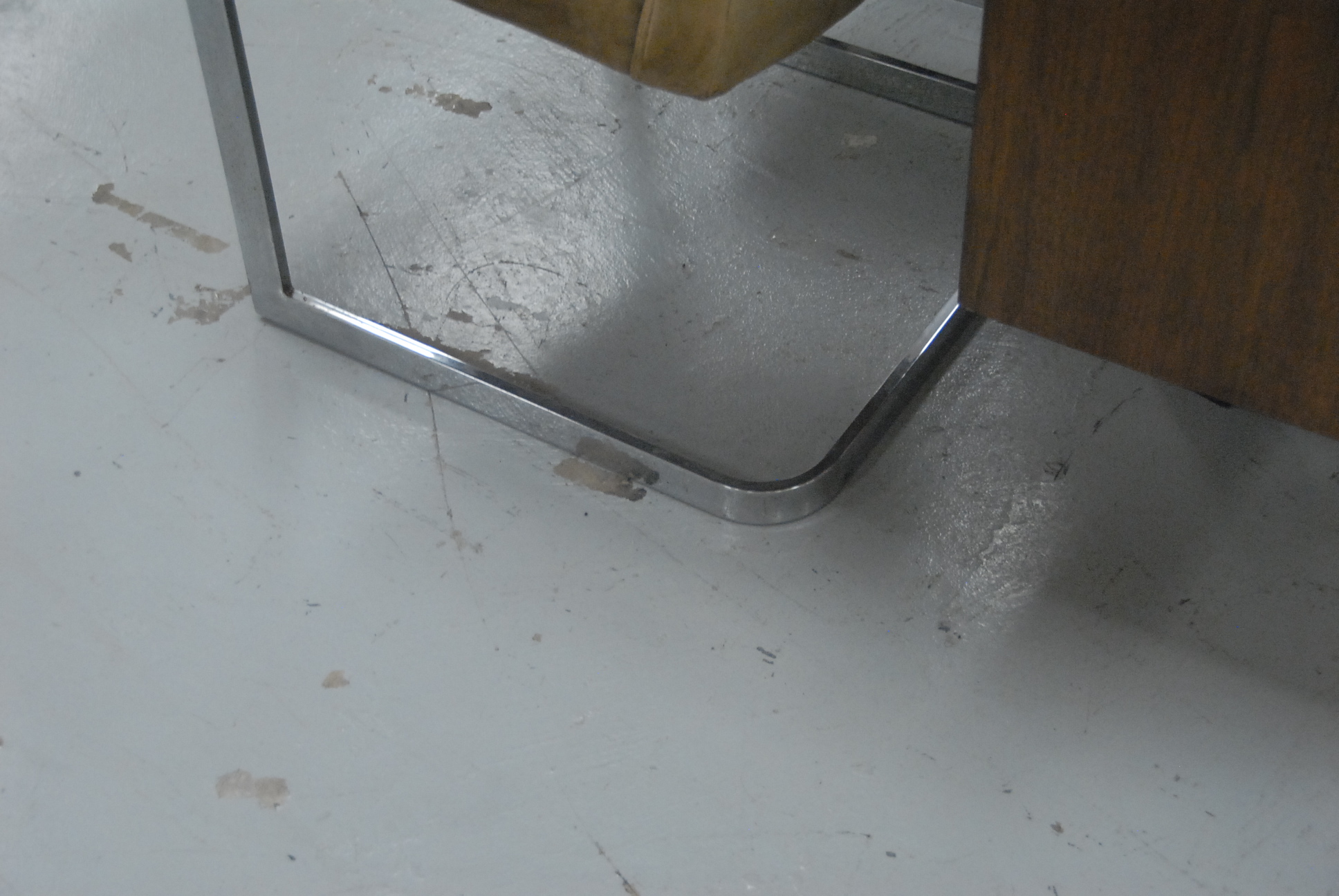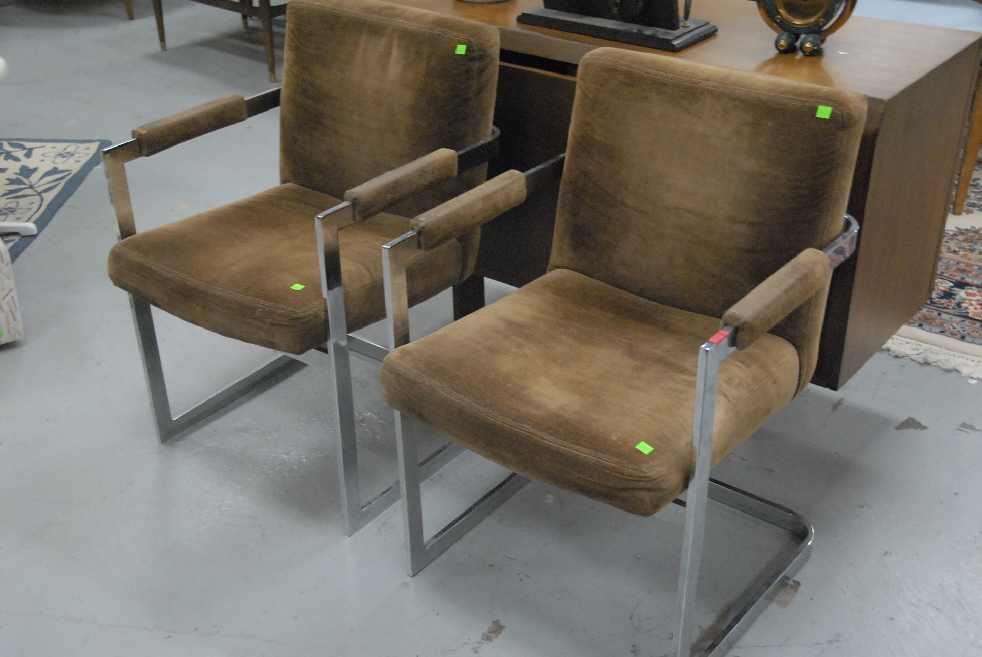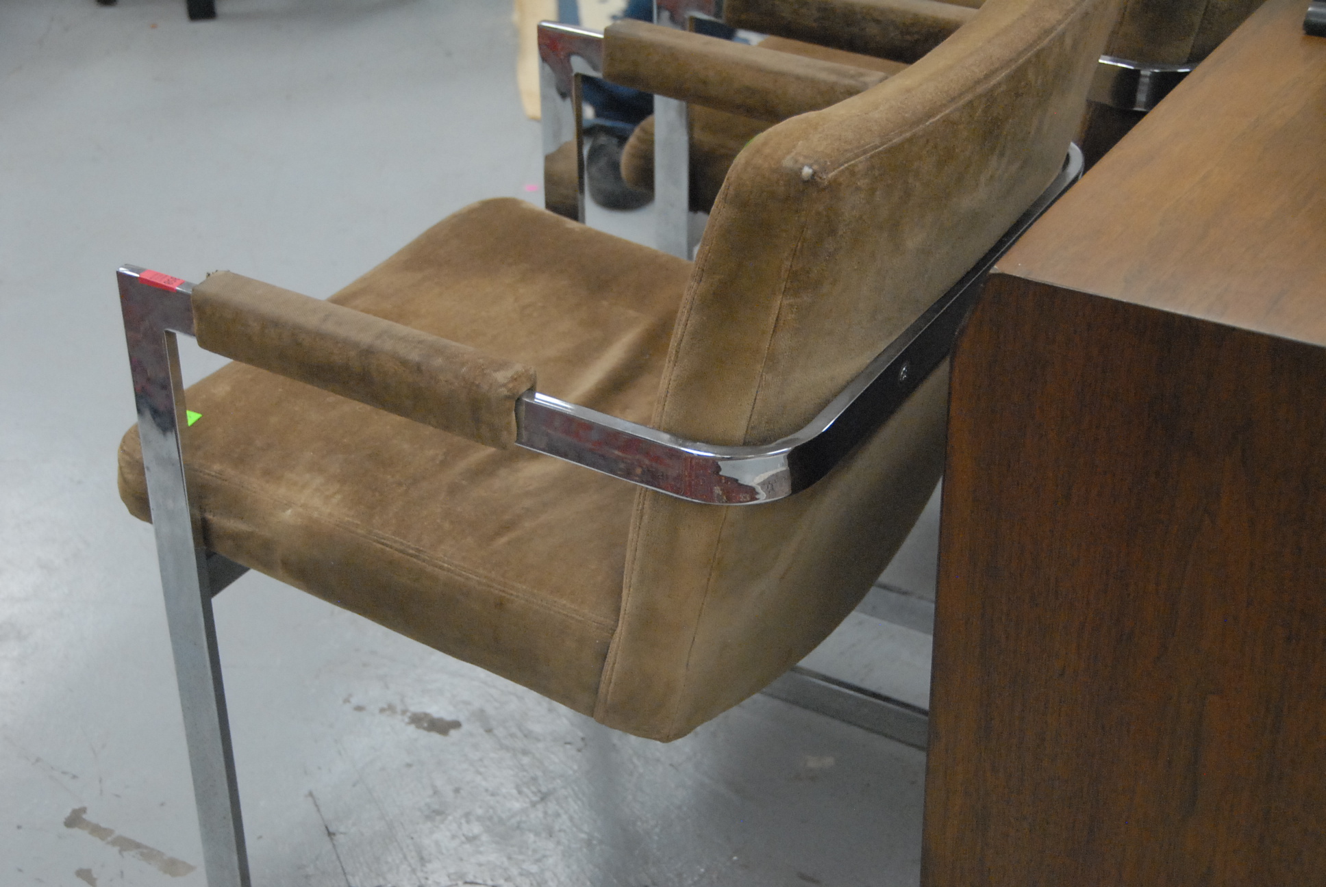 Lot 358: Milo Baughman for Thayer Coggin flat chrome arms chairs with brown upholstered seat and back, original upholstery, signed with cloth…