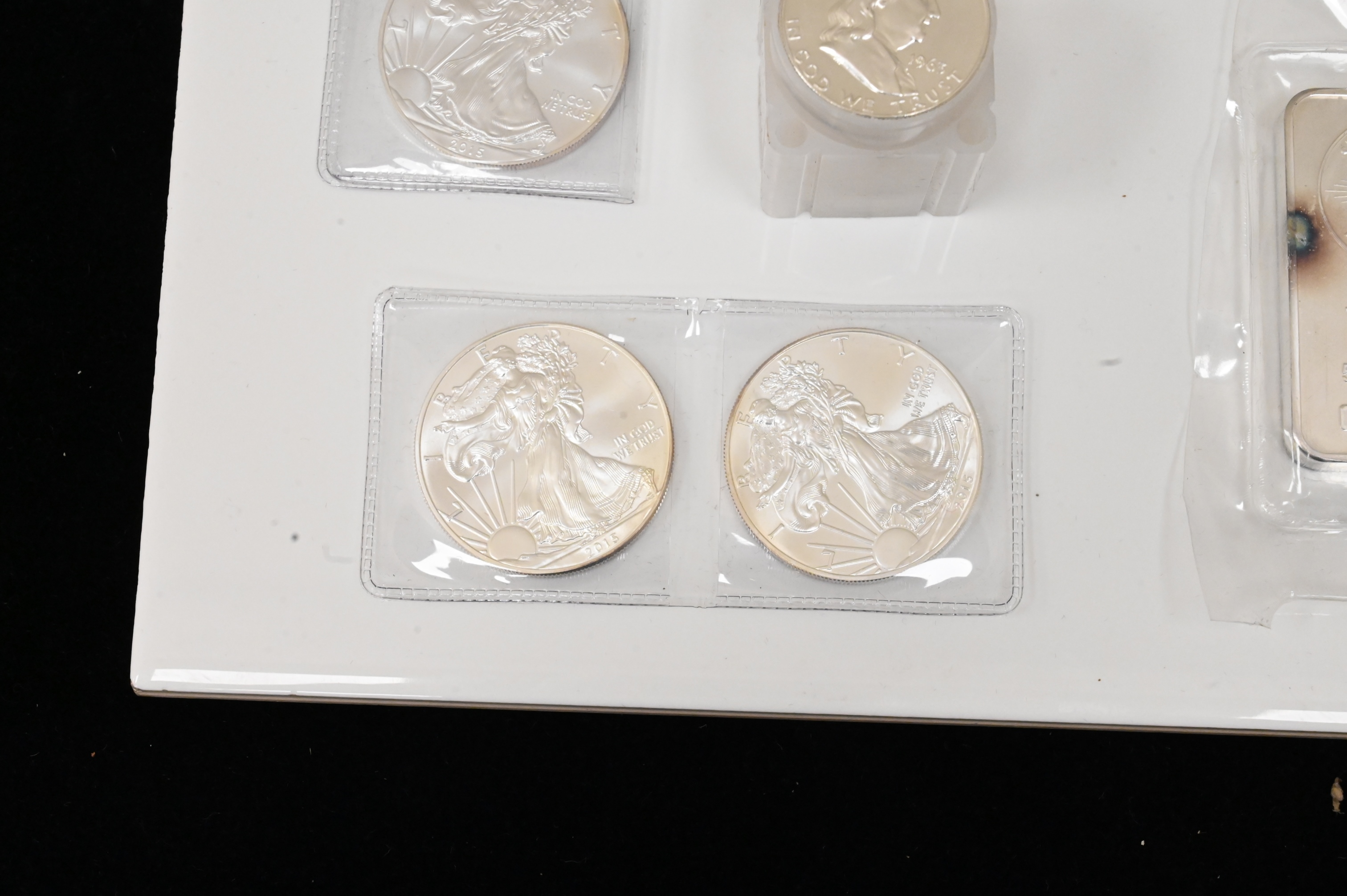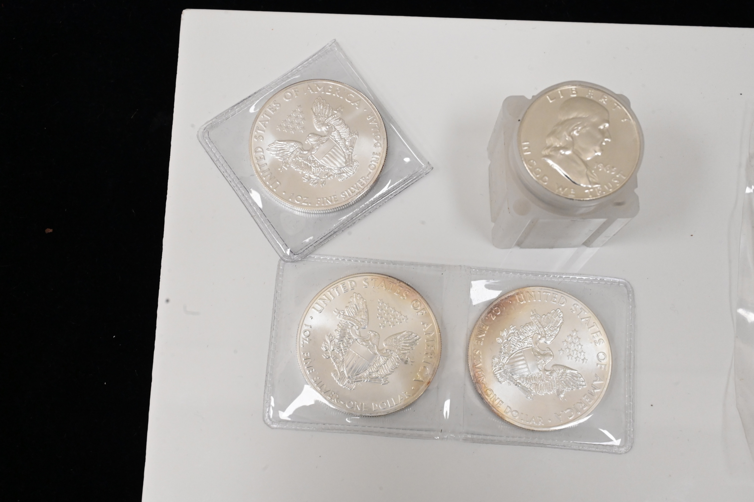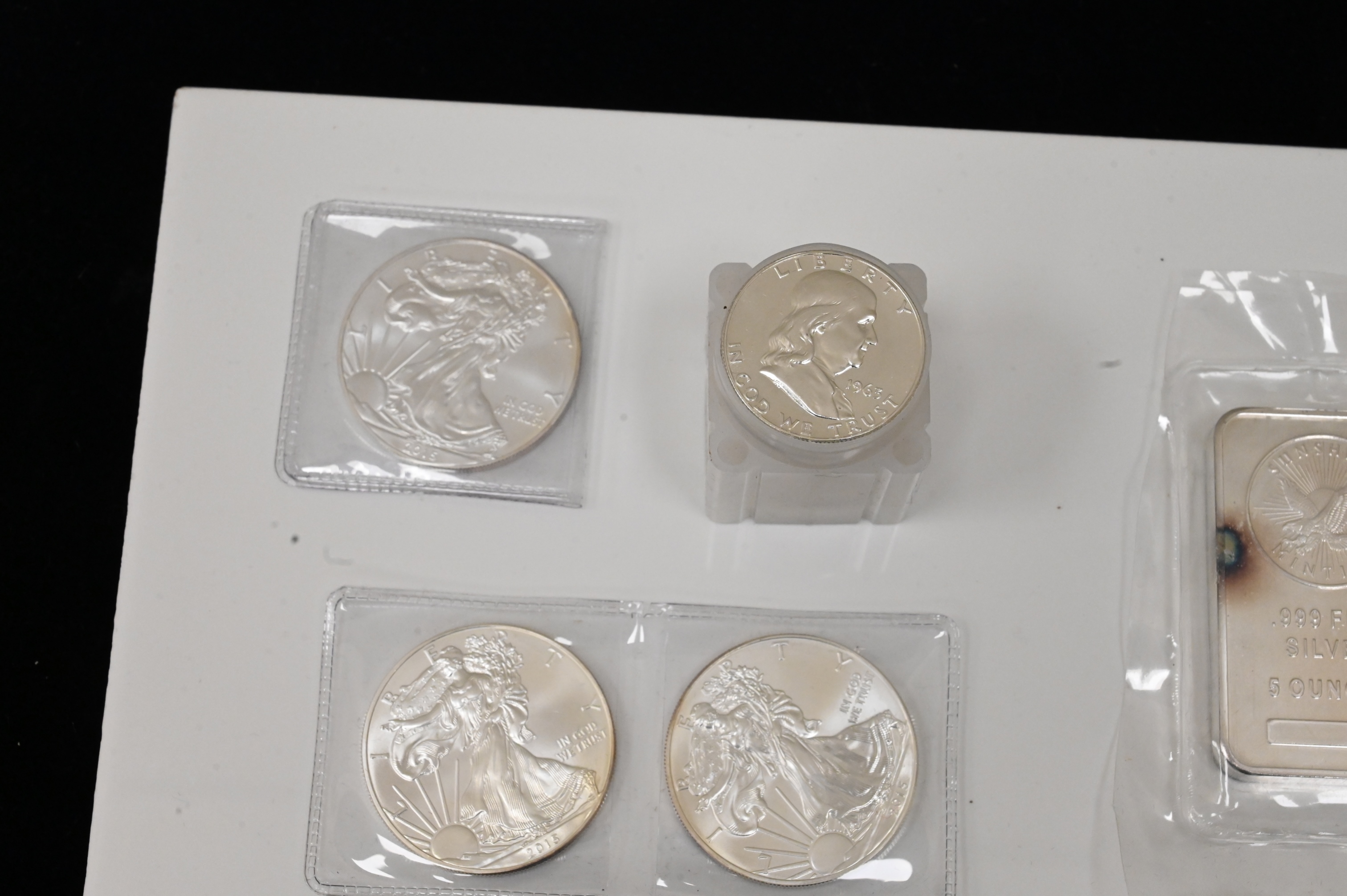 Silver Lot, to include 7 silver Eagles 2015/2016 unc, along with two five ounce .999 silver bars, 20 1963 Franklin half dollars