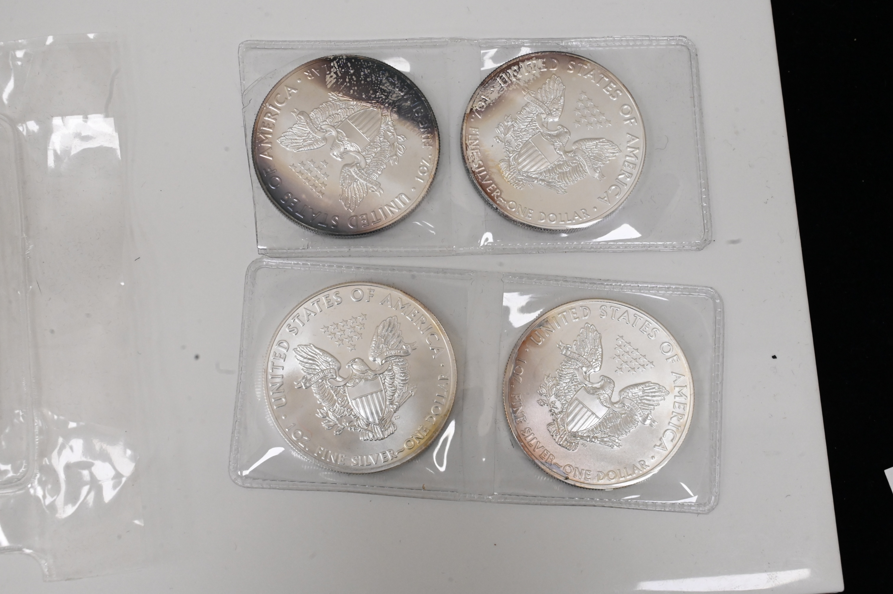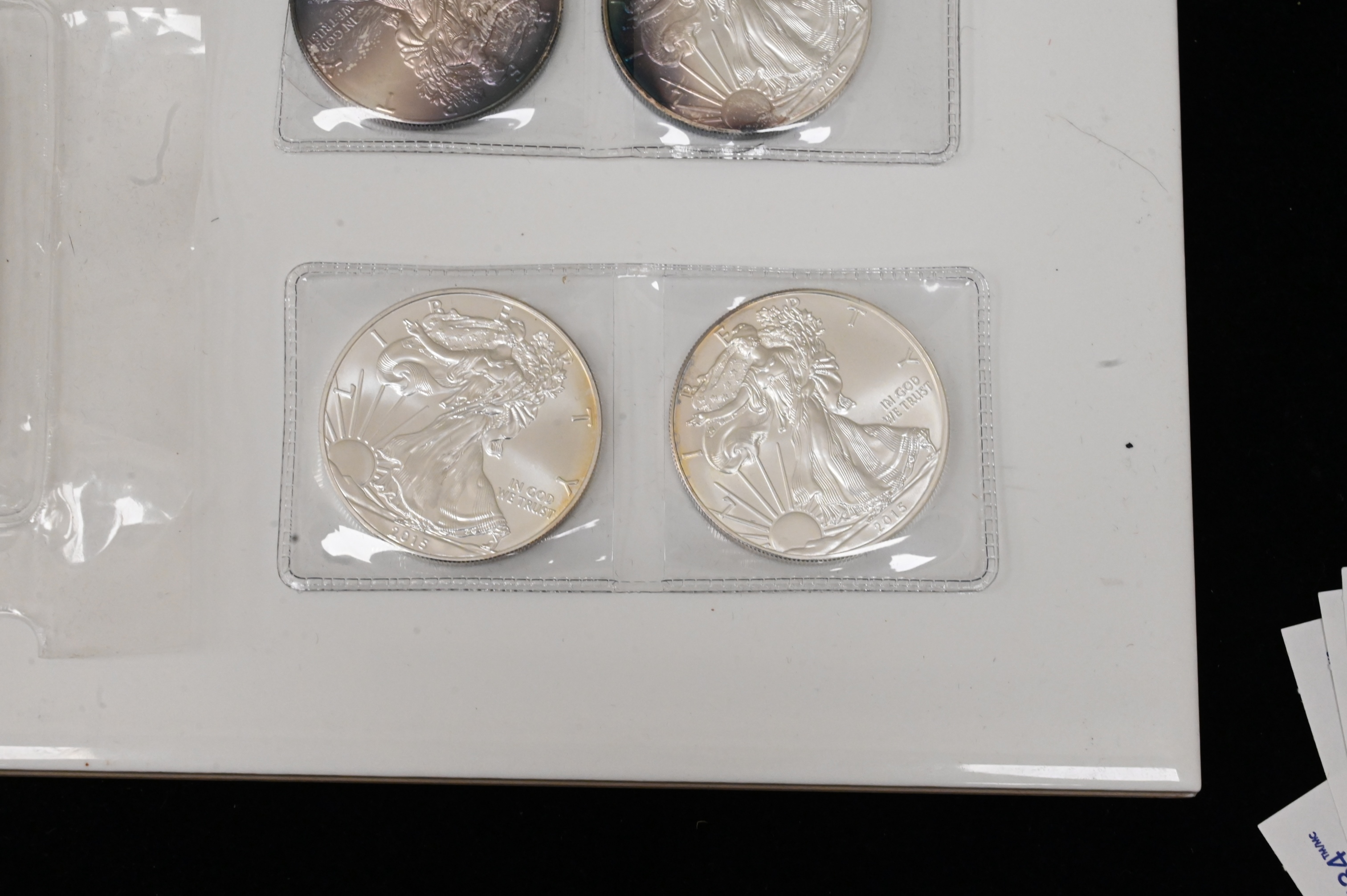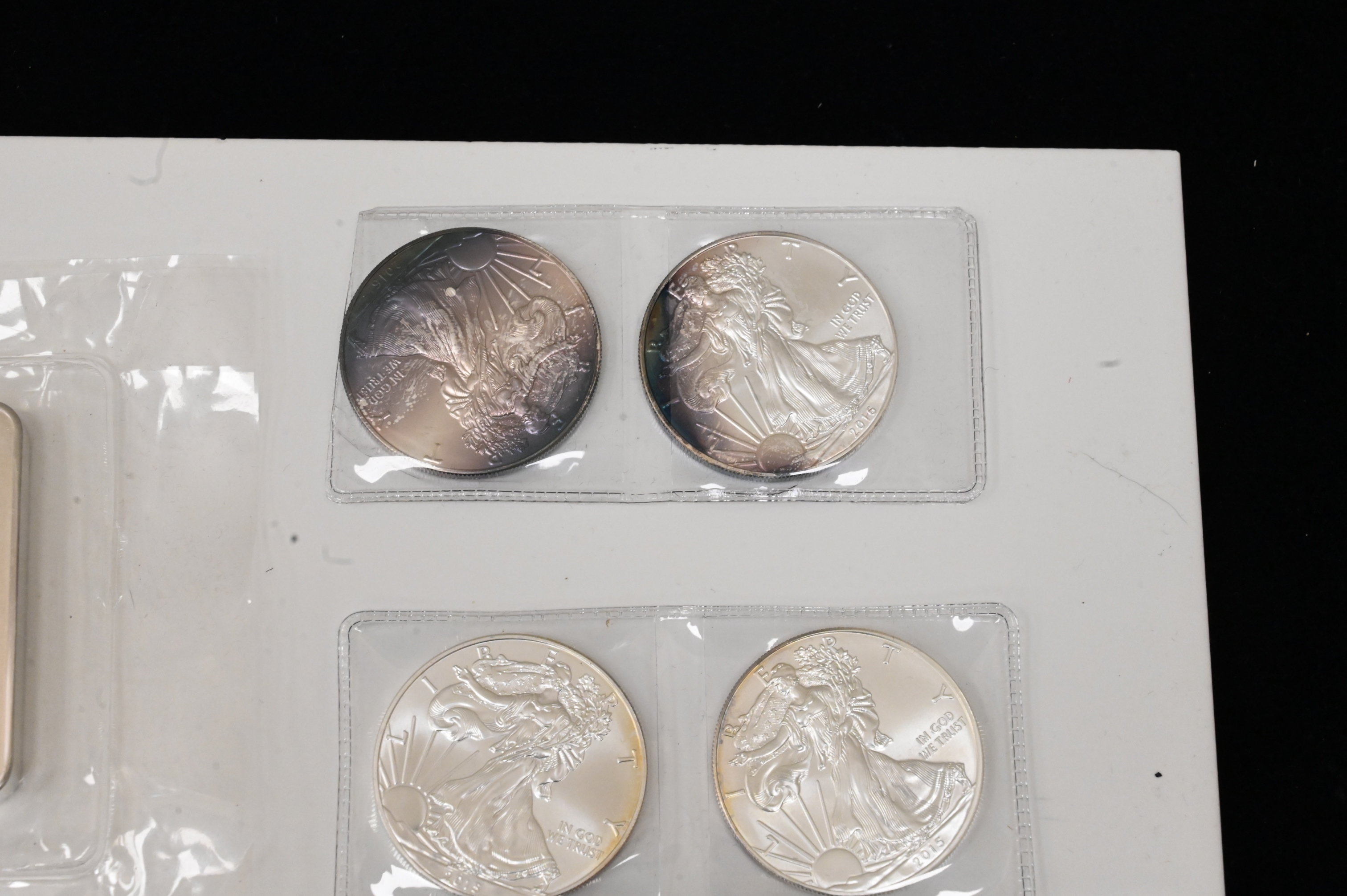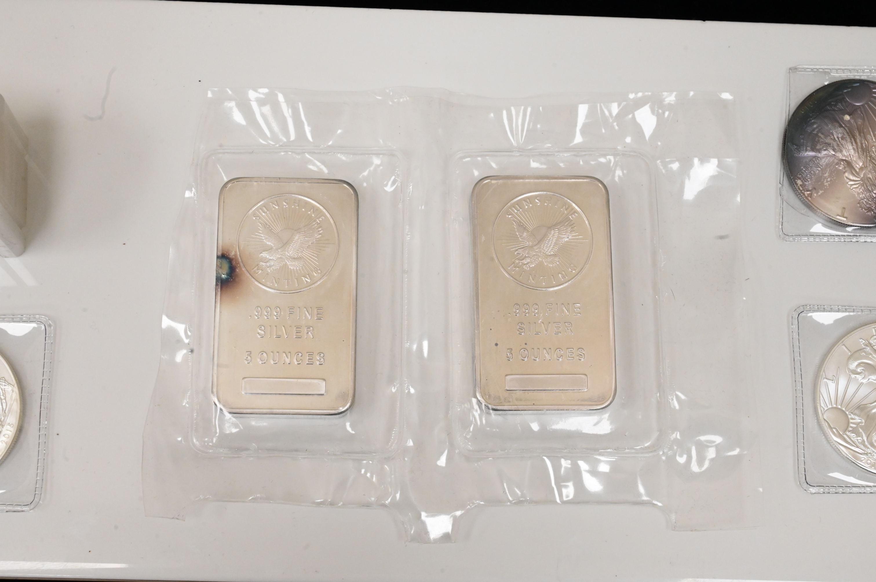Silver Lot, to include 7 silver Eagles 2015/2016 unc, along with two five ounce .999 silver bars, 20 1963 Franklin half dollars