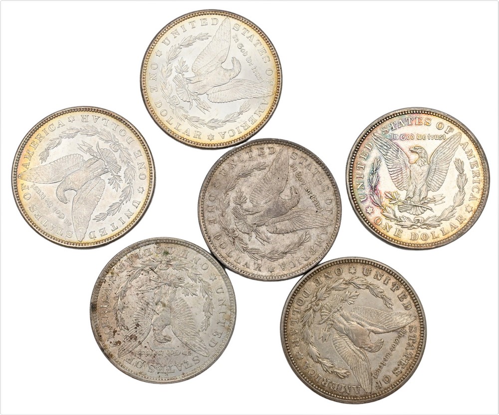 Six Morgan Silver Dollars, to include two 1882 uncirculated Morgan silver dollars.