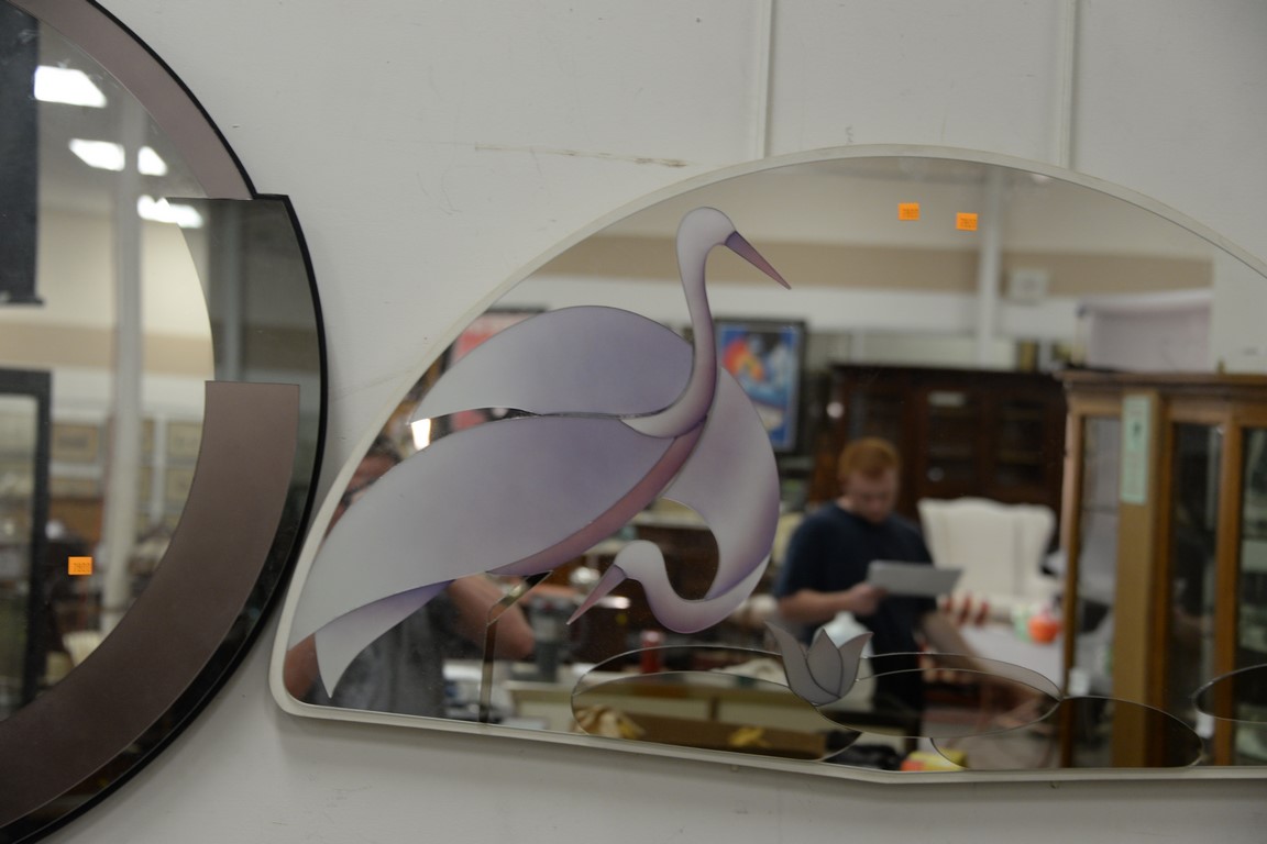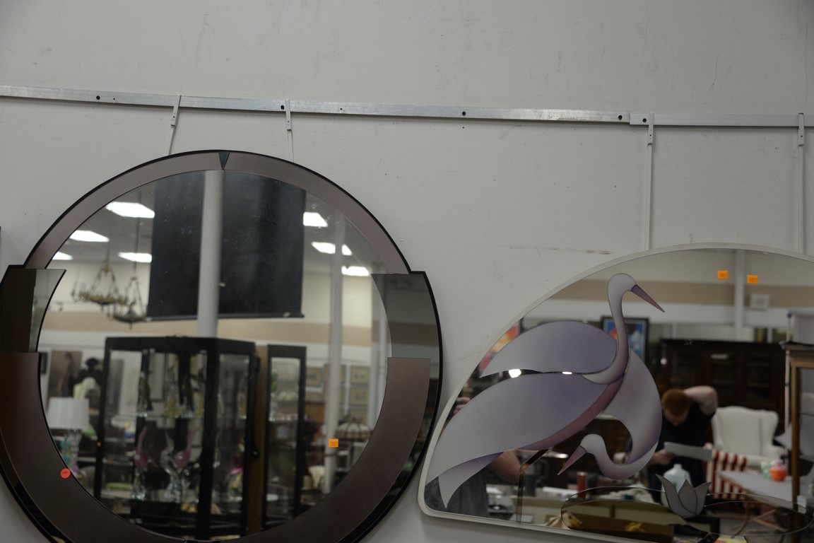 Three David Marshall art glass mirrors including two round with three dimensional mirrors dia. 35 1/2 in. and a semicircle with flamingos lg. 49 1/2 in.