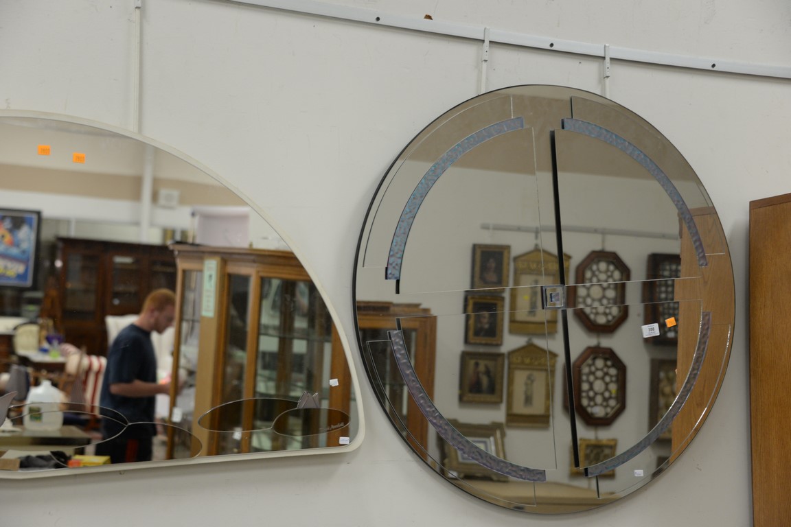 Lot 358: Three David Marshall art glass mirrors including two round with three dimensional mirrors dia. 35 1/2 in. and a semicircle with flam…