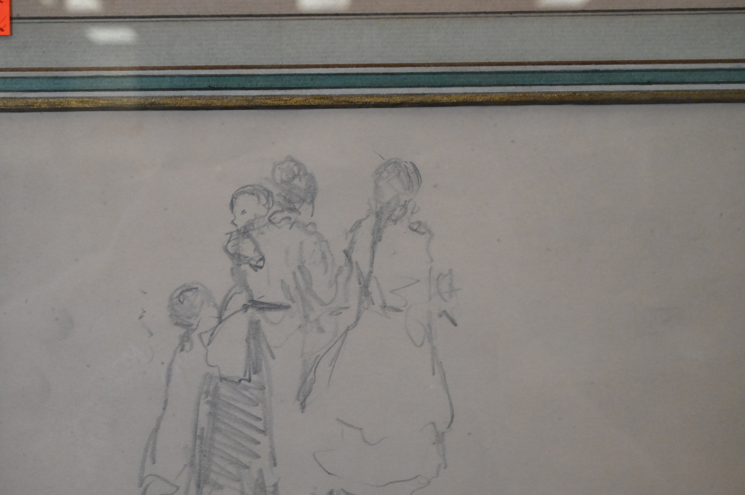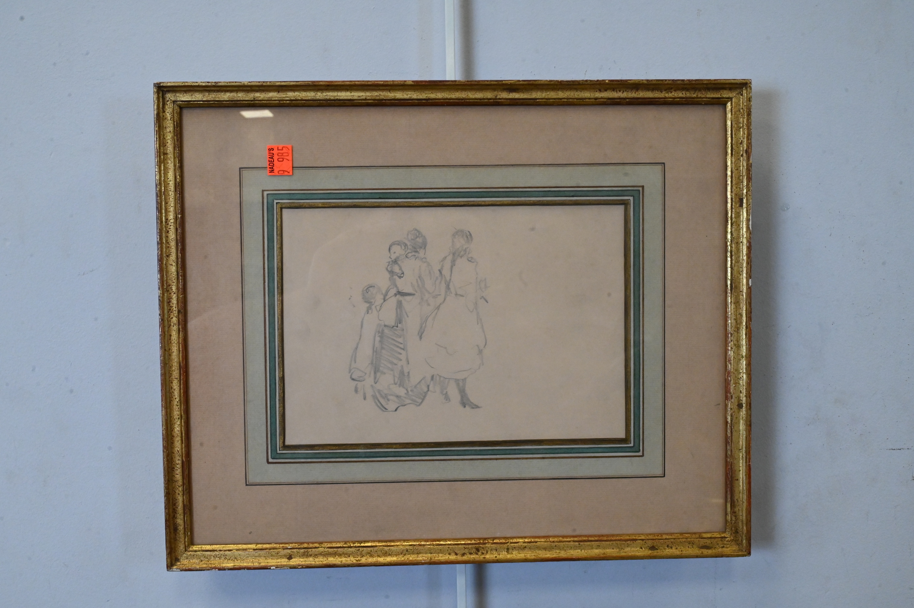 Light graphite sketch depicting a small group of figures, including a woman holding a child and two additional children at her side, rendered with quick, economical strokes characteristic of late 19th- to early 20th-century Impressionist draftsmanship; the loose handling and emphasis on gesture recall preparatory studies by Camille Pissarro and his circle