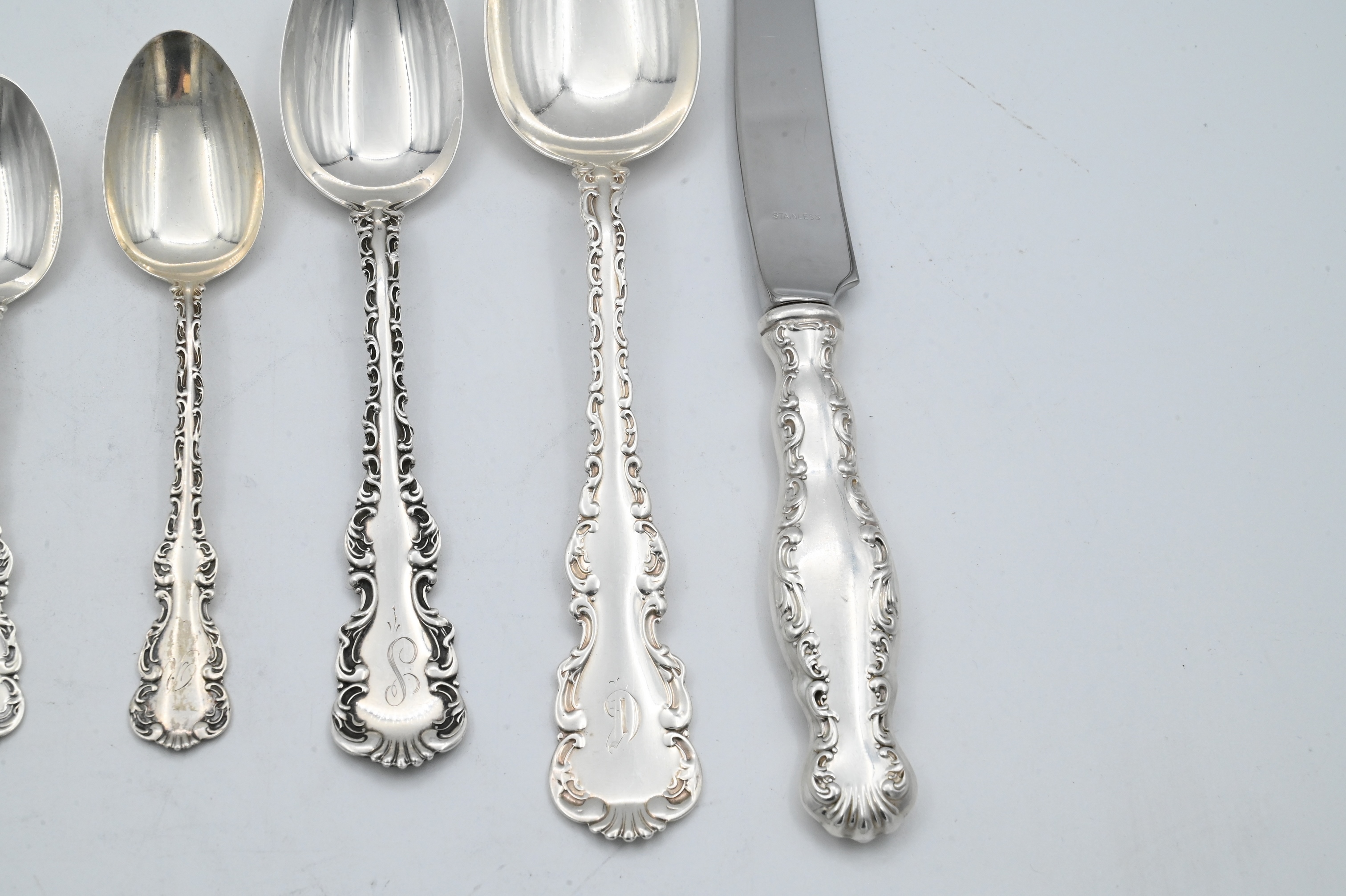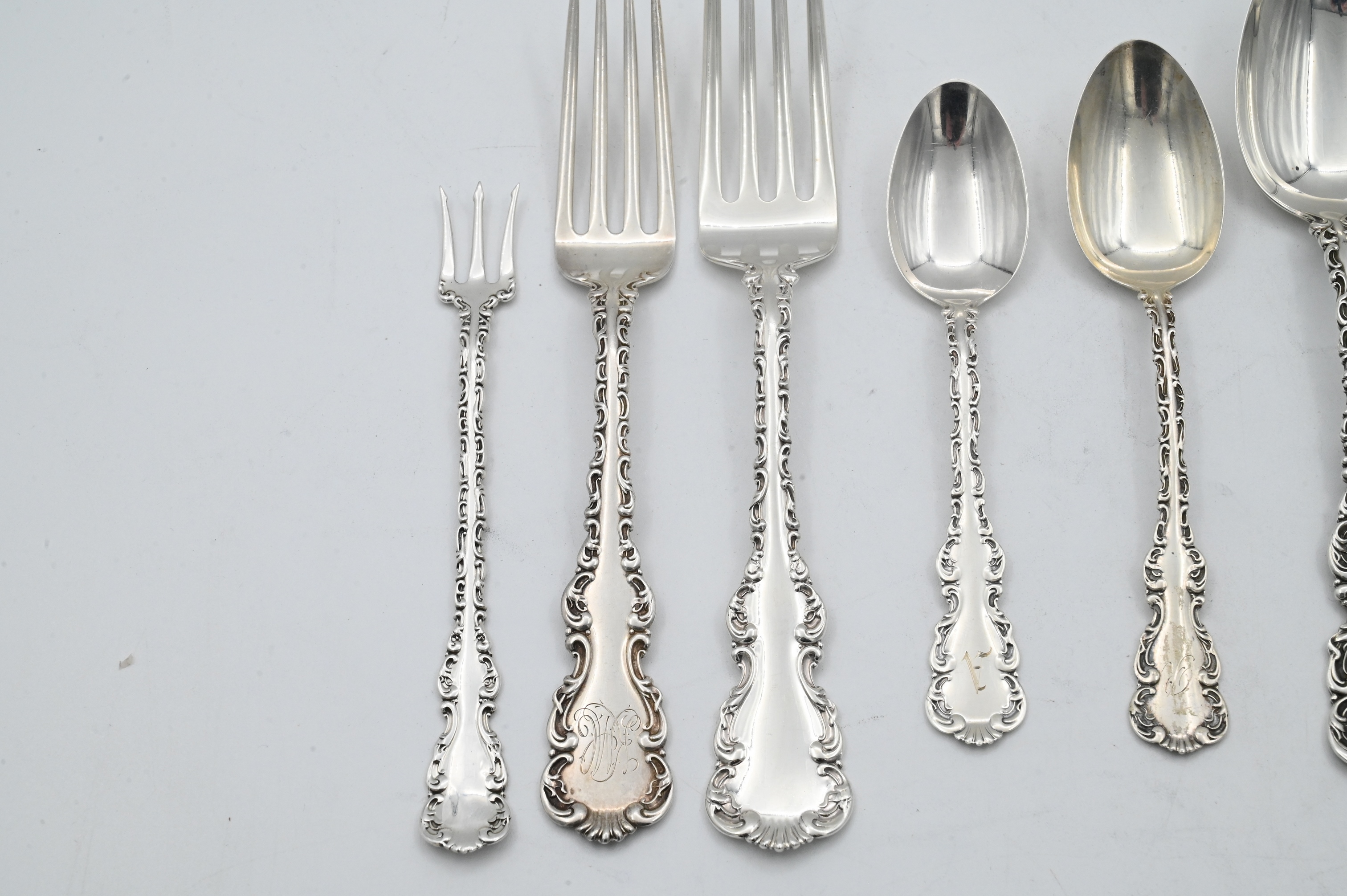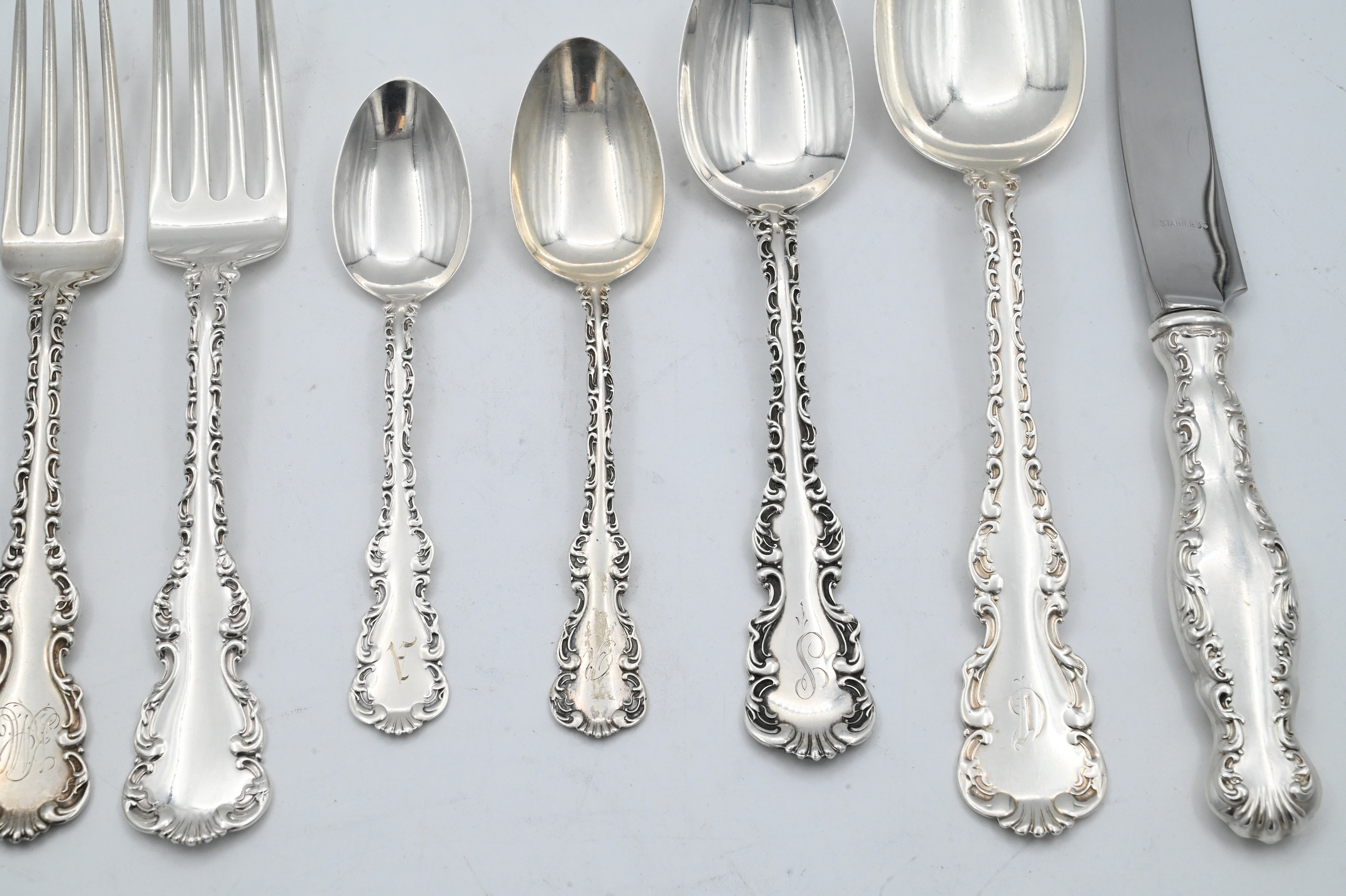 to include 14 dinner forks, 16 luncheon forks, 6 cocktail forks, 4 place spoons, 6 tablespoons, 1 soup spoon, 27 teaspoons, 3 bouillon spoons, 1 demi spoon, 3 dessert spoons, 8 dinner knives, 16 butter knives, 3 meat knives, 4 ladles, 1 sugar tong, 2 sugar spoons, 1 pie server, 16 serving pieces, some monogrammed