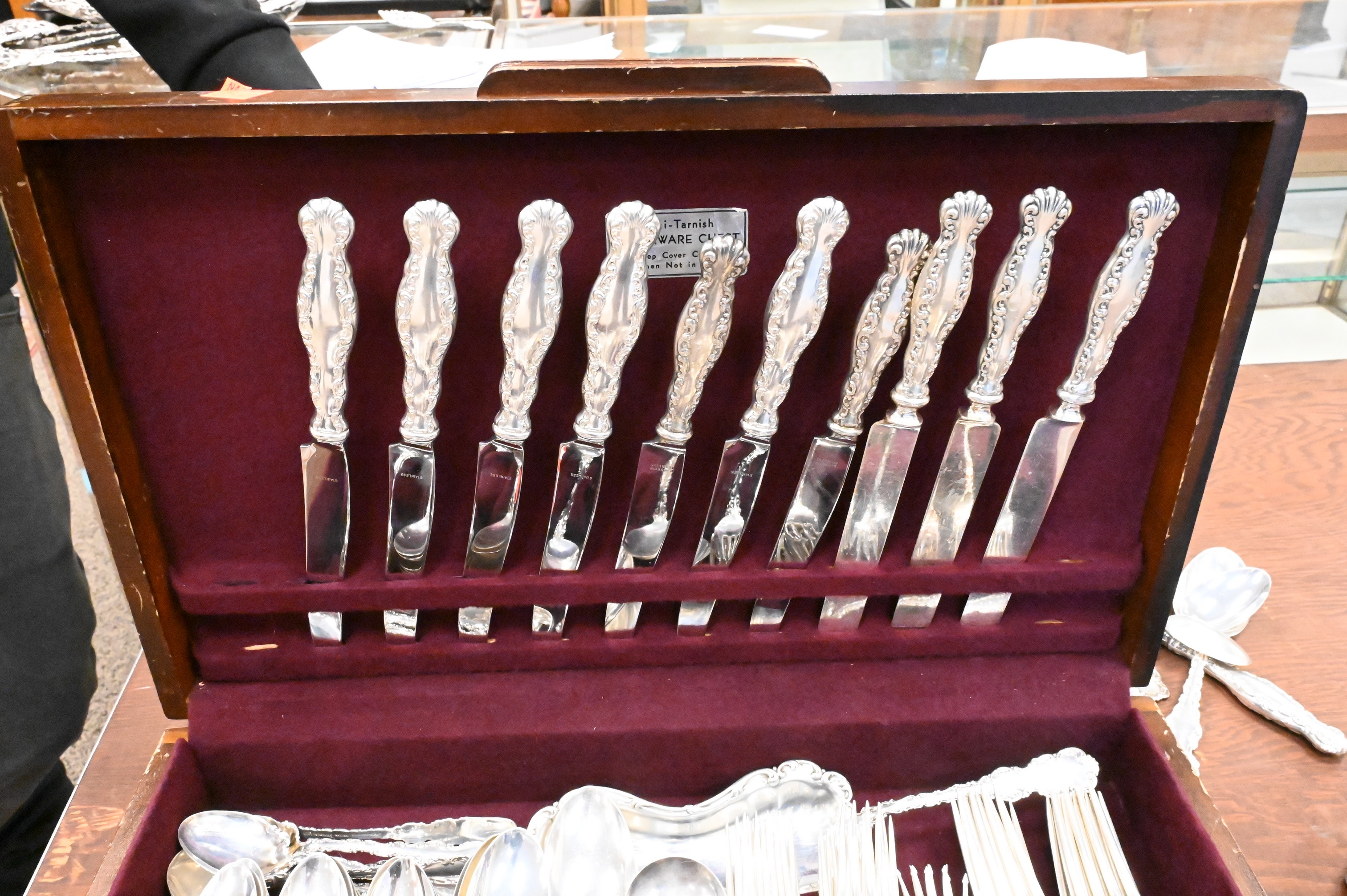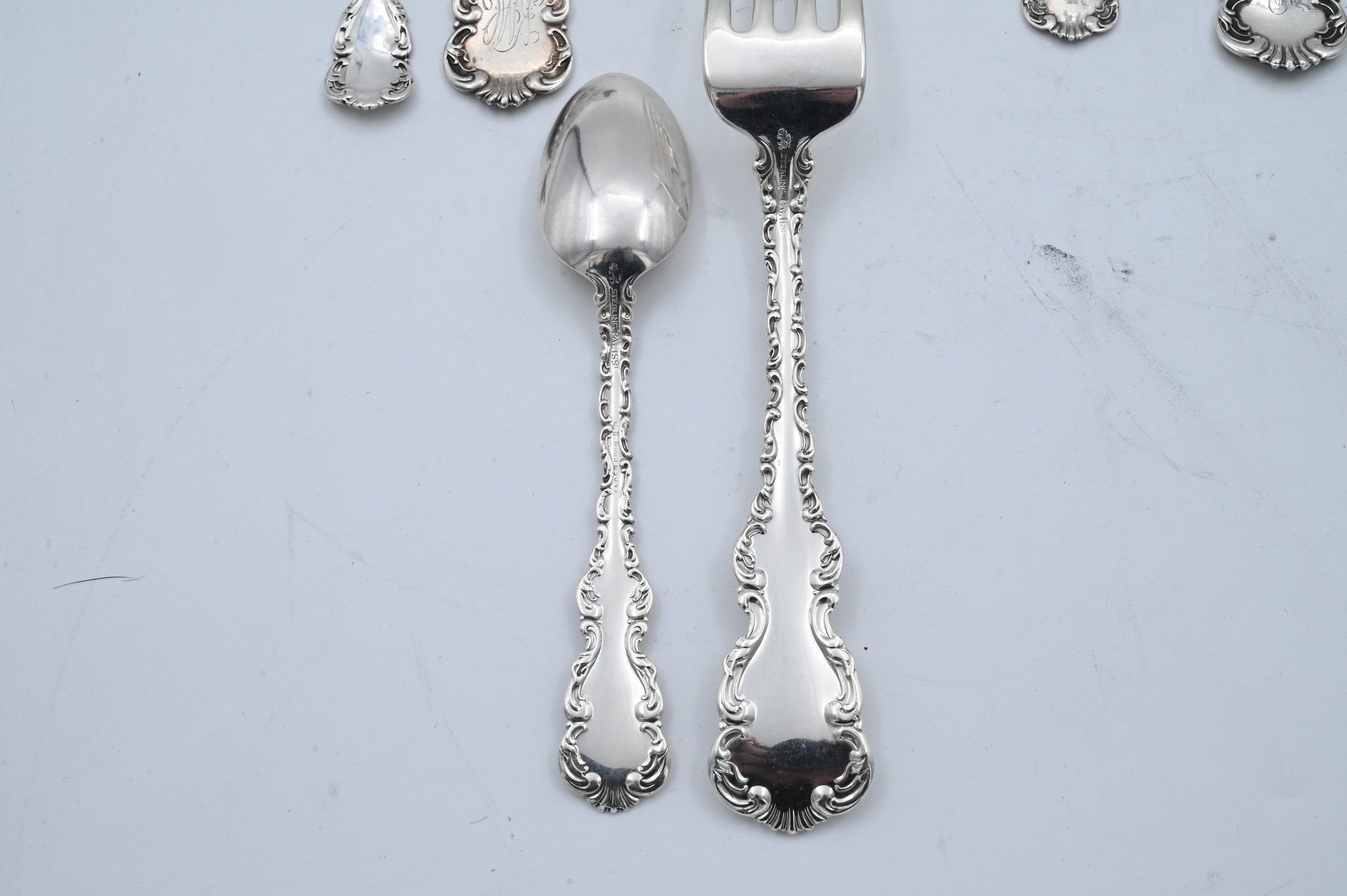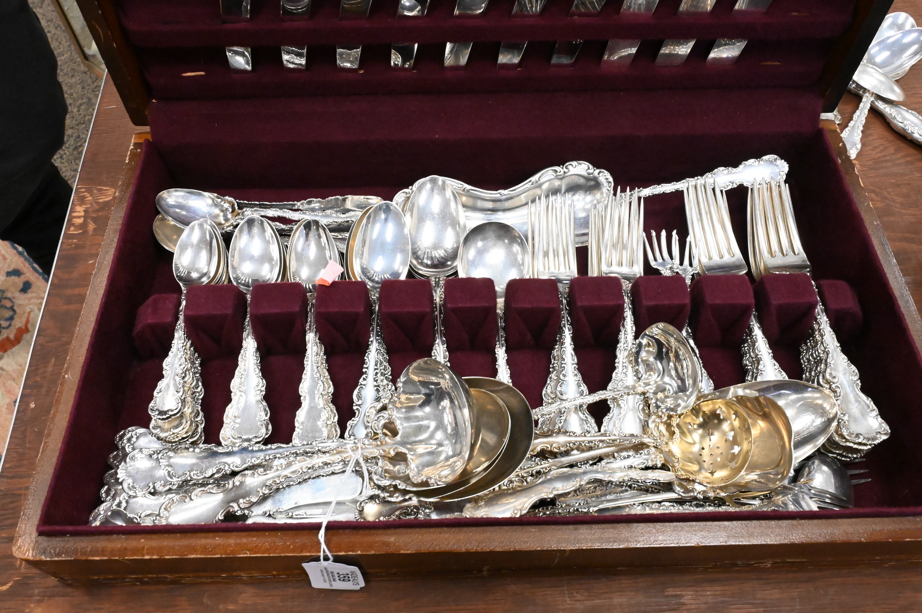 to include 14 dinner forks, 16 luncheon forks, 6 cocktail forks, 4 place spoons, 6 tablespoons, 1 soup spoon, 27 teaspoons, 3 bouillon spoons, 1 demi spoon, 3 dessert spoons, 8 dinner knives, 16 butter knives, 3 meat knives, 4 ladles, 1 sugar tong, 2 sugar spoons, 1 pie server, 16 serving pieces, some monogrammed