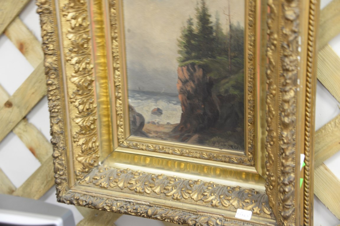 Lot 359: A.C. Bates oil on canvas of cliff on ocean’s edge, in thick gold frame, signed lower right A.C. Bates. 9 1/2 x 6 1/2