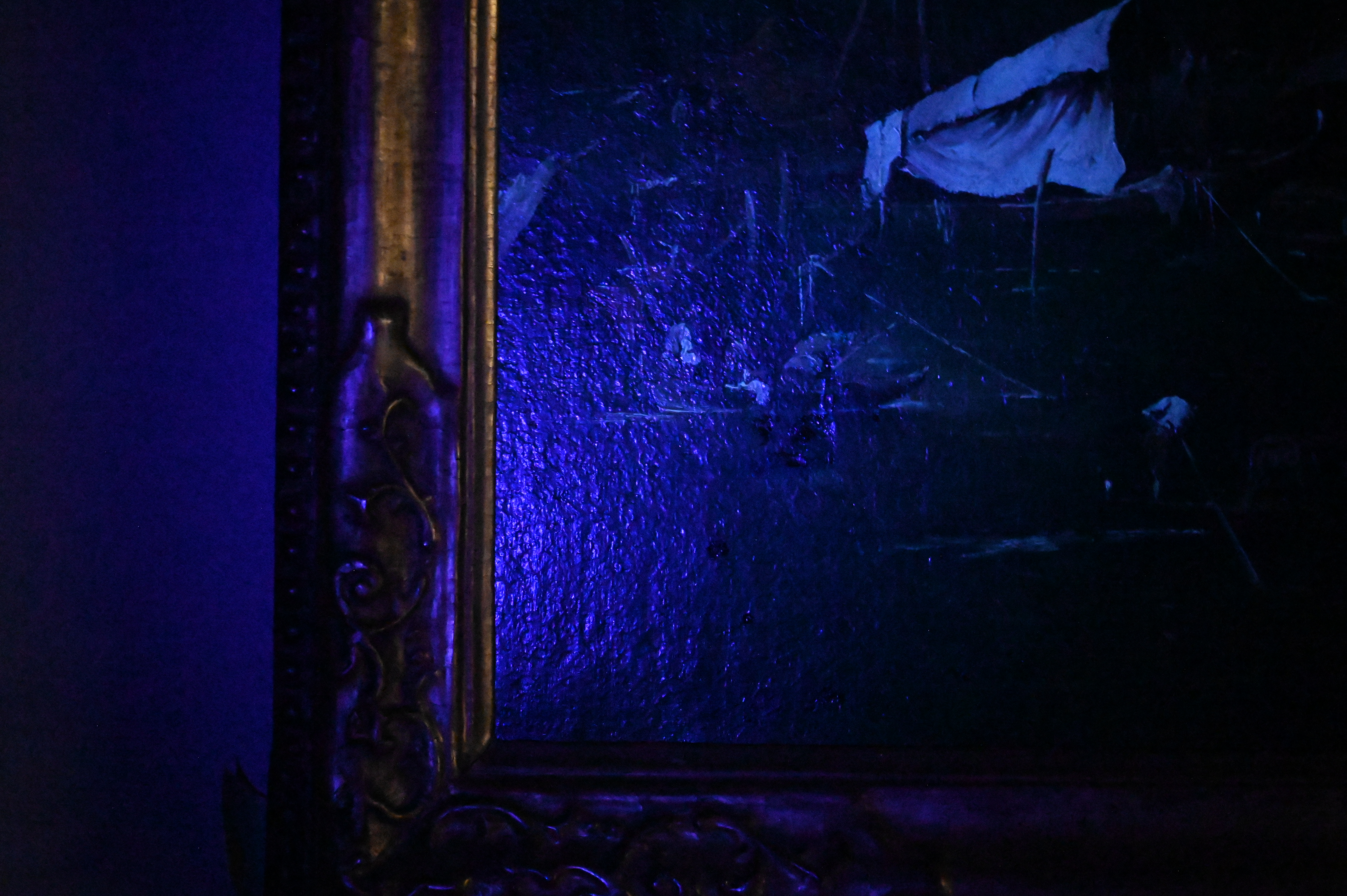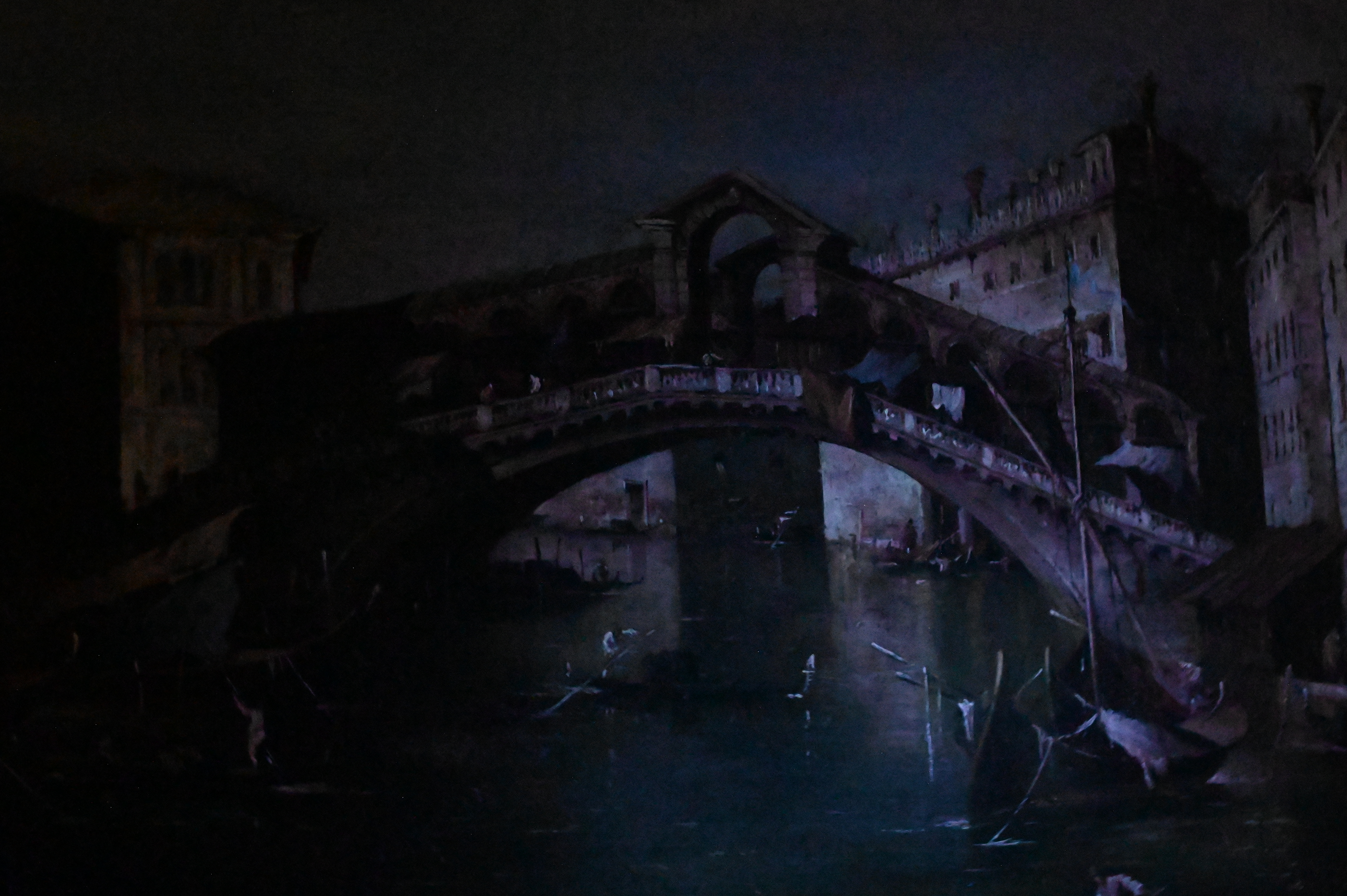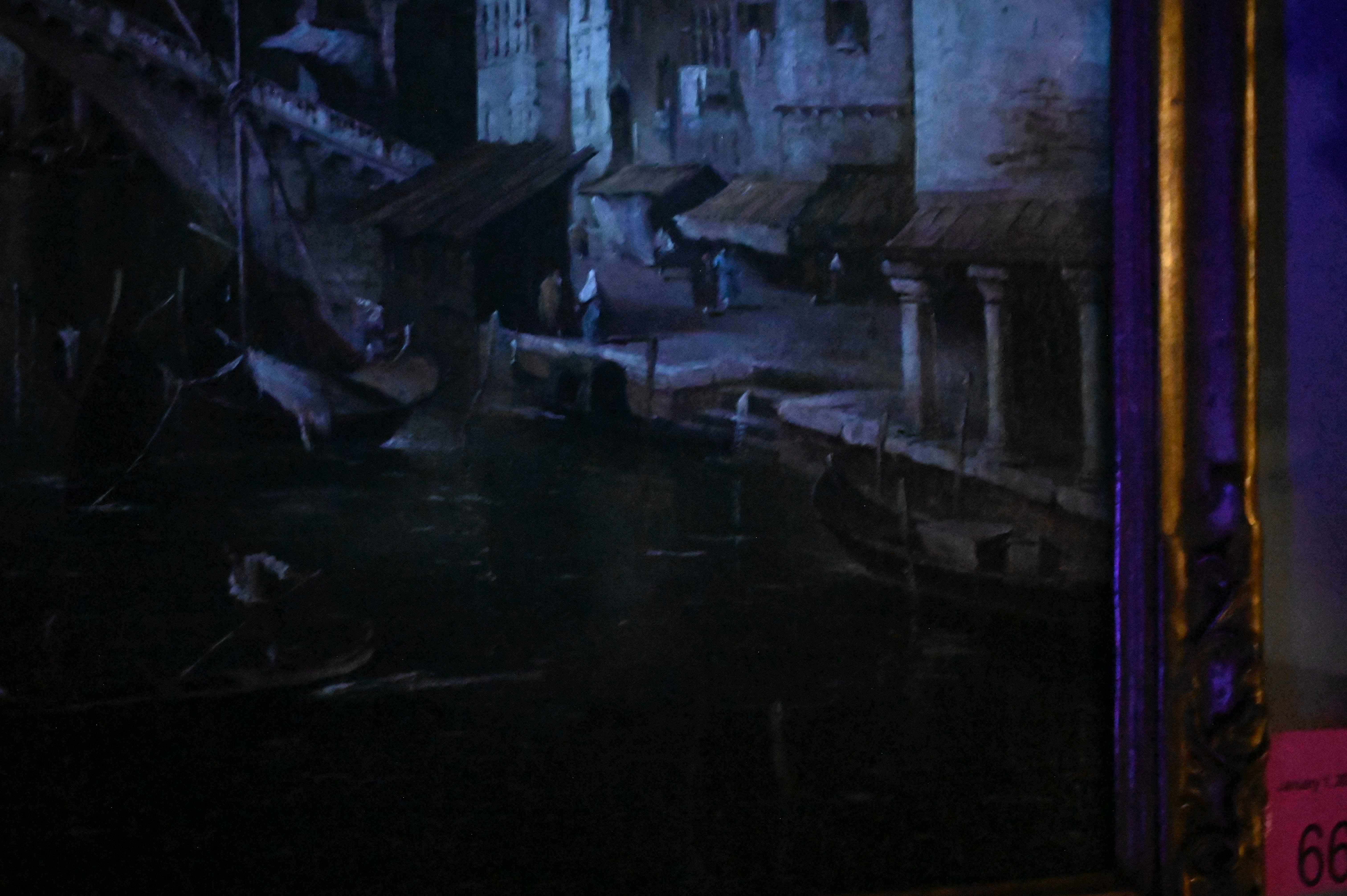 Canvas relined and restretched. inpainting , in water, building and corners. Surface grime. craquelure.