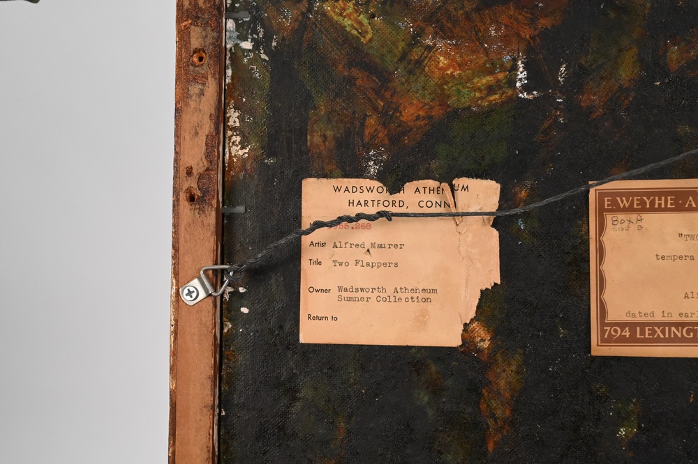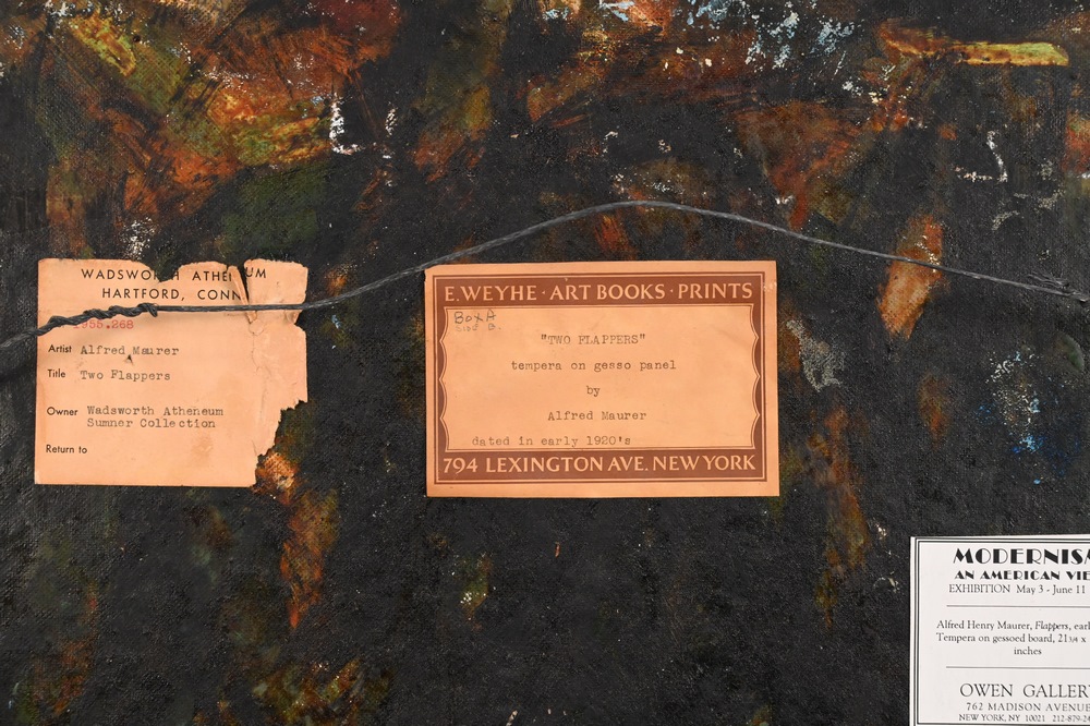 Alfred Henry Maurer (1868 – 1932), Flappers, executed circa 1925 – 1927, tempera on gessoed board, signed top right A. H. Maurer, signed again on the reverse, 21 3/4″ x 18 1/8″. Provenance: Wadsworth Atheneum, Connecticut; E. Weyhe Gallery, New York, Ella Gallup Sumner and Mary Catlin Sumner Collection. Sold at Christie’s 11/30/1990, #189. Exhibited: Minneapolis, Walker Art Center, A.H. Maurer, September – October 1949, no. 42, (this exhibition later travelled to New York, Whitney Museum of American Art, November – December 1949).