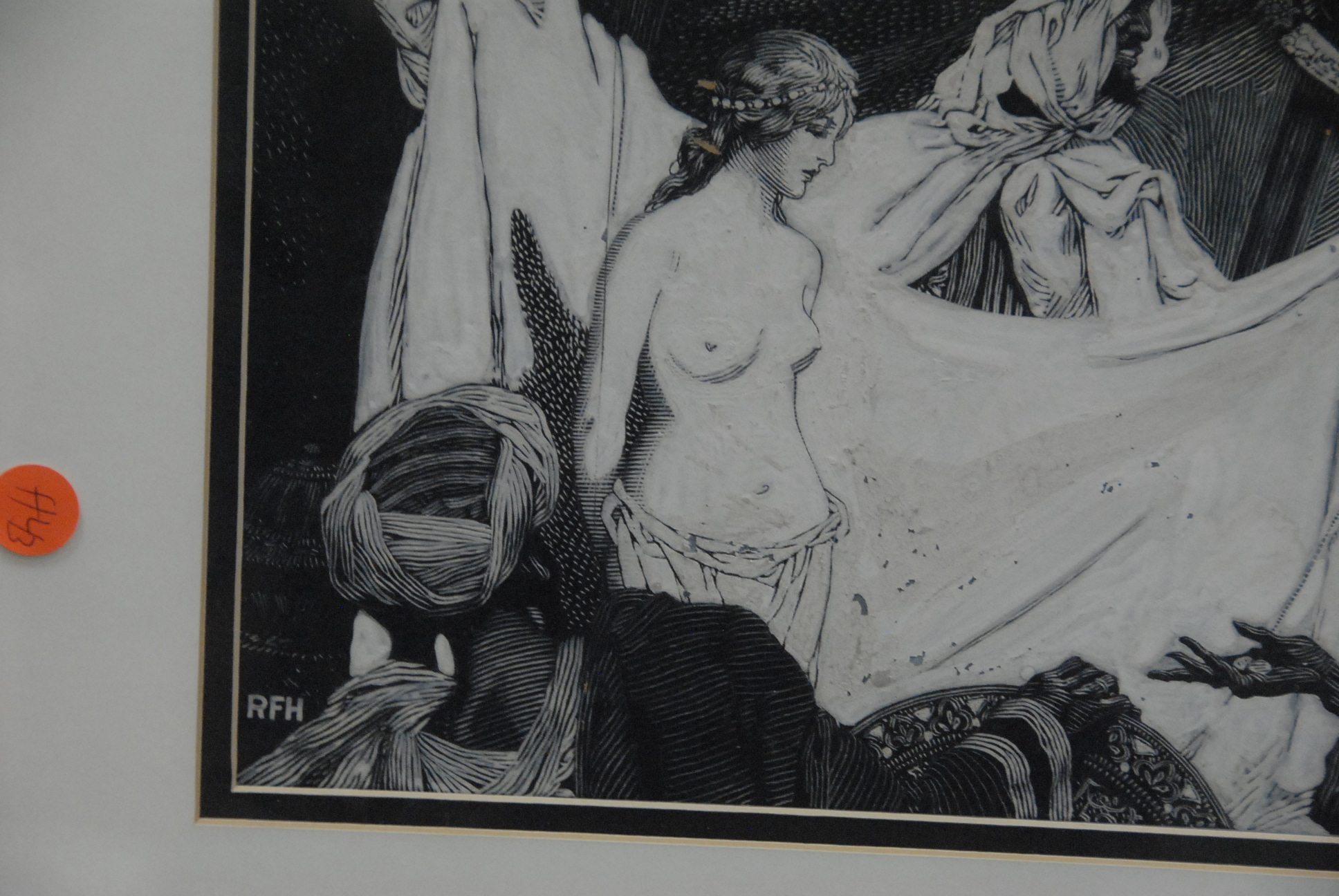 Black and white multimedia painting initialed lower left RFH, 8 x 6.