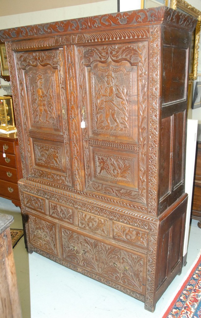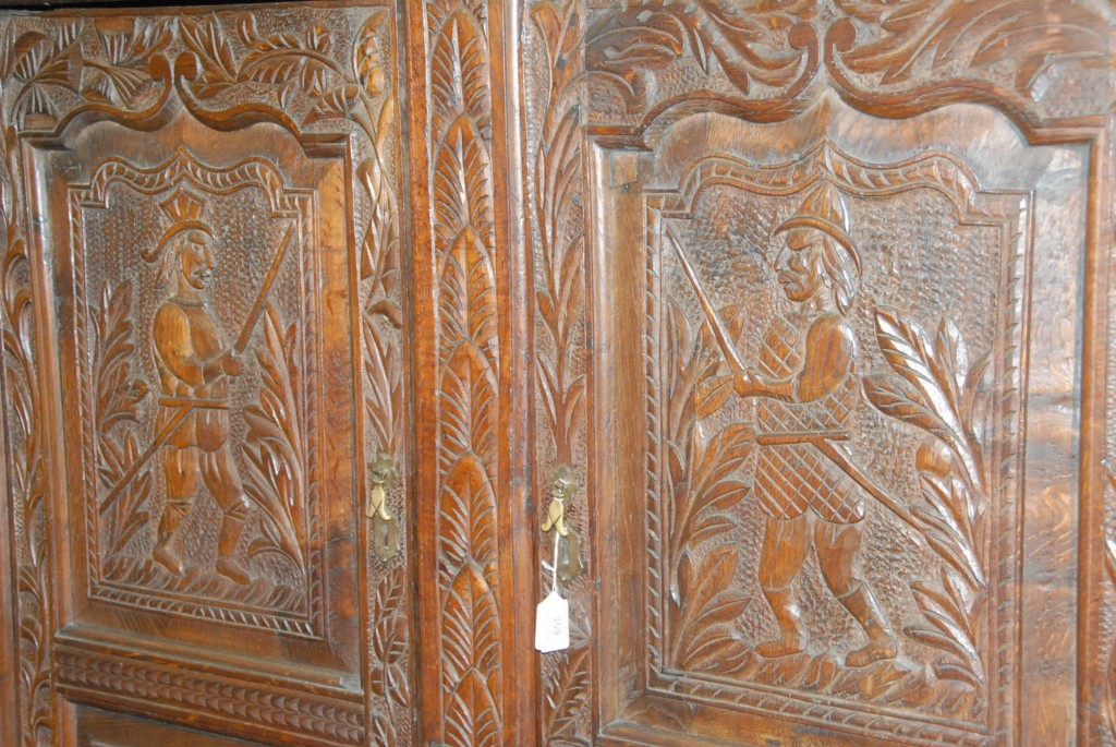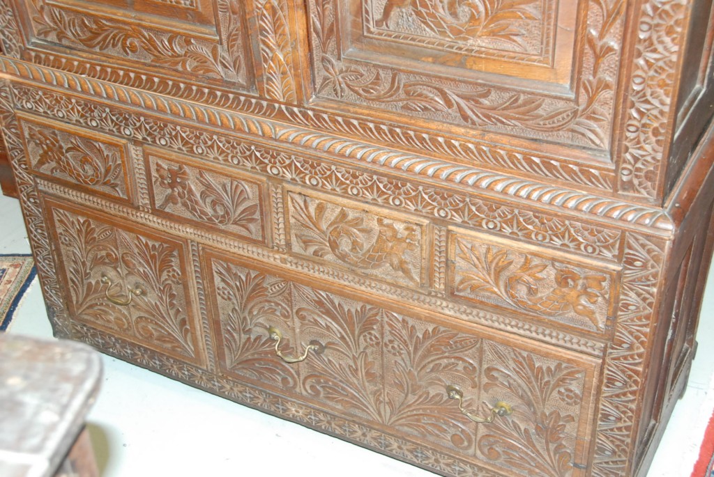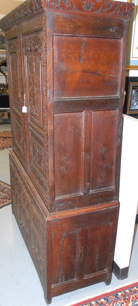 Continental oak cabinet in two parts with two carved doors over carved drawers, 17th to 18th century, dated 1617. height 75in. width 50in.