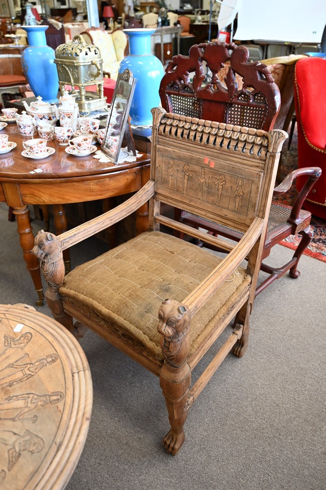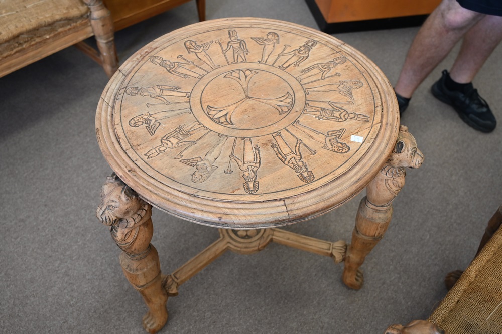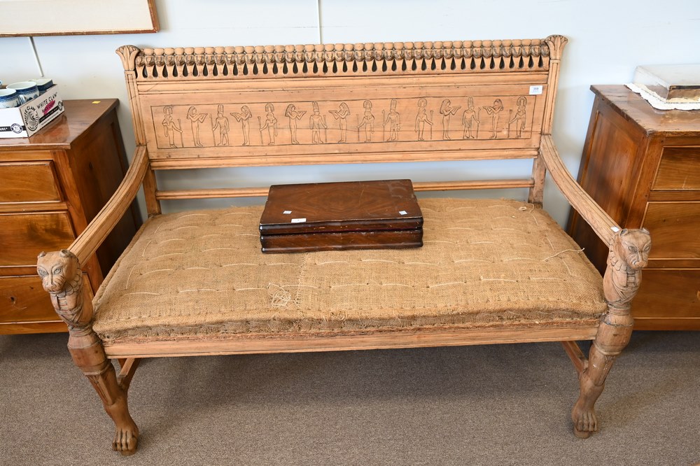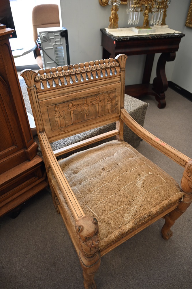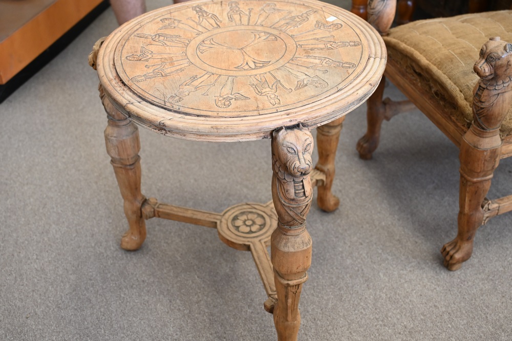 Lot 359: Four Piece Egyptian Revival Set, having two armchairs, loveseat, and round center table, all with cut hand rests and supports (in need of upholstery and finish), table diameter 25 inches.