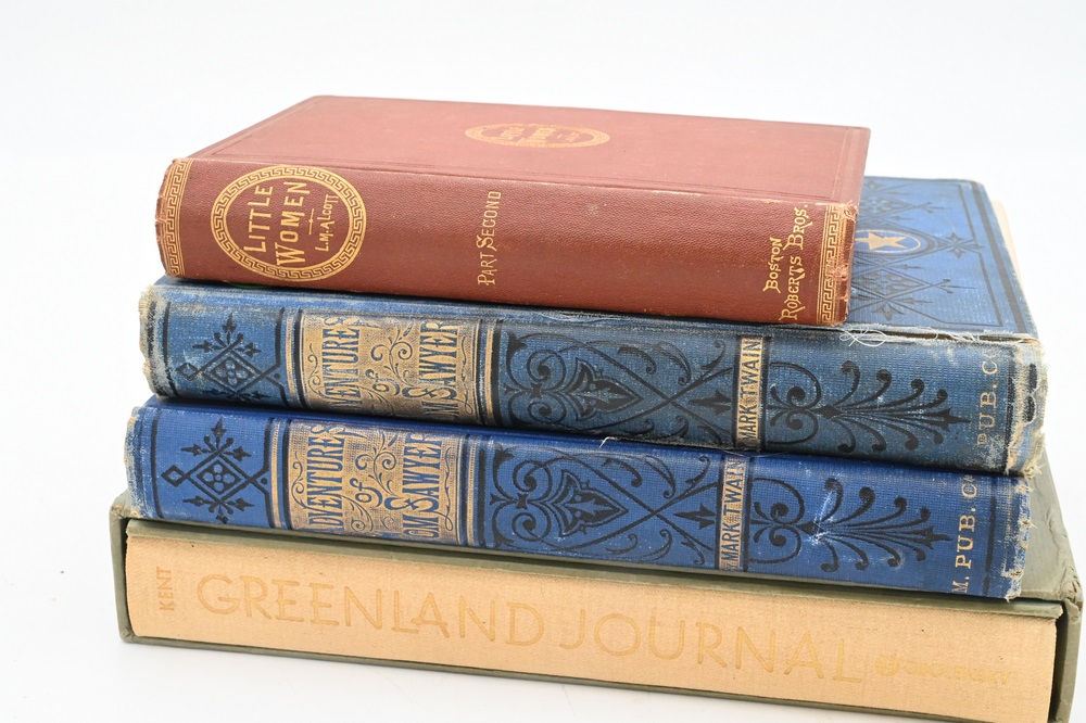 Lot 359: Group of Four Books, to include two copies of The Adventures of Tom Sawyer, 1875; Little Women by L.M.Alcott; along with Greenland Journal by Kent, Provenance: Fifty Year Personal Collection of Clocks and American Antiques from Thomas Bailey, Manchester, Connecticut.