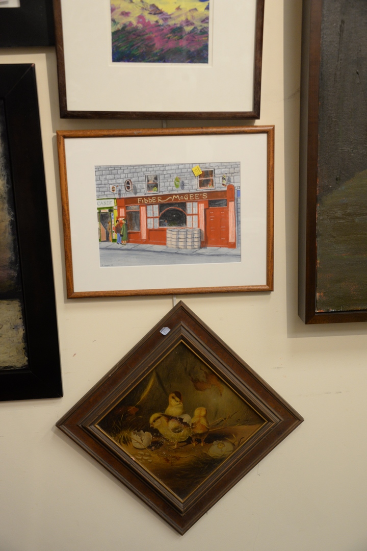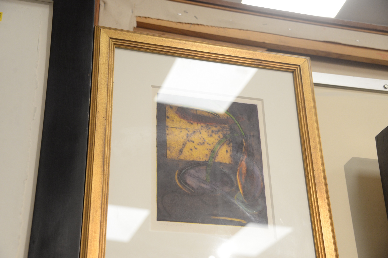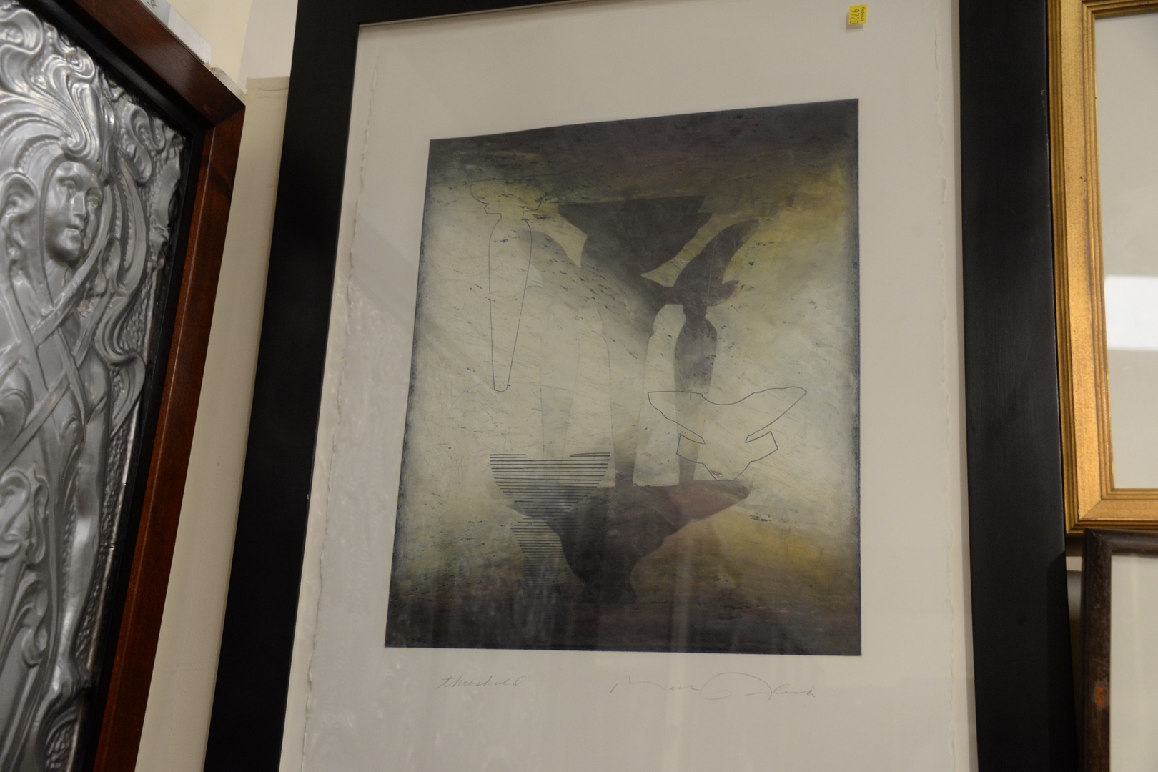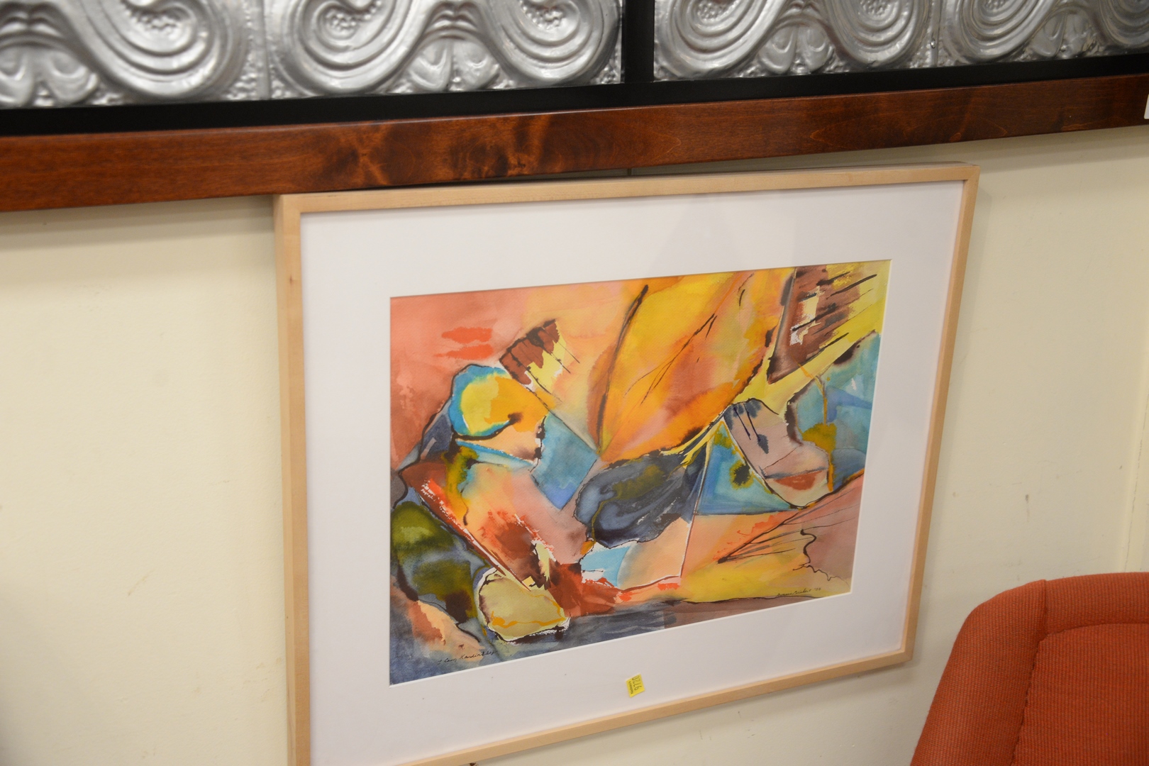 Lot 359: Group of Seven Contemporary Paintings to include J. Magee, watercolor, store front; Bennie Birkert?, abstract watercolor; Mary Schaefer Reynolds, “Float on the Water”, colored engraving; “Still Life with Window”, signed illegibly; chicken’s, unsigned; two oil abstracts, signed illegibly, “Sovereign” and “Threshold” on Aquarelle Arches paper; largest sight size 20″ x 18″.