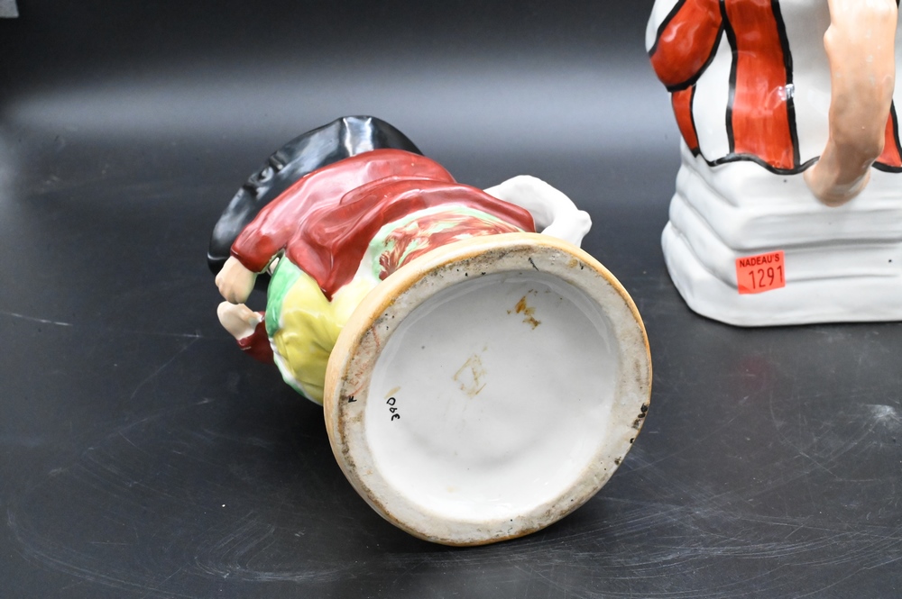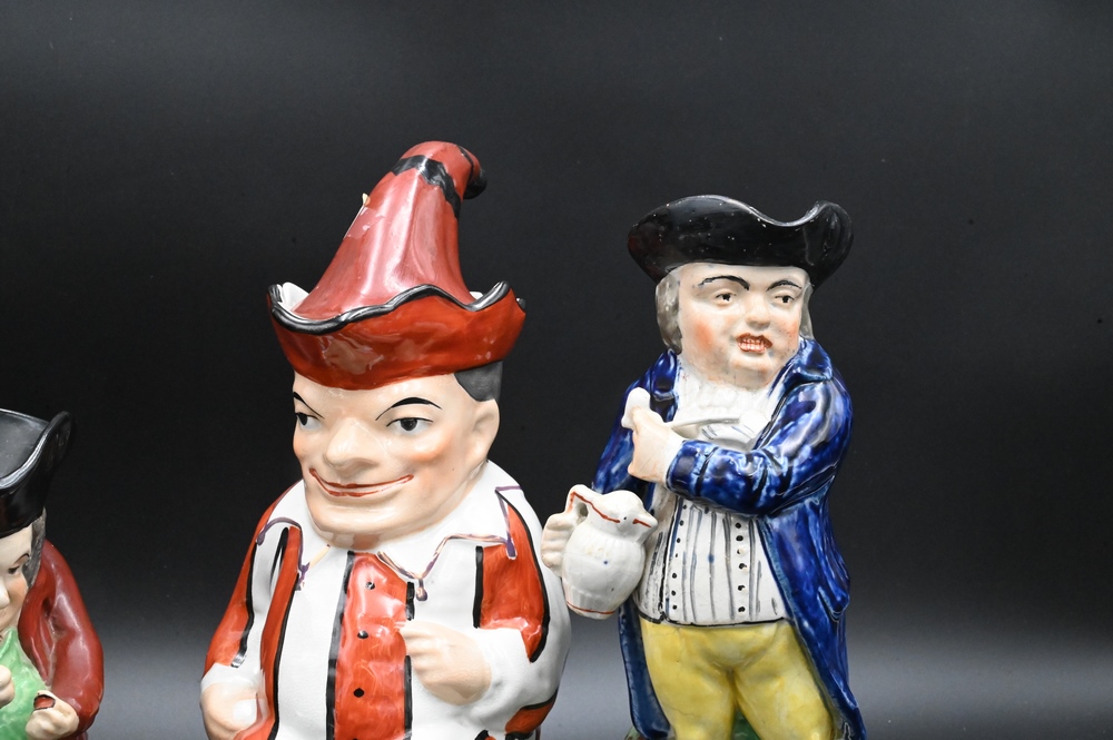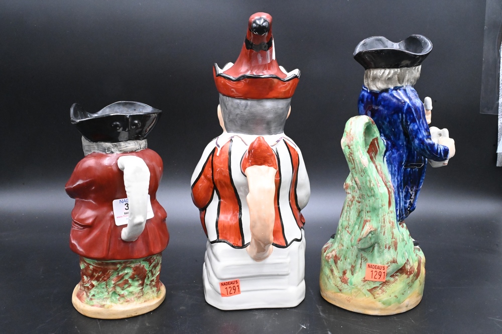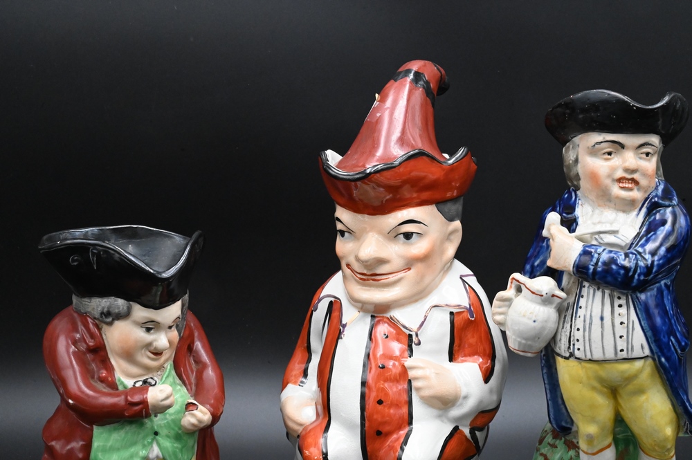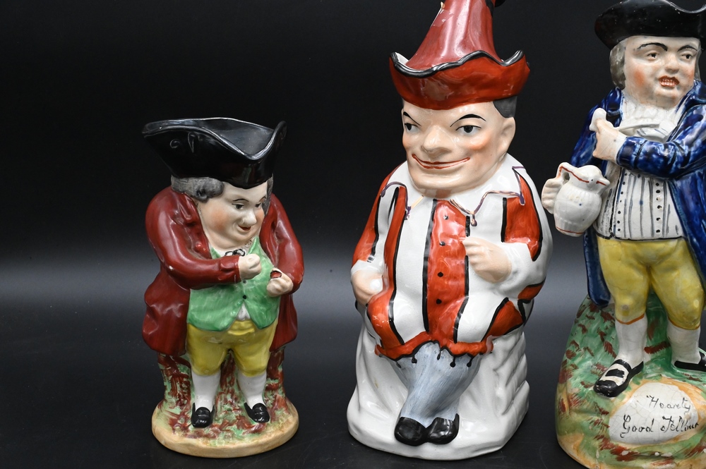 Group of Three Staffordshire Toby Jugs, to include jester with hat, hearty good fellow along with snuff tanker, tallest 11 1/2 inches.