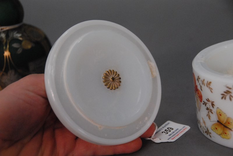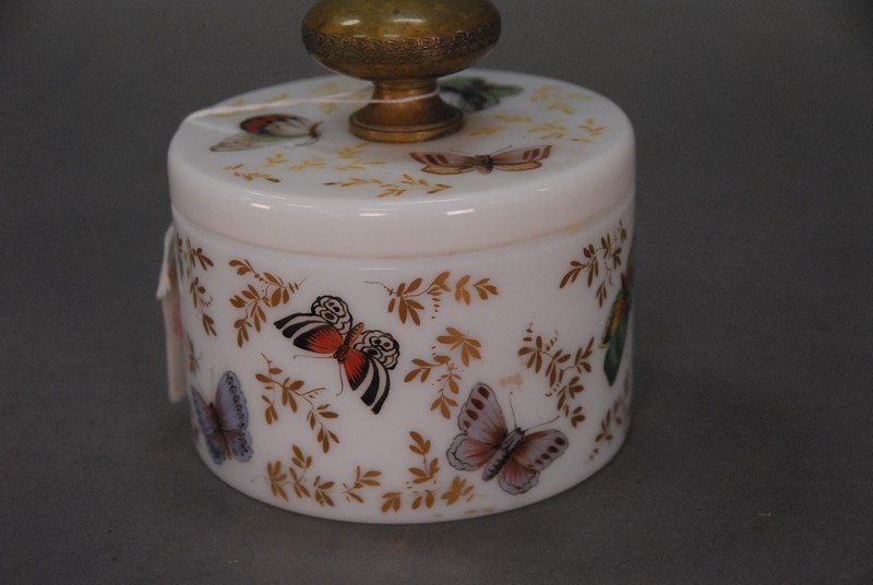 Lot 359: Guerlain French opaline crystal powder jar with bronze handled cover, all having enamel decoration, by R. Noirot. ht. 4 1/2in.