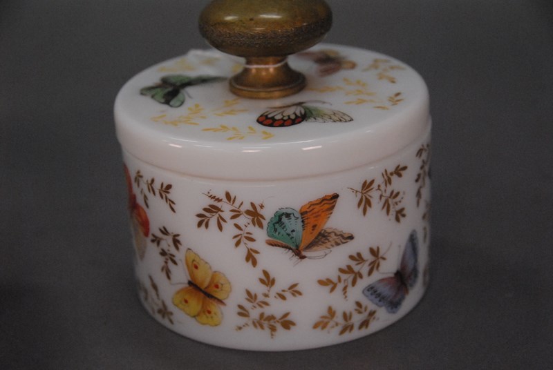 Guerlain French opaline crystal powder jar with bronze handled cover, all having enamel decoration, by R. Noirot. ht. 4 1/2in.