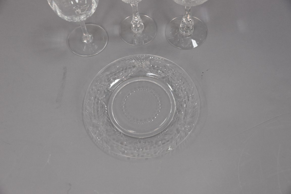 Hawkes crystal group to include set of six plates dia. 8in., seven white wine glasses, three red wine glasses, small bowl, and miscellaneous stemmed glass along with four Baccarat stemmed glasses, twenty-two total pieces. stem ht. 6in. to 6 3/4in.