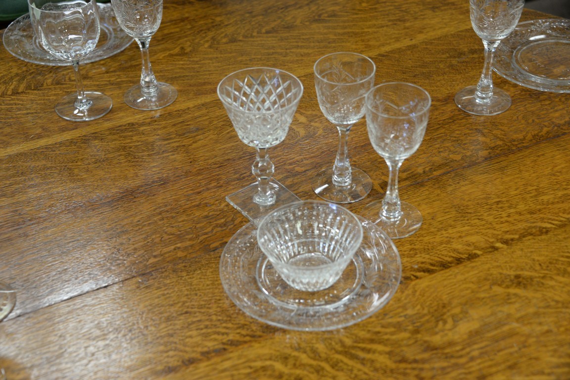 Lot 359: Hawkes crystal group to include set of six plates dia. 8in., seven white wine glasses, three red wine glasses, small bowl, and mis…