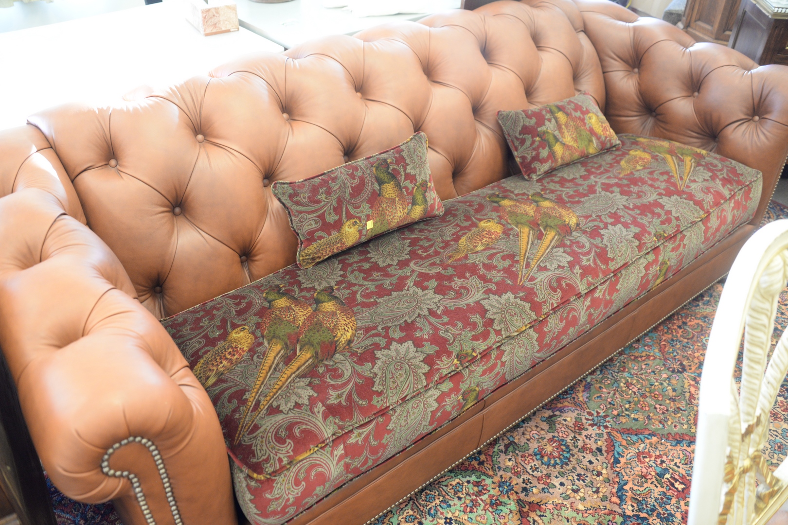 Leather Chesterfield Style Sofa, with cloth upholstered seat, like new condition, height 32 inches, length 90 inches.