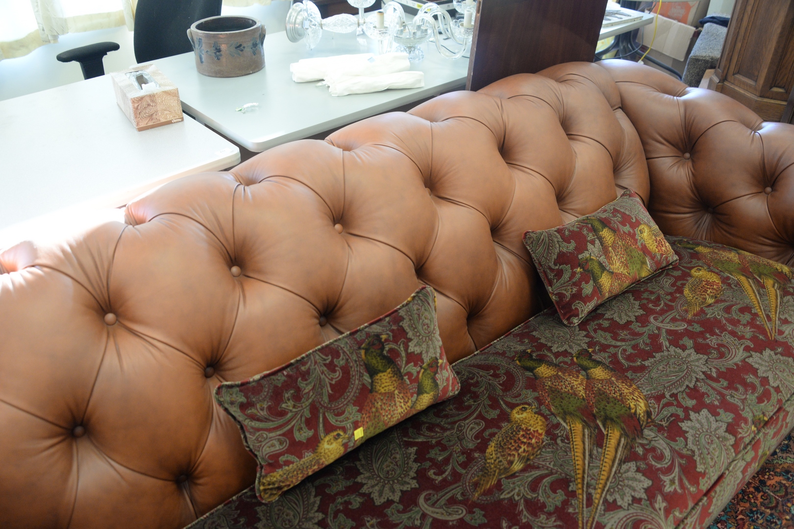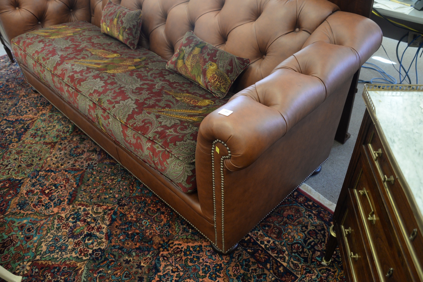 Lot 359: Leather Chesterfield Style Sofa, with cloth upholstered seat, like new condition, height 32 inches, length 90 inches.