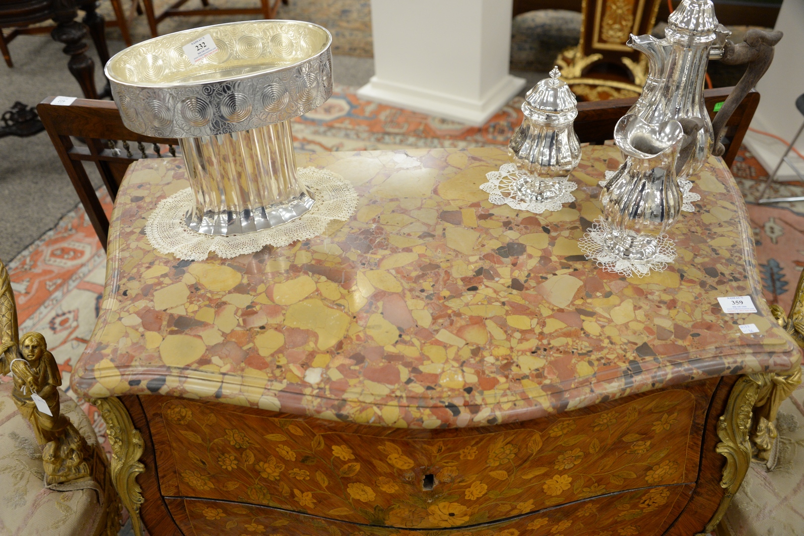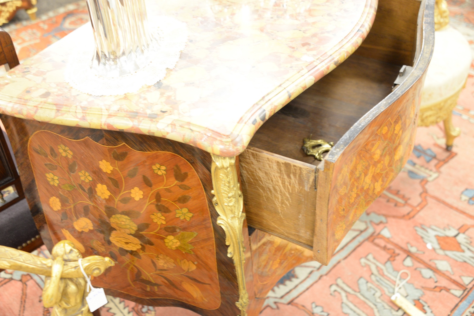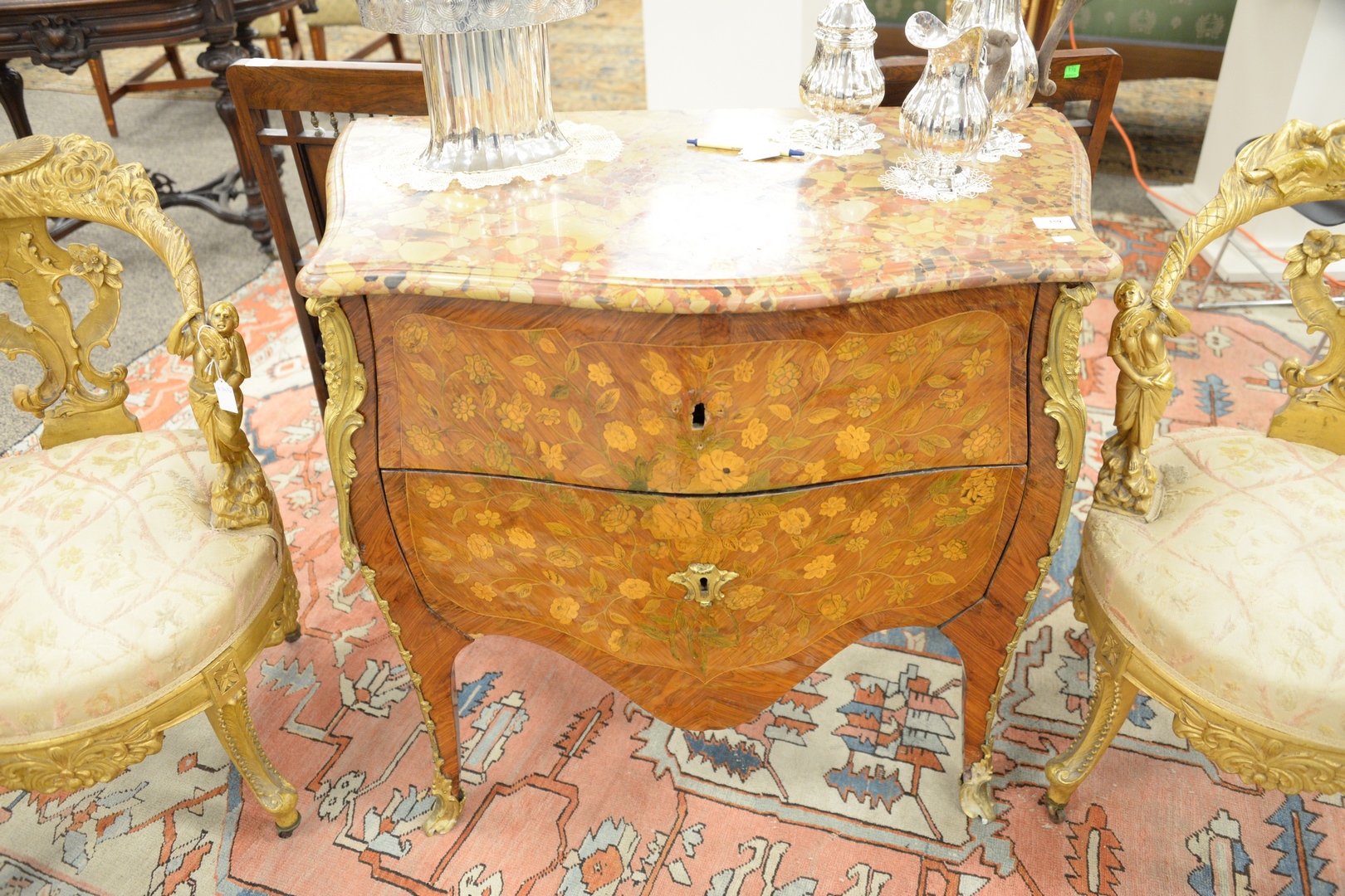 Lot 359: Louis XV Ormolu-Mounted Kingwood, Tulipwood and Marquetry Commode having serpentine breche d’alep marble top, above two drawers elab…