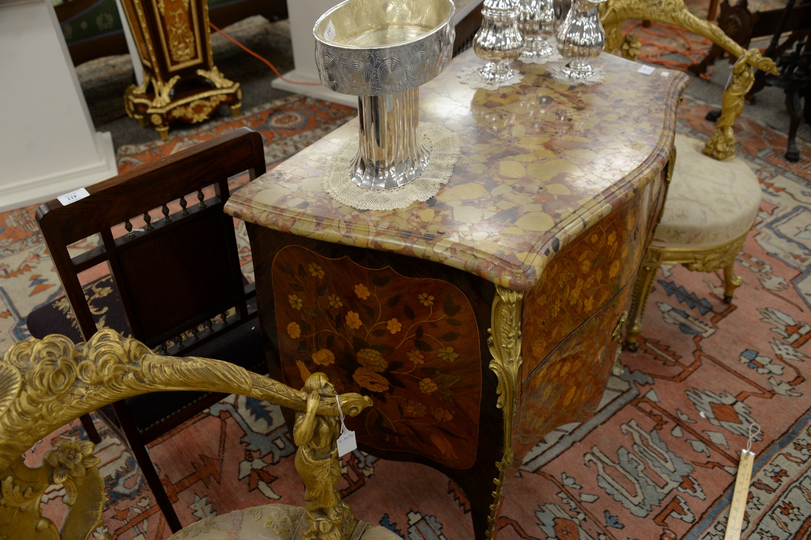 having serpentine breche d’alep marble top, above two drawers elaborately inlaid with flowers, the sides similarly decorated, the back with remnants of an old paper label Et Chenue a la Croix de Lorraine/S.A.R.L. Capitol 800,000 Francs, 5 Rue de la Terrasse, Paris 17, and with … inscription, and with printed label MMD Hermanos, to underside of marble at back, stamped Roussel
