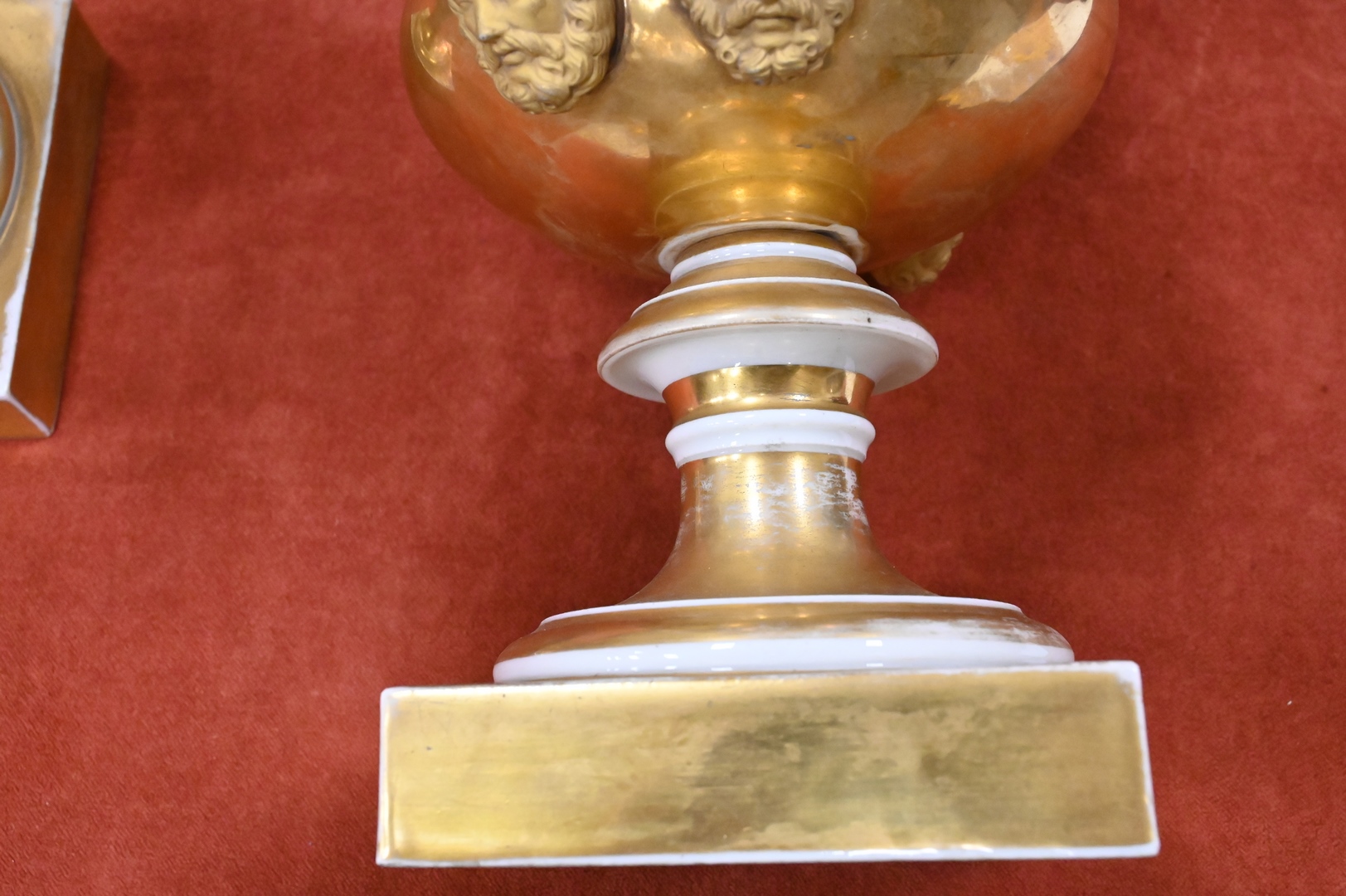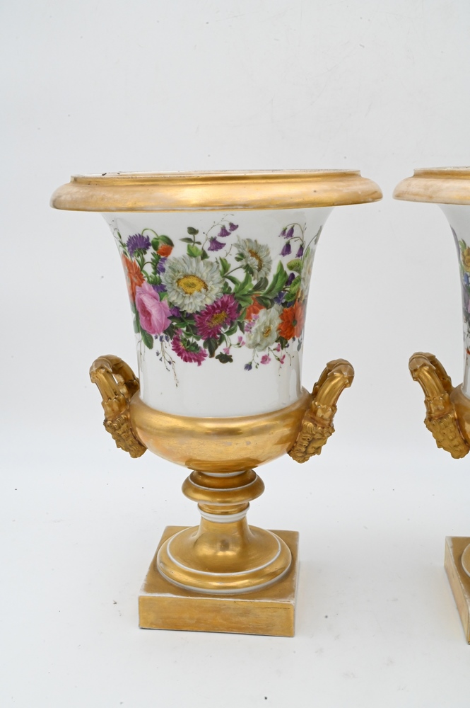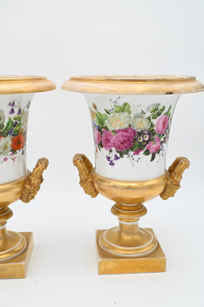 Pair of French Porcelain Urns, having painted wild flowers and gilt gold mask handles on square base, height 13 1/4 inches.