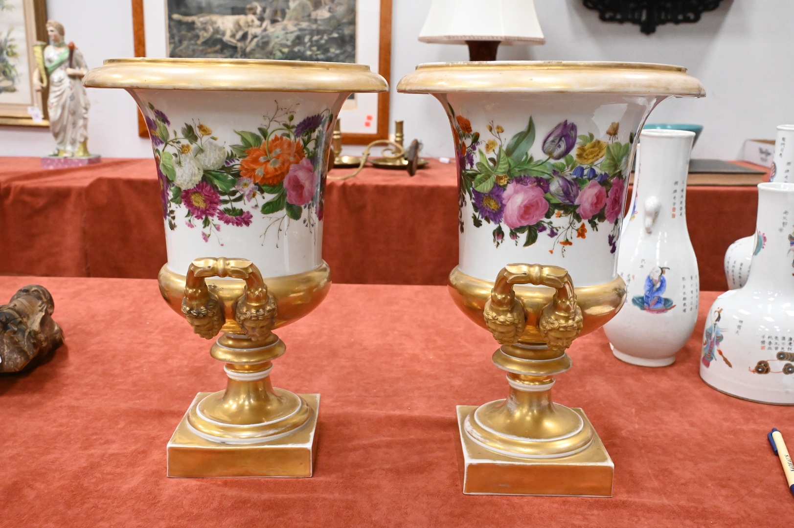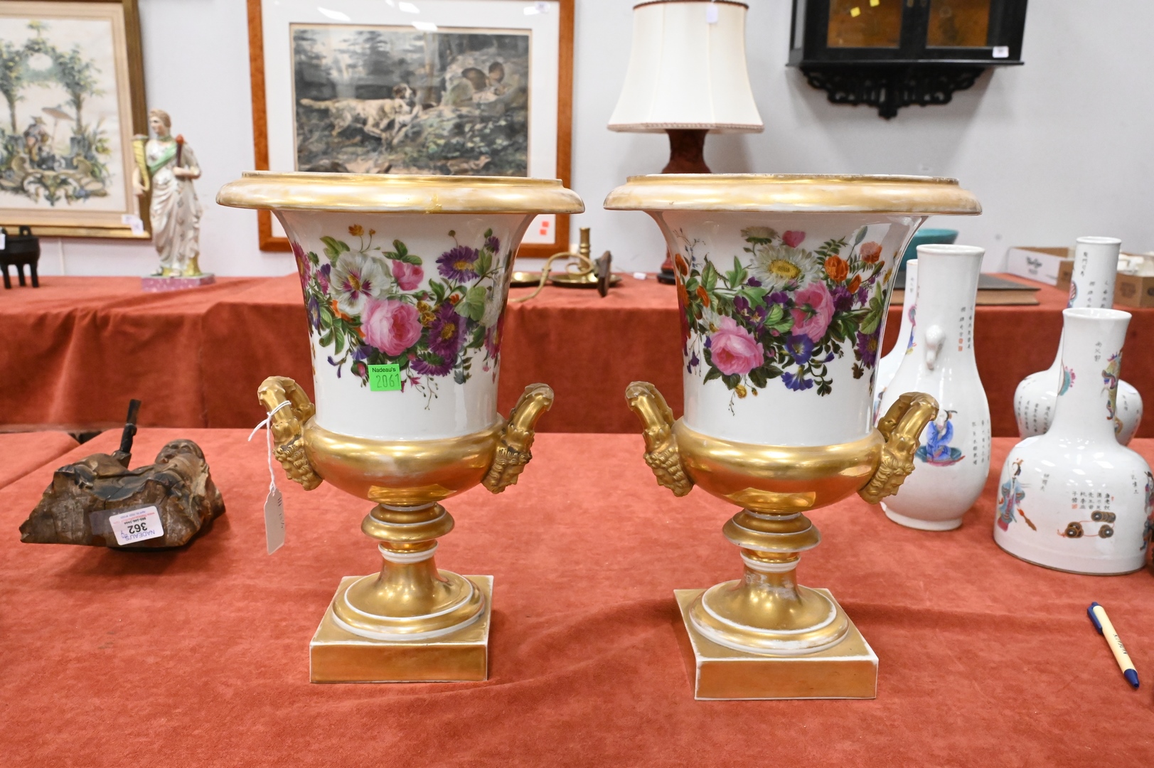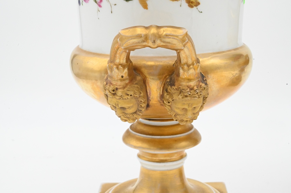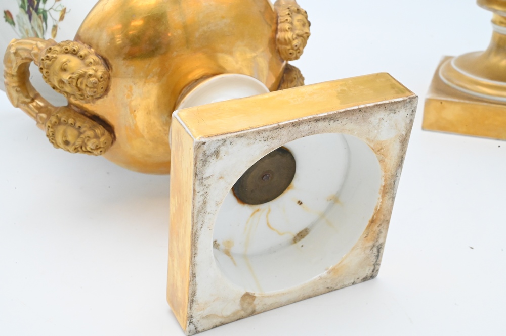 Lot 359: Pair of French Porcelain Urns, having painted wild flowers and gilt gold mask handles on square base, height 13 1/4 inches.
