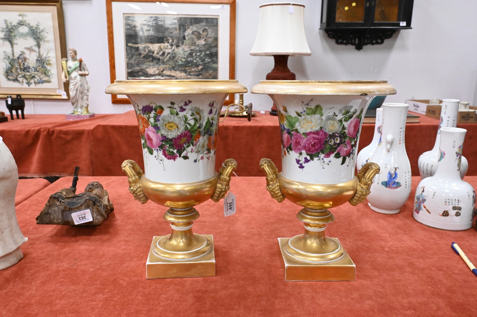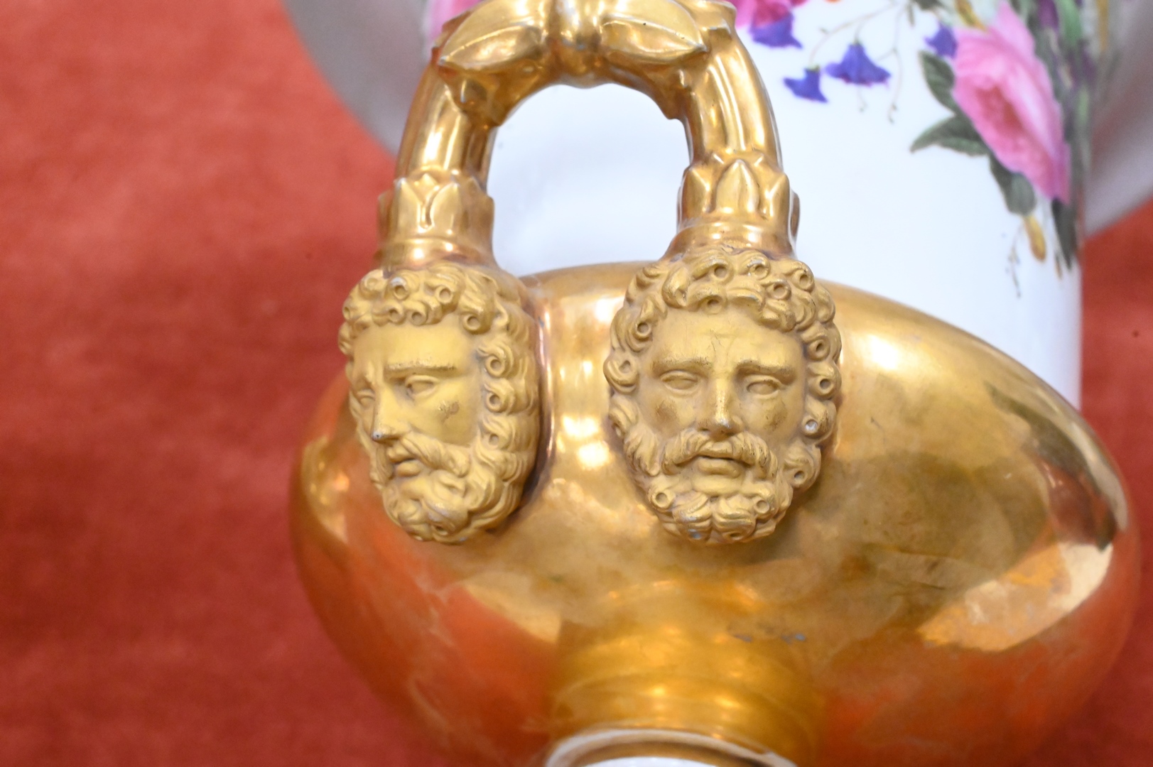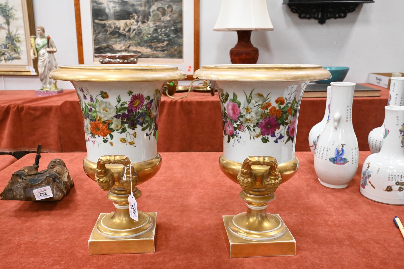 Lot 359: Pair of French Porcelain Urns, having painted wild flowers and gilt gold mask handles on square base, height 13 1/4 inches.
