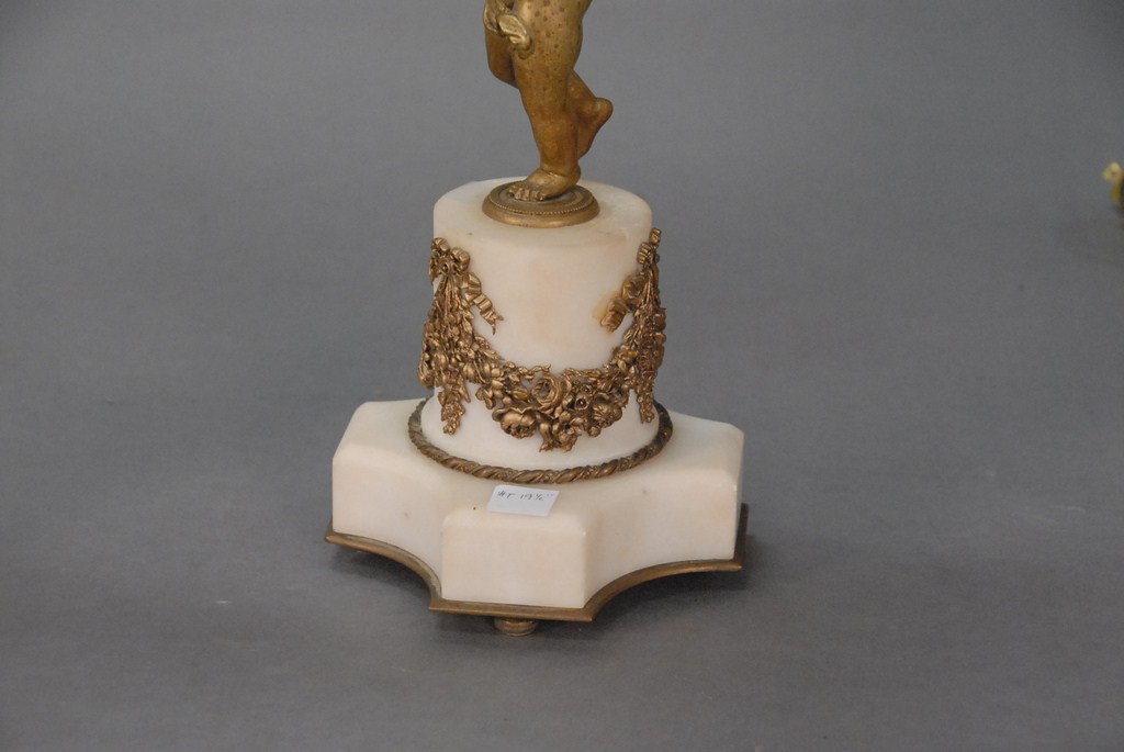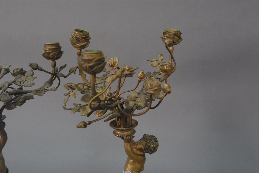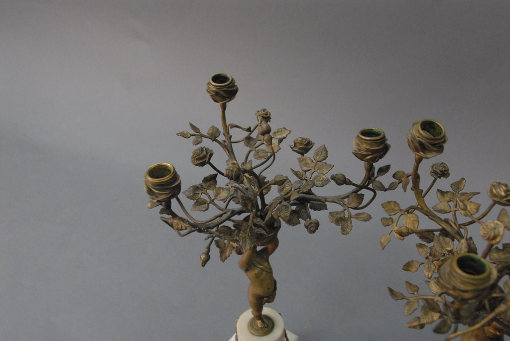 Lot 359: Pair of Louis XV style gilt bronze three arm candelabra featuring a cupid figure holding aloft the lights and sitting on a marble ba…